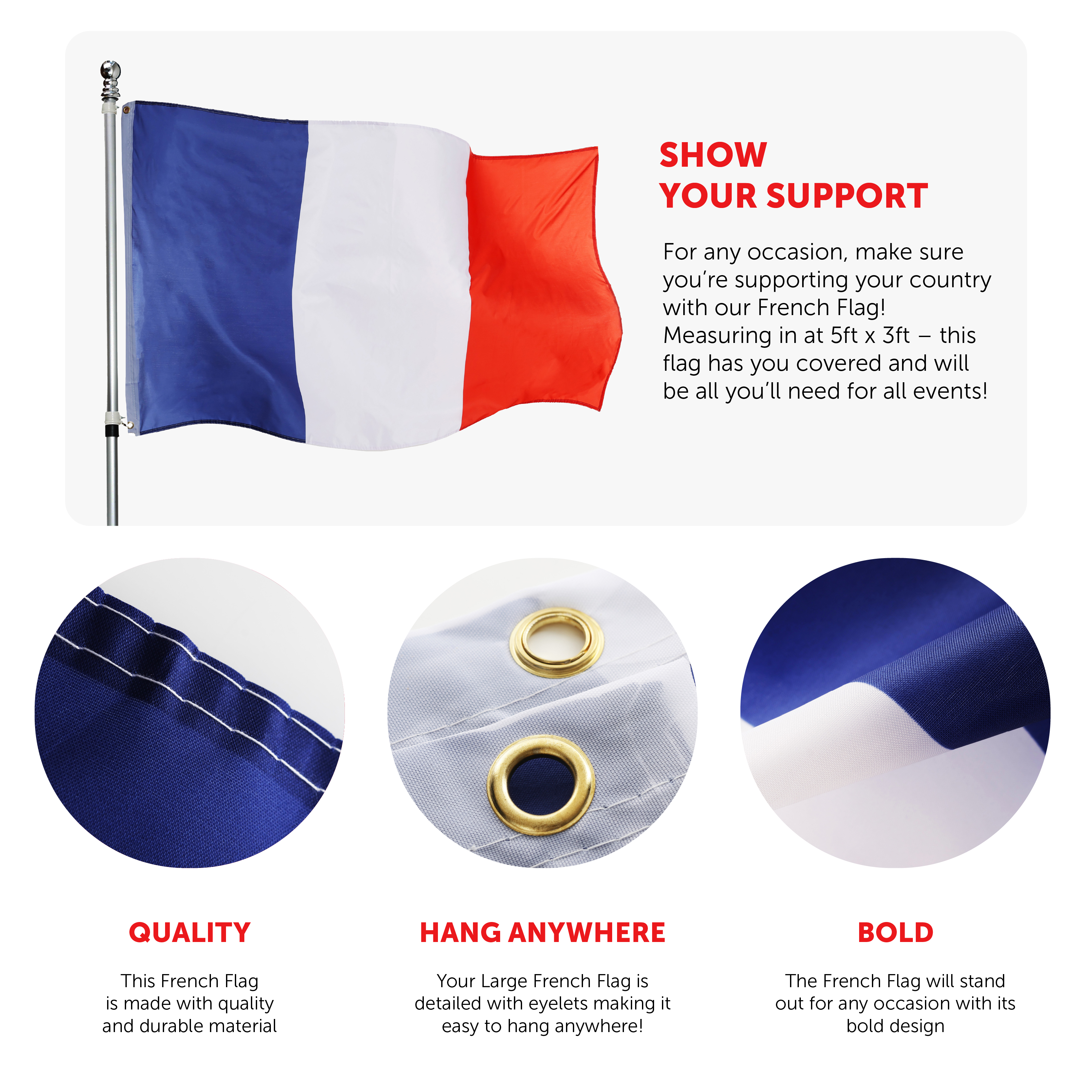 PERFECT FOR ANY FRENCH EVENT: For any French event or occasion, make sure you're picking up a 5ft x 3ft French Flag for a day of support and celebration alongside family and friends!