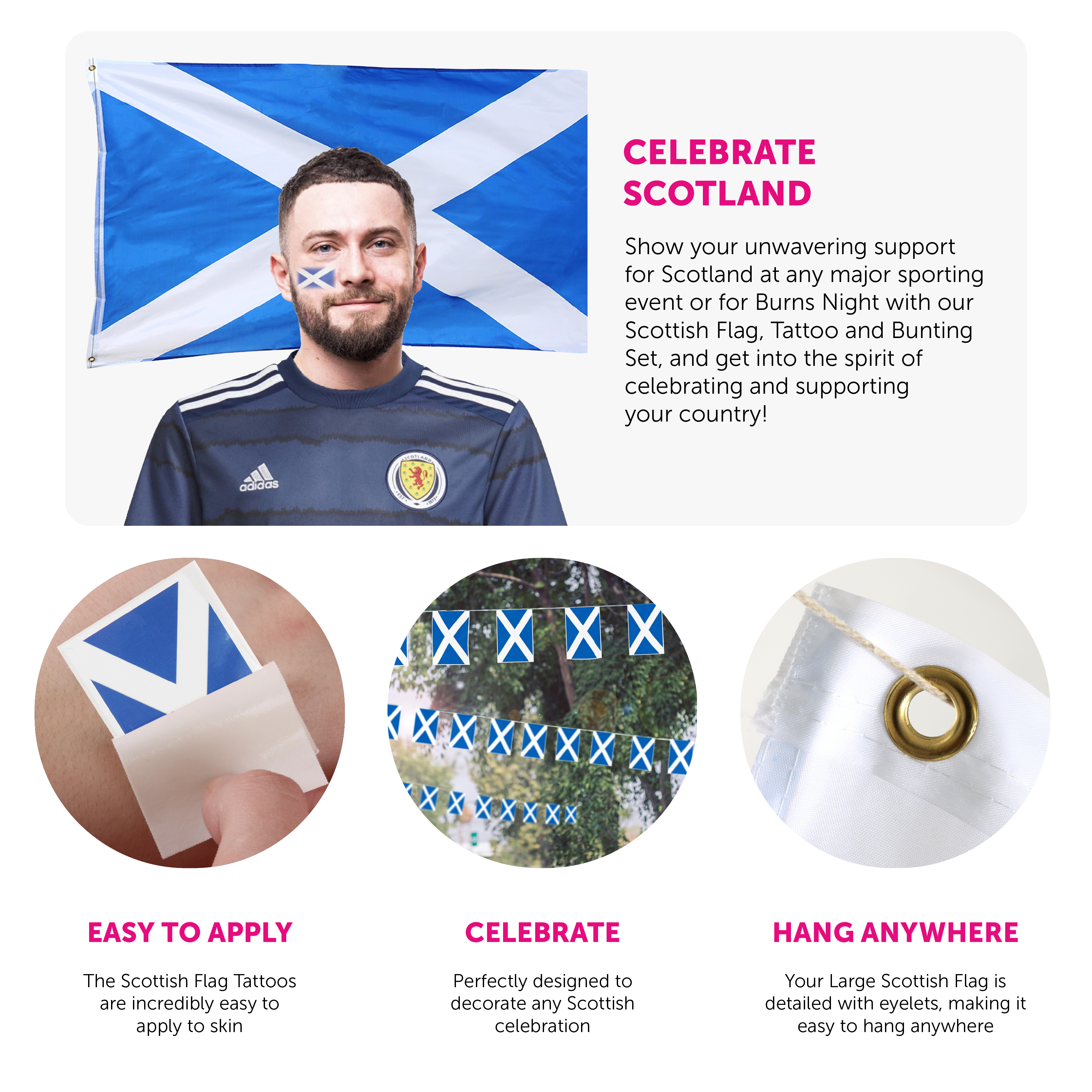 5FT X 3FT SCOTTISH FLAG, TEMPORARY TATTOOS & BUNTING SET: Show your unwavering support for Scotland at any major sporting event or for Burns Night with our Scottish Flag, Tattoo and Bunting Set, and get into the spirit of celebrating and supporting your country!