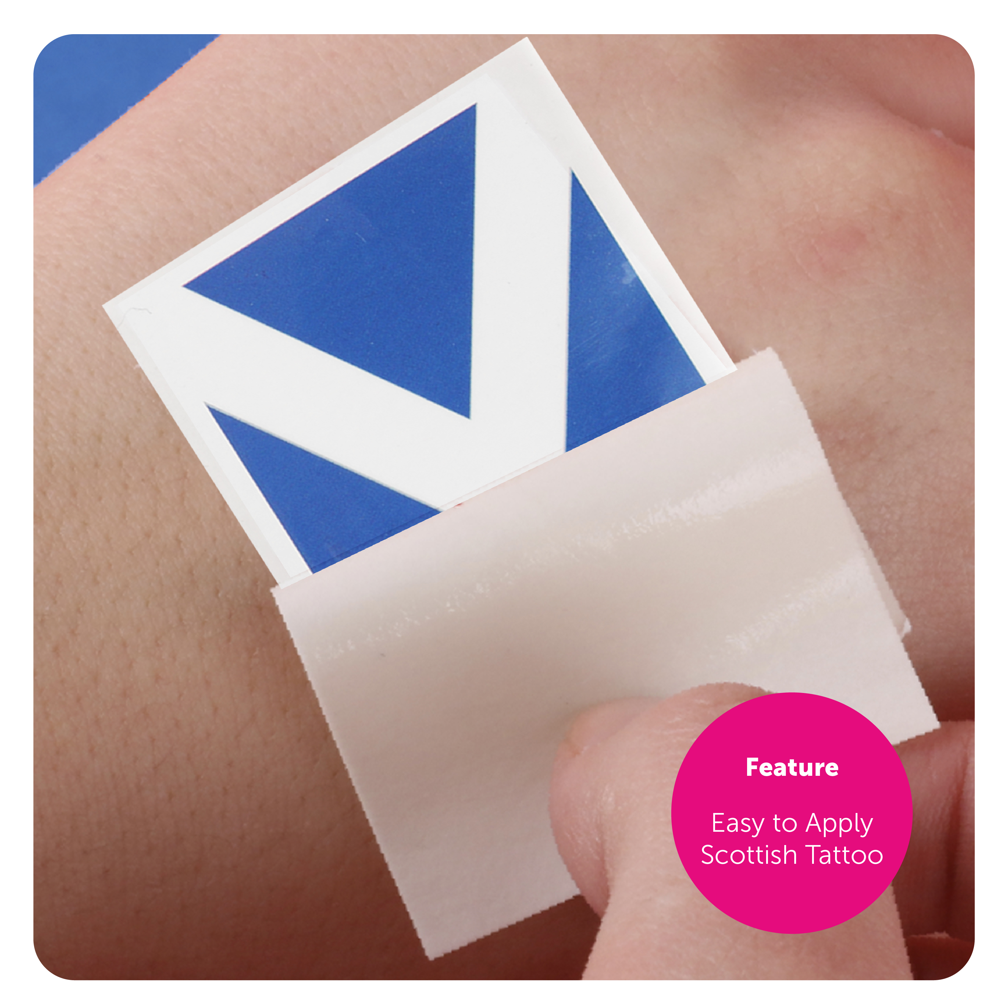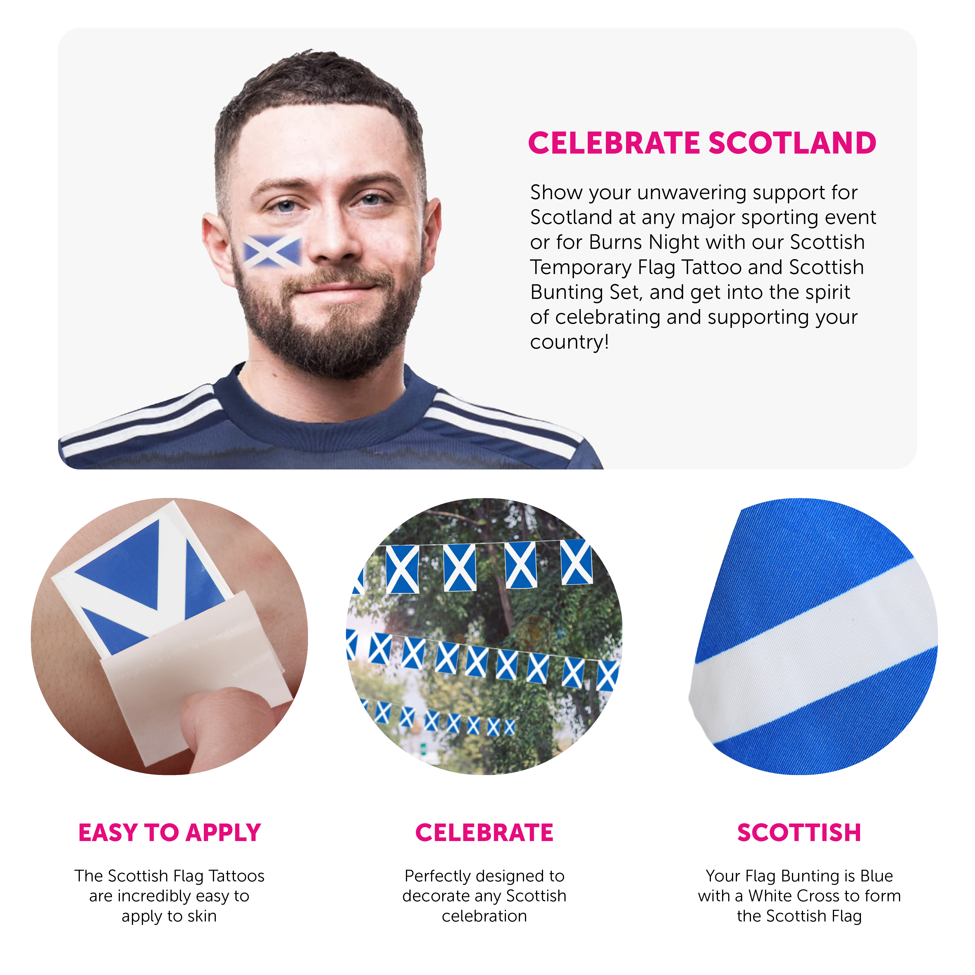 SCOTTISH FLAG TATTOO & SCOTTISH BUNTING SET: Show your unwavering support for Scotland at any major sporting event or for Burns Night with our Scottish Temporary Flag Tattoo and Scottish Bunting Set, and get into the spirit of celebrating and supporting your country!