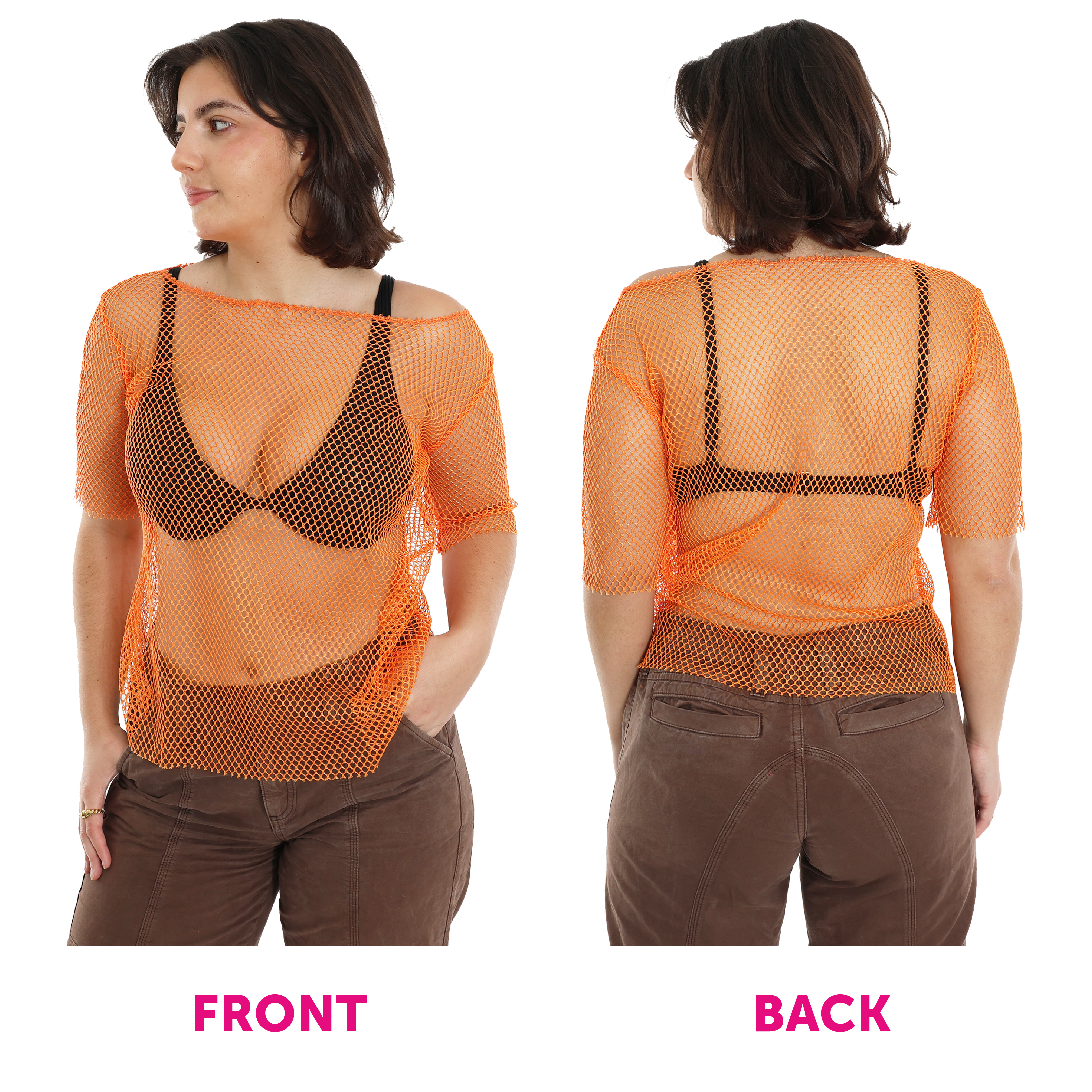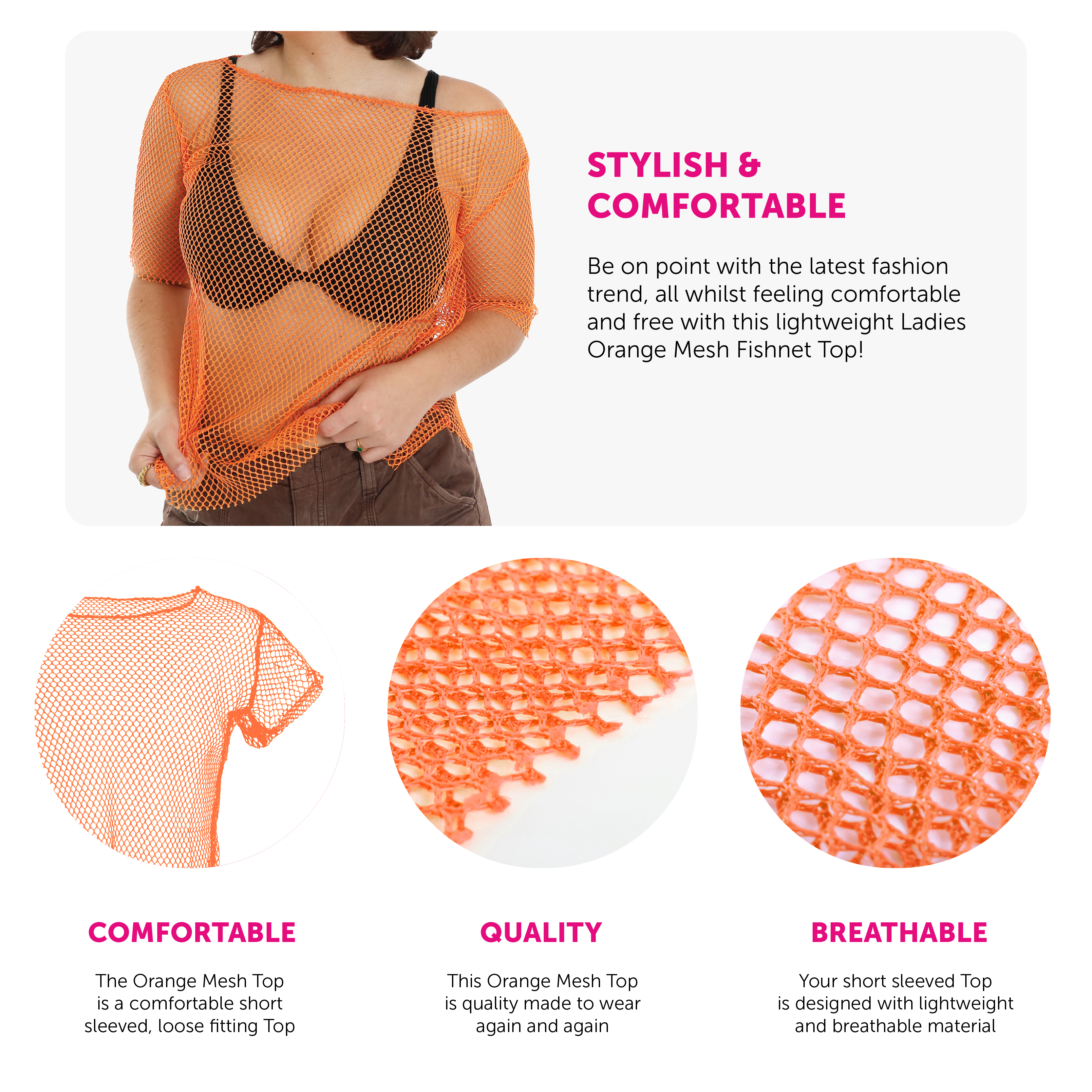 TOP DETAILS: This Ladies Fishnet Top is a short sleeved, bright Orange Mesh Top, a lightweight piece of clothing, great street wear fashion and perfect for festivals!
