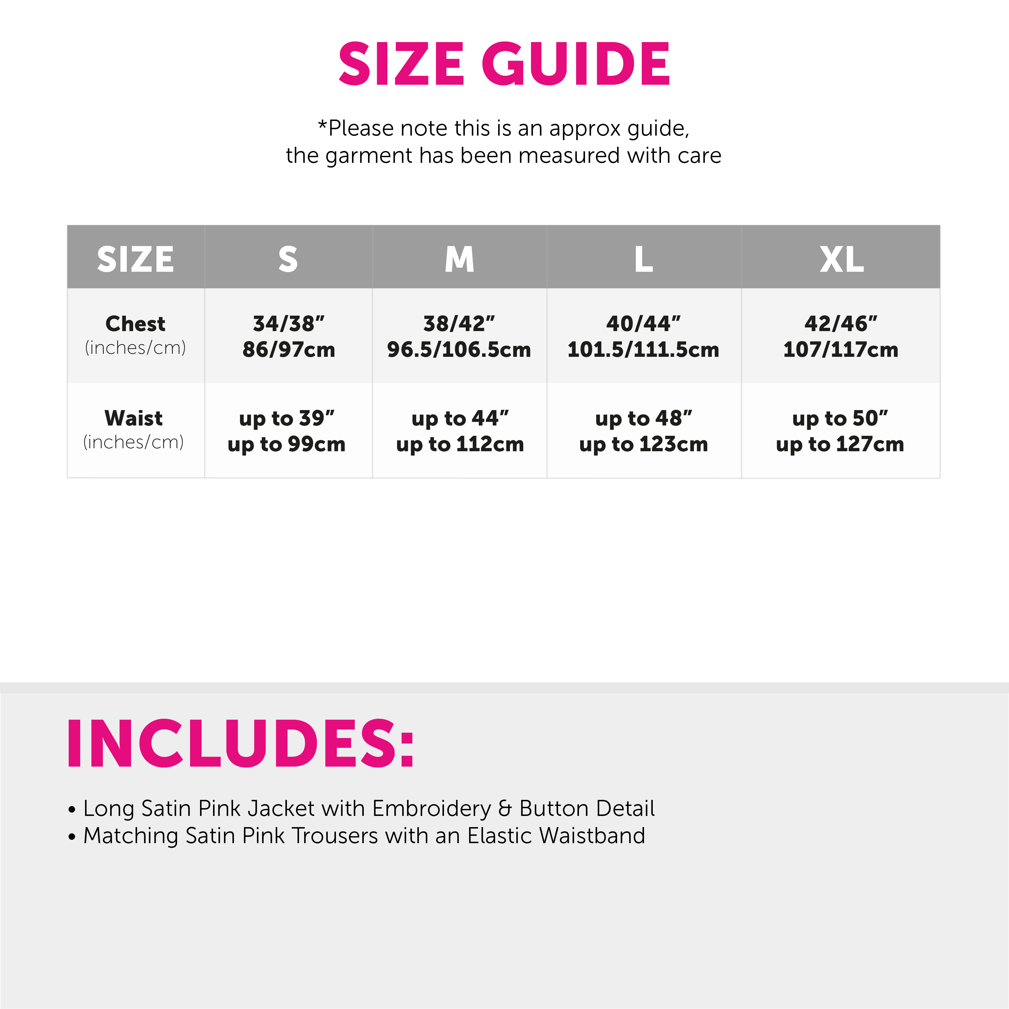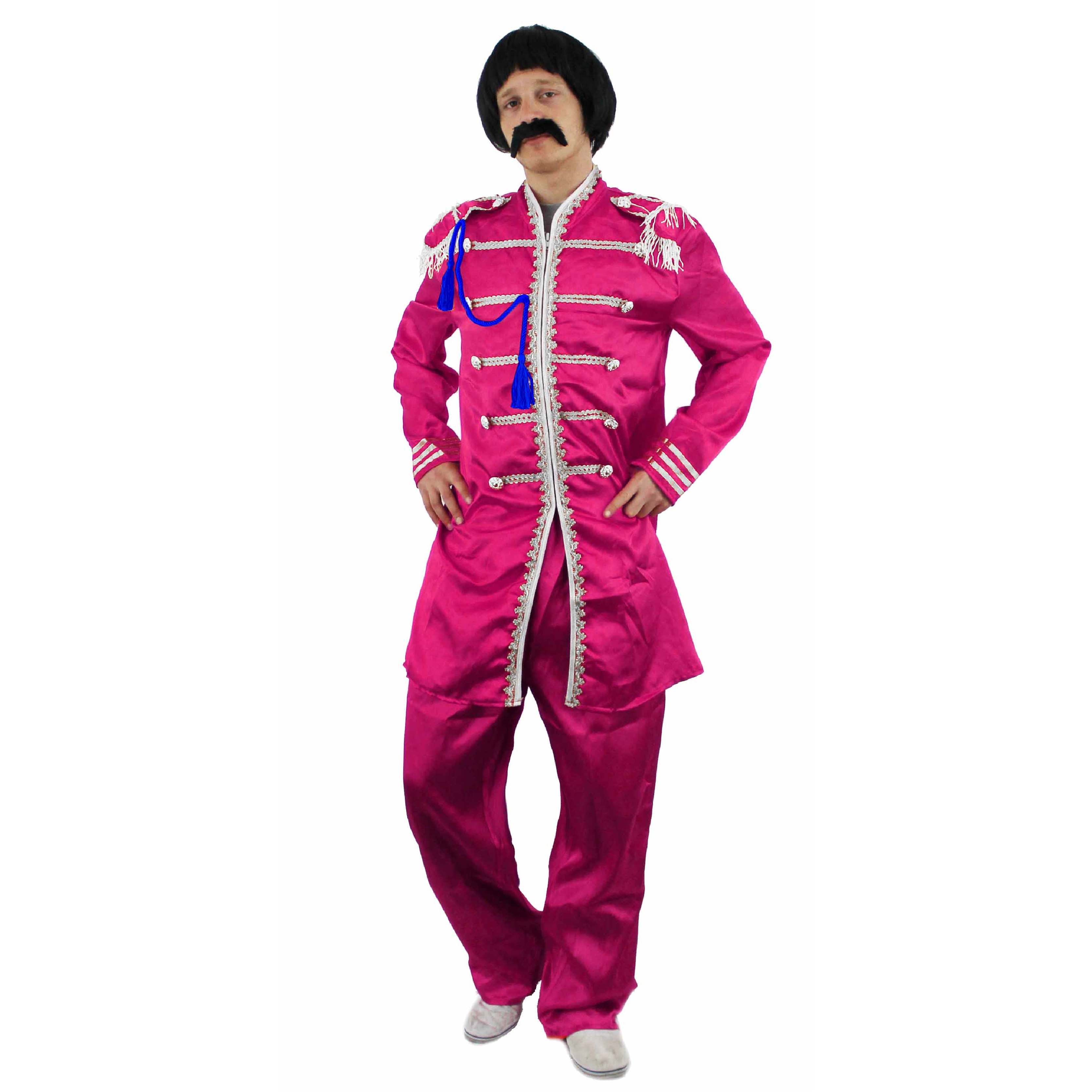 COSTUME INCLUDES: Your Adults Sergeant Pepper Costume is a Long Satin Hot Pink coloured Jacket with Braiding and Button details, and matching Pink Trousers with an elasticated waistband, the perfect Costume for music themed fancy dress events!