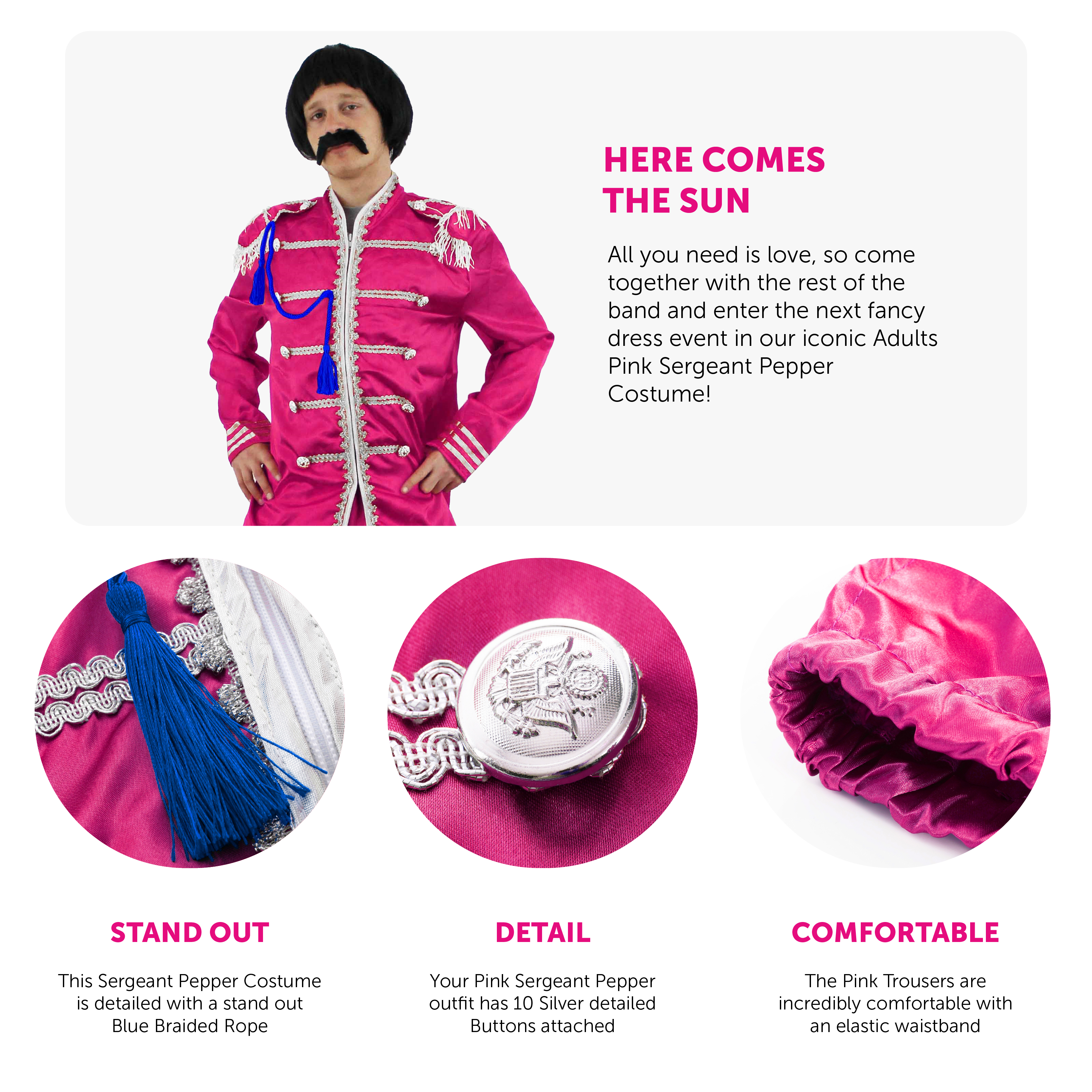 PERFECT FOR 1960'S & MUSIC THEMED EVENTS: Whether you're looking for the perfect look for an upcoming 1960's themed party, or want to get the band together for an iconic quartet Costume idea, this Adults Pink Sergeant Pepper Costume is perfect for you!