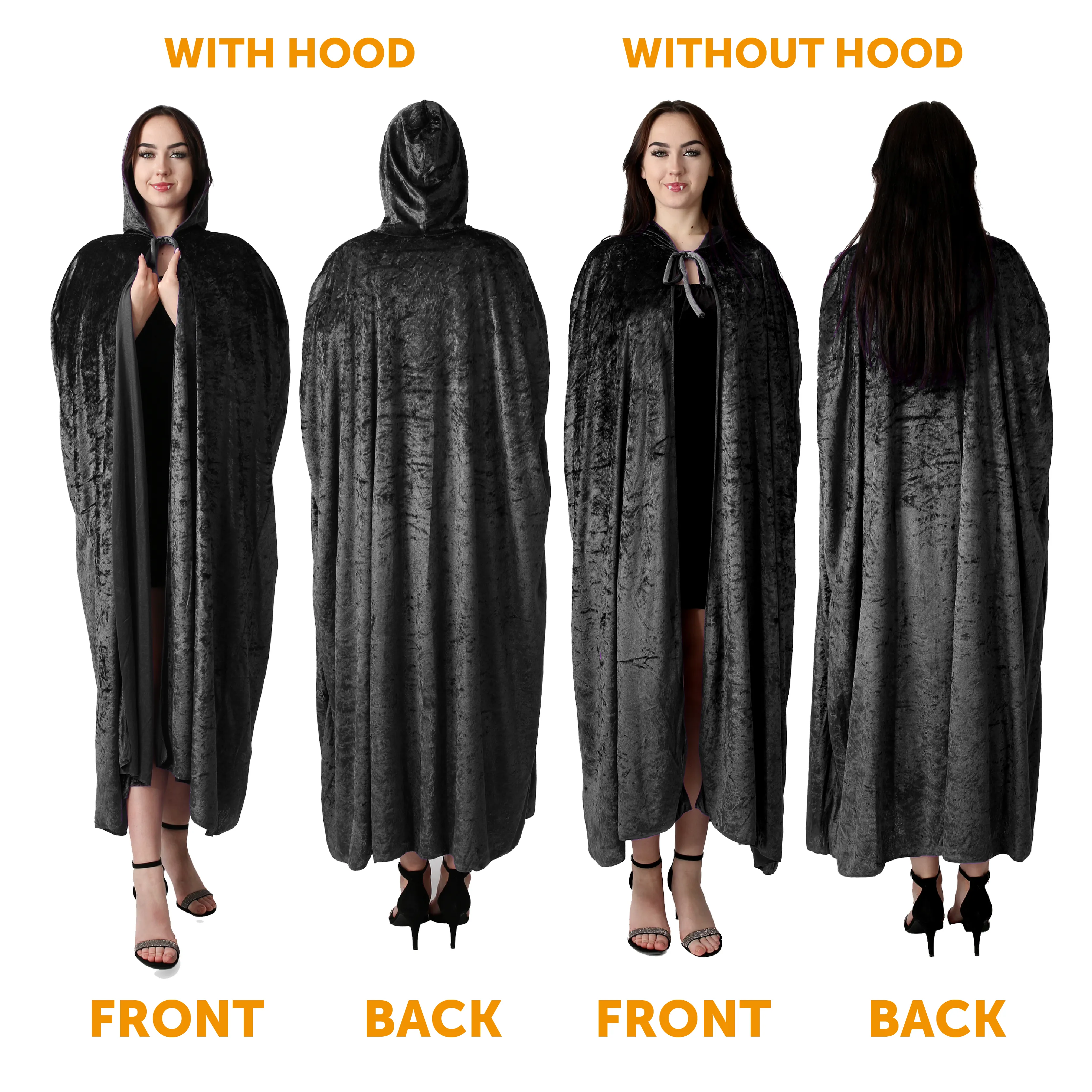 • Shroud yourself in darkness with a calf-length black velour cape featuring a hood.