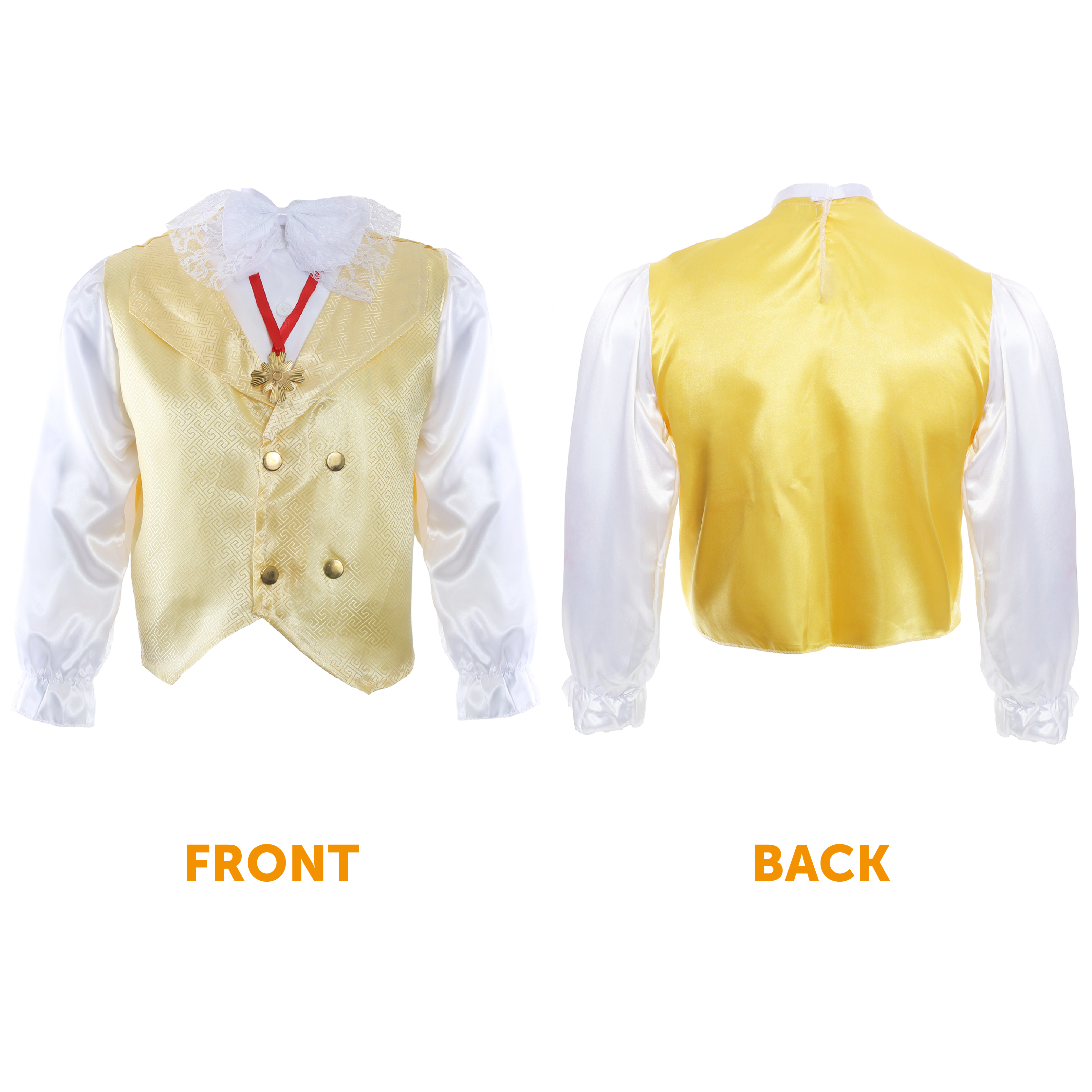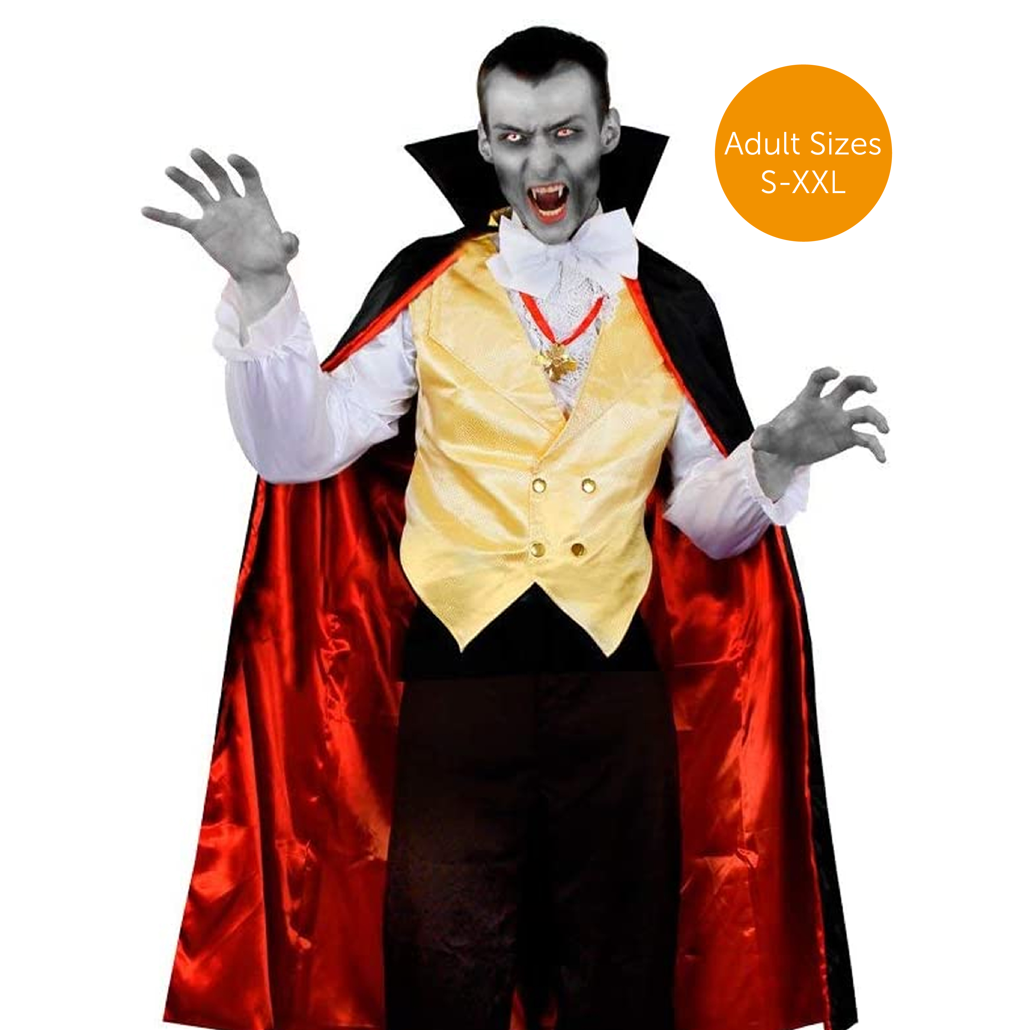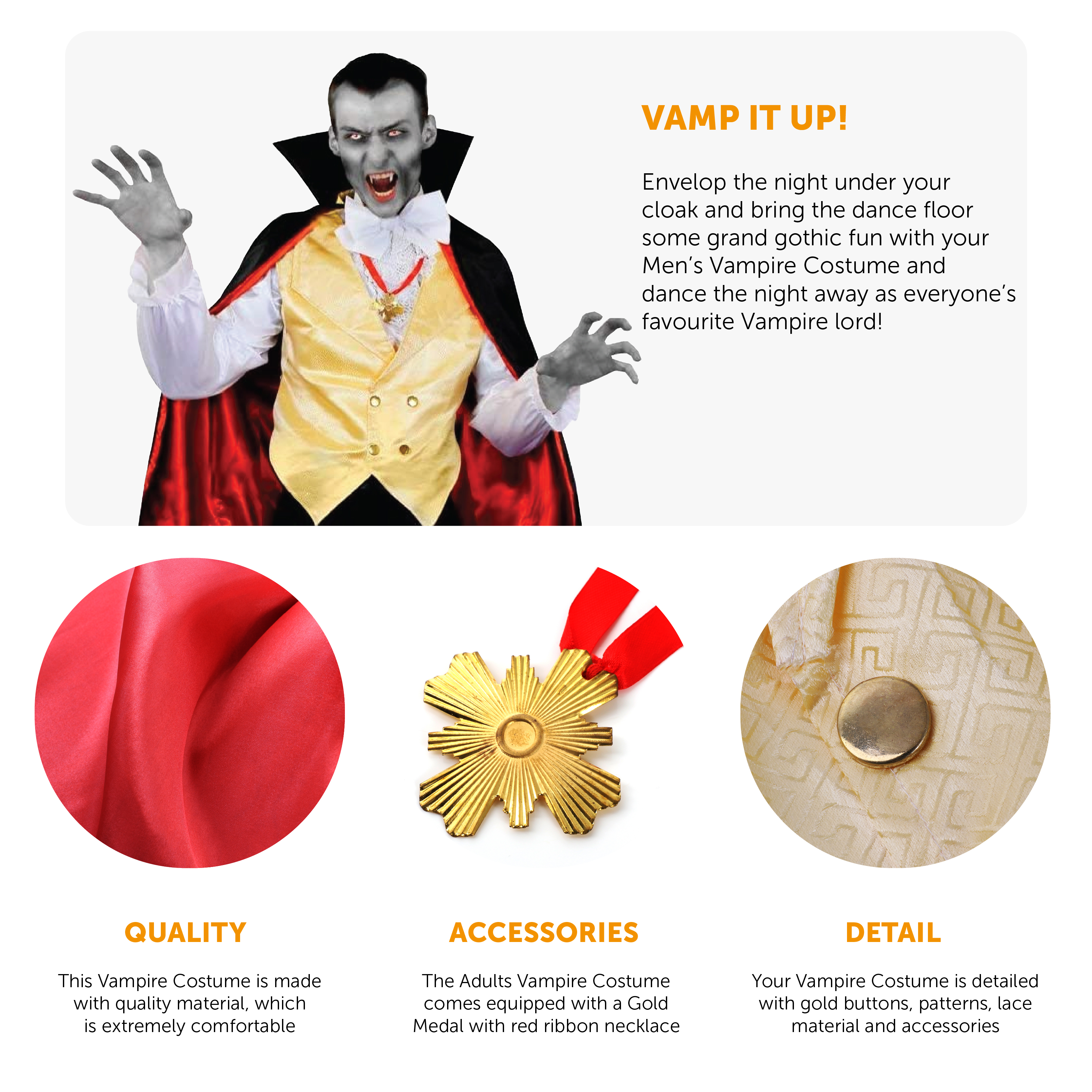 COSTUME INCLUDES: Your Men’s Vampire Costume includes a Gold Waistcoat with White Shirt, a Medal with a Red Necklace, a White Bow Tie, and a Black Collared Cape with a Red interior!