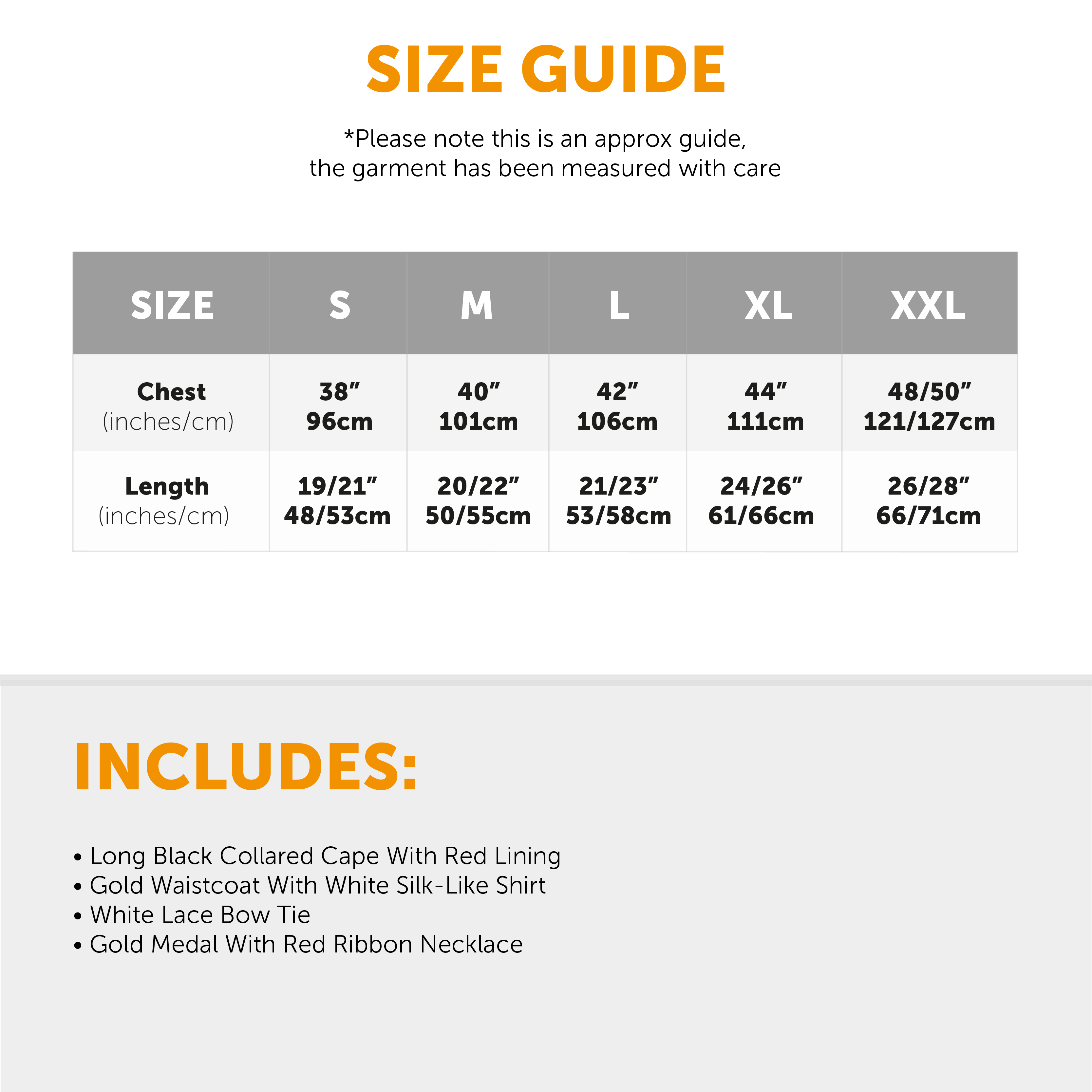 AVAILABLE IN MULTIPLE SIZES: Your Men’s Vampire Costume is available in multiple sizes from Small to XX-Large: Small - 38” Chest – 19/21” Length |Medium - 40” Chest – 20/22” Length |Large - 42” Chest – 21/23” Length | X-Large – 44” Chest – 24/26” | XX-Large – 48/50” Chest – 26/28”