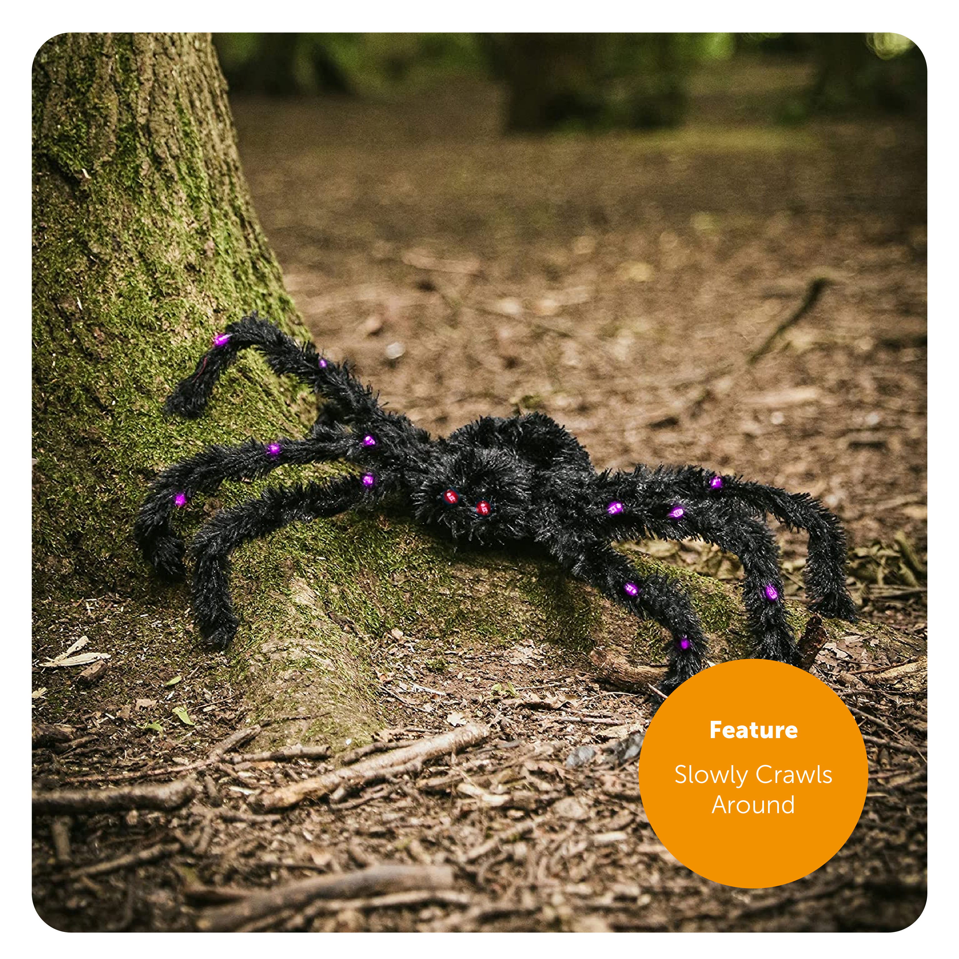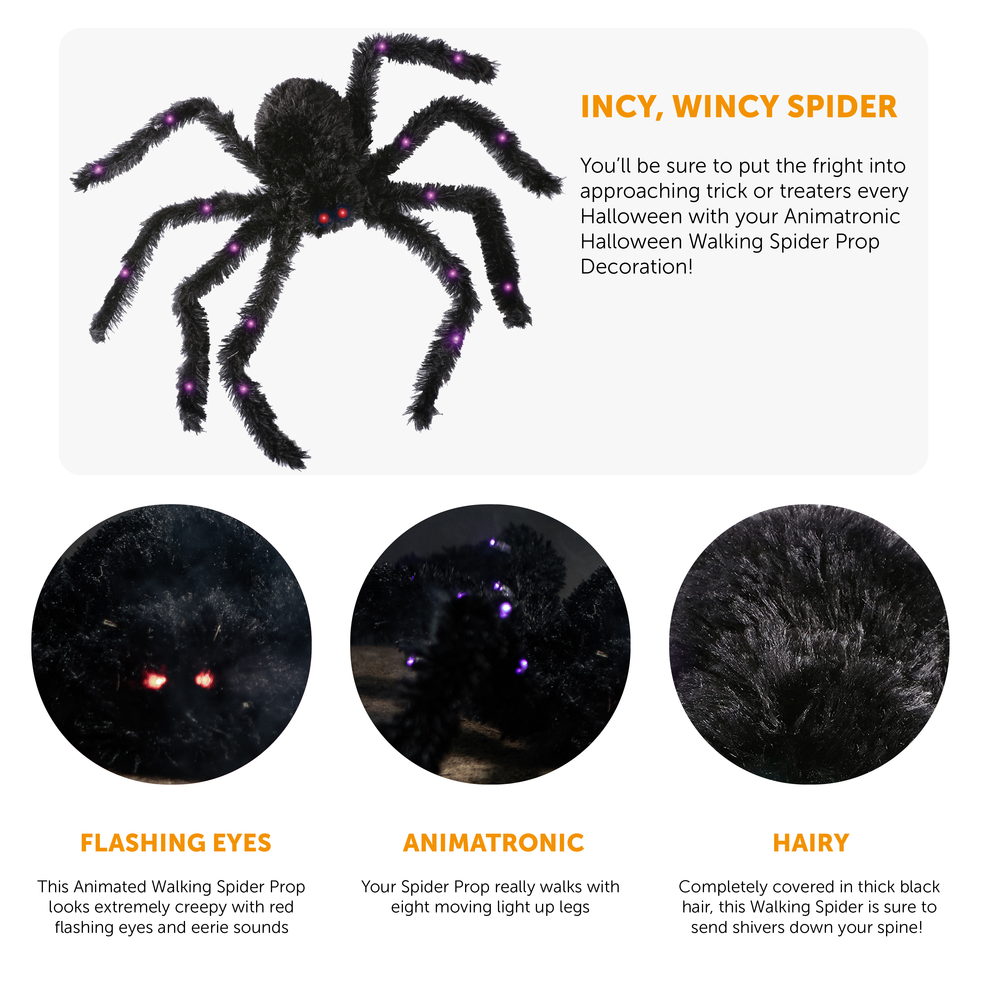 ANIMATRONIC WALKING SPIDER PROP FEATURES: Your Walking Spider Animated Prop Decoration has Flashing Eyes and eerie sounds to really spook your Halloween visitors! Comes with 3 AA batteries