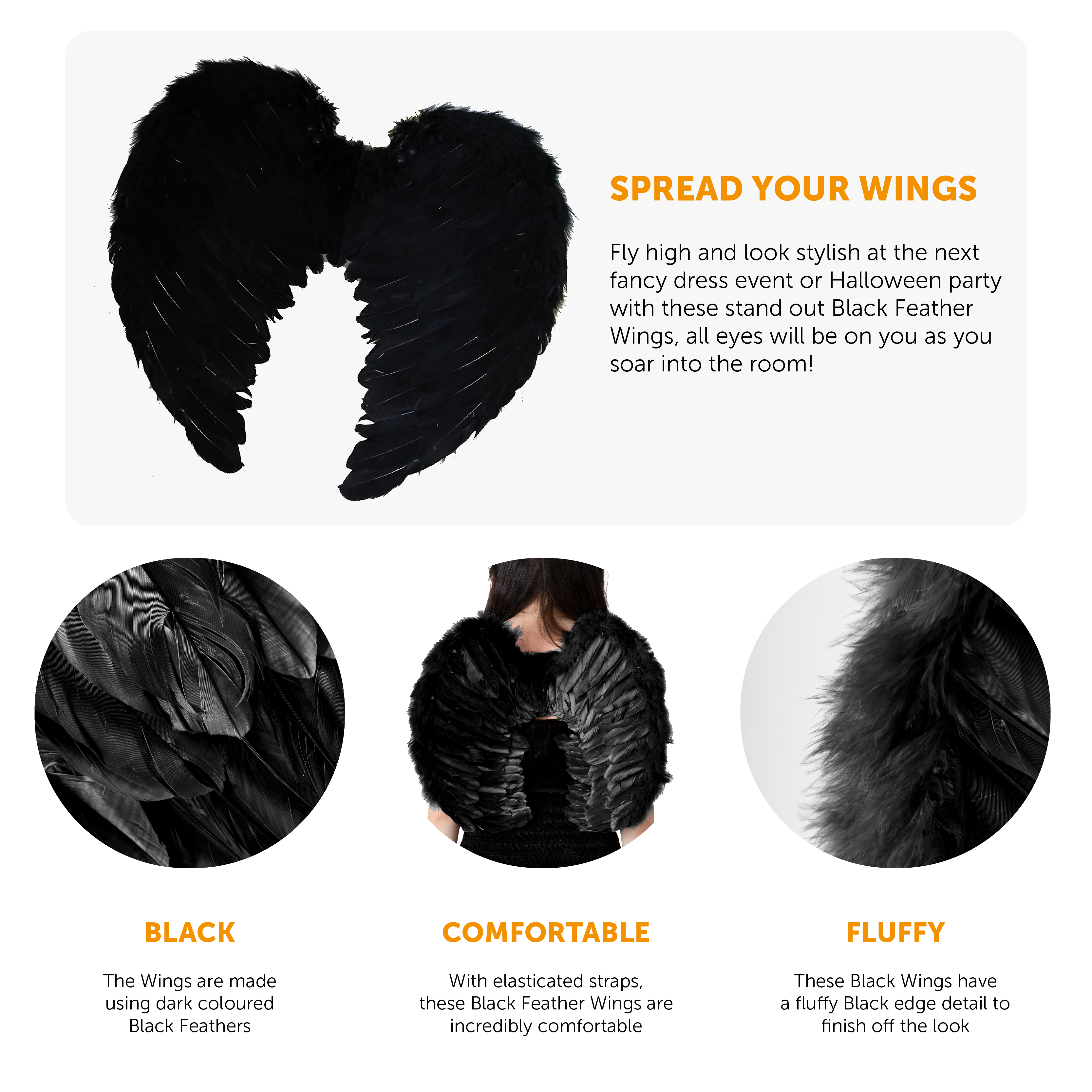 PERFECT FOR HALLOWEEN FANCY DRESS: Whether you want to spook the crowd for Halloween, or you are attending a Hen Do or any other fancy dress, be sure to complete the look with our Black Feather Wings!