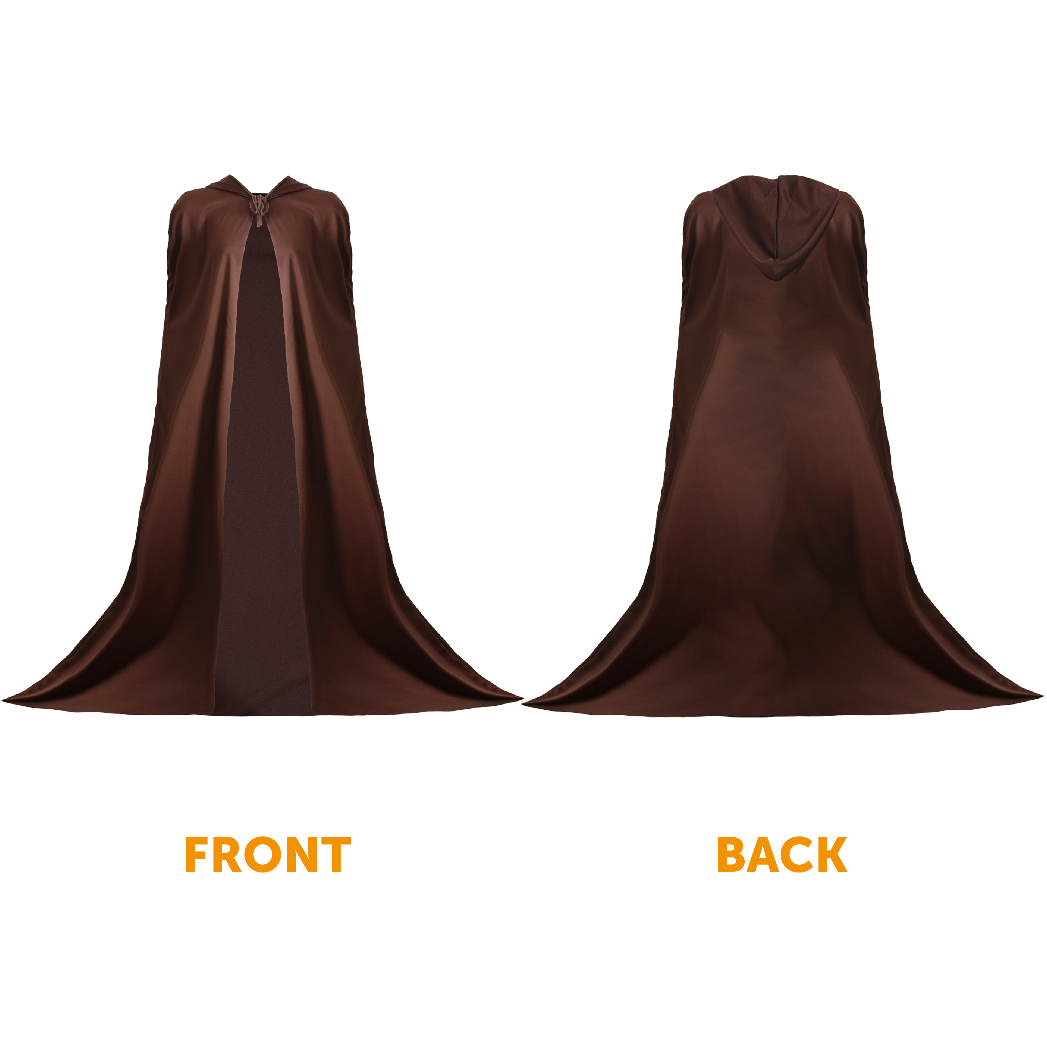 ADULTS LONG CAPE DETAILS: Your Adults Brown Cape is a long, calve-length cape, with an attached hood on the cape, and a Brown drawstring to tie the cape across your neck comfortably!