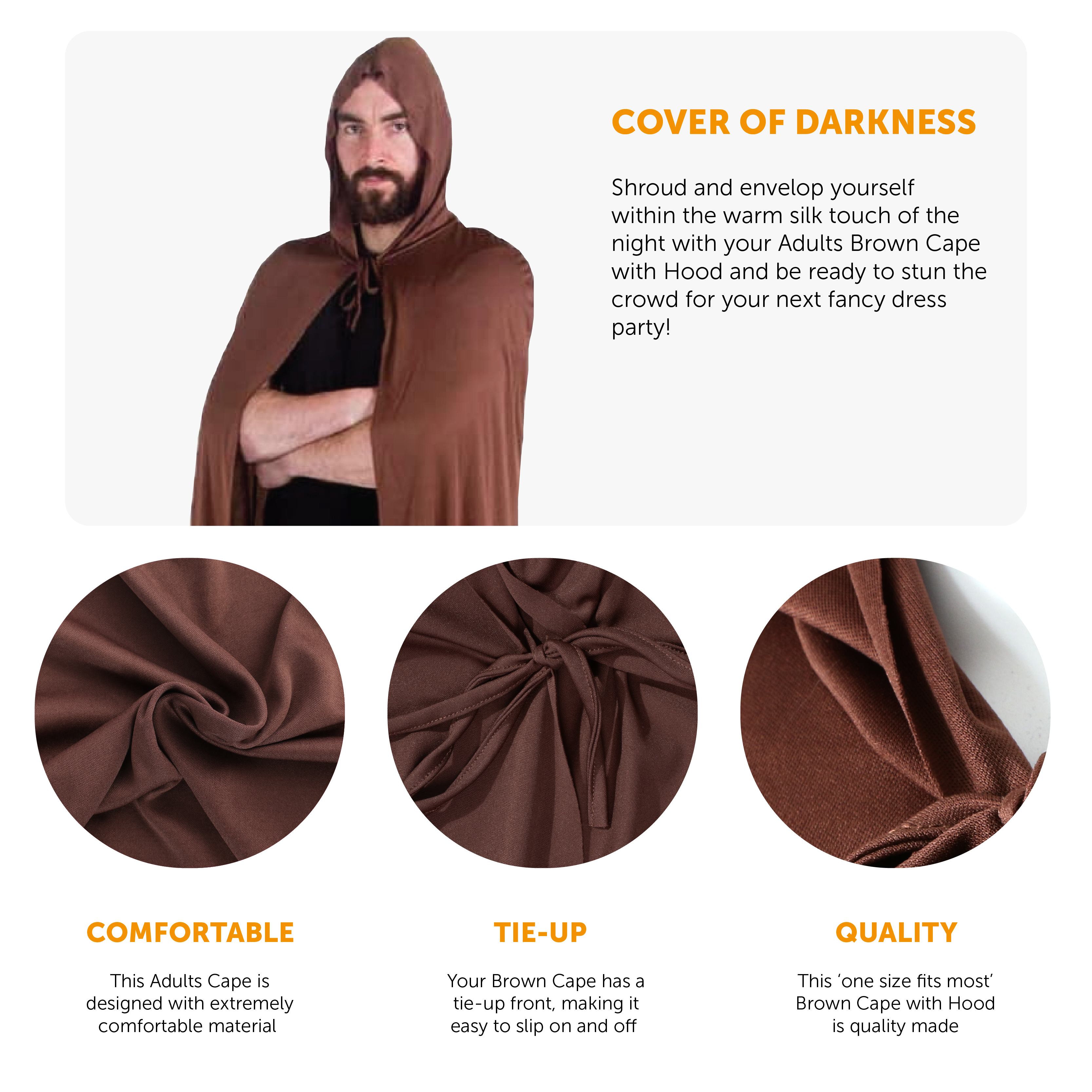 ONE SIZE FITS ALL ADULTS: Regardless of your height or size, our Adults Brown Cape is a suitable and perfect size for any adult to wear comfortably throughout the night and day for their fancy dress parties and events!