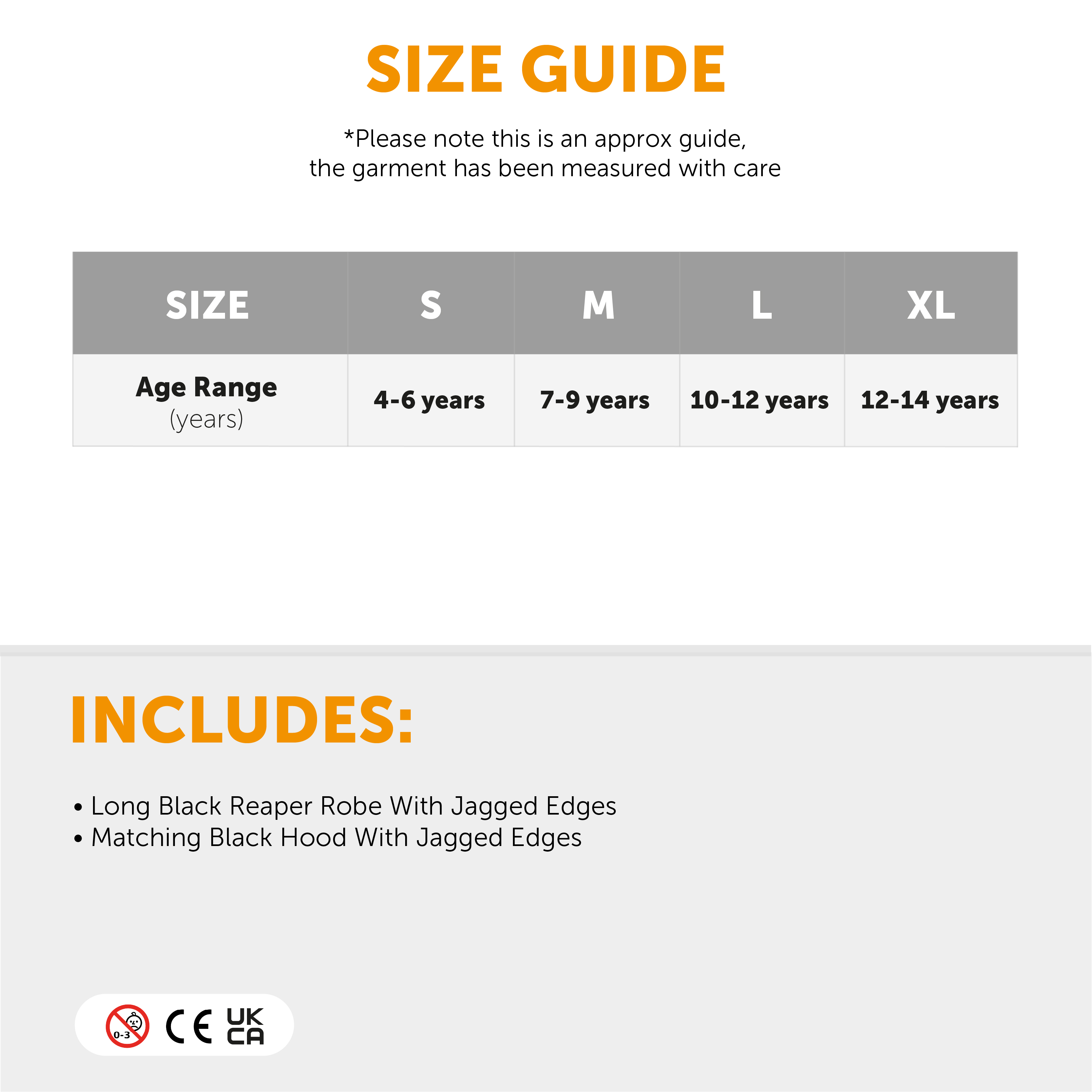 AVAILABLE IN MULTIPLE SIZES: Your Childs Reaper Costumes are available in multiple sizes from Small to X-Large: Small - 4/6 Years - Medium - 7/9 Years - Large -10/12 Years - X-Large - 12/14 Years