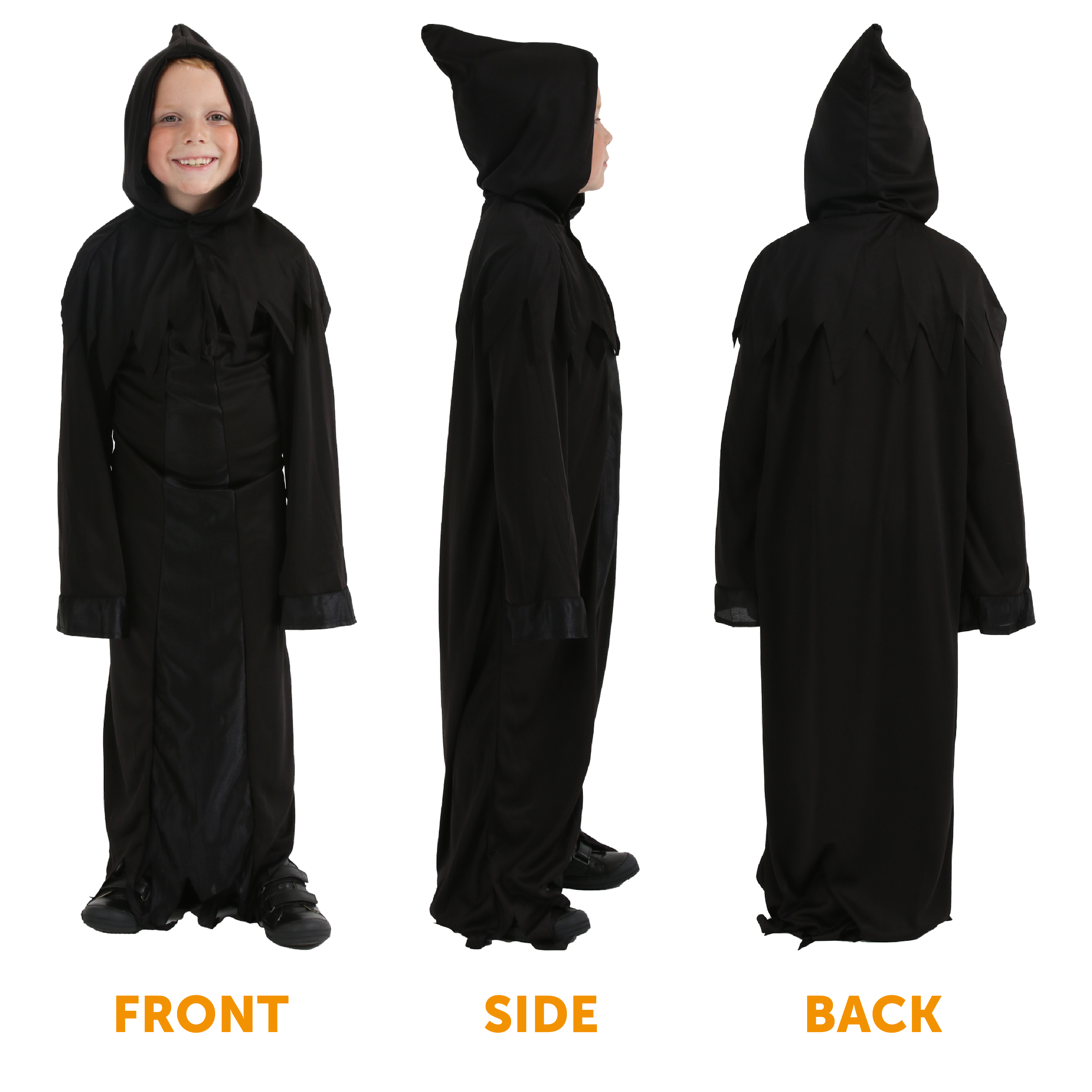 REAPER COSTUME DETAILS: Your Child Reaper Costume includes a Black Ragged Reaper Robe with a Separate Matching Black Hood, a ghoulish and ghostly robe and hood to complete your Reapers appearance