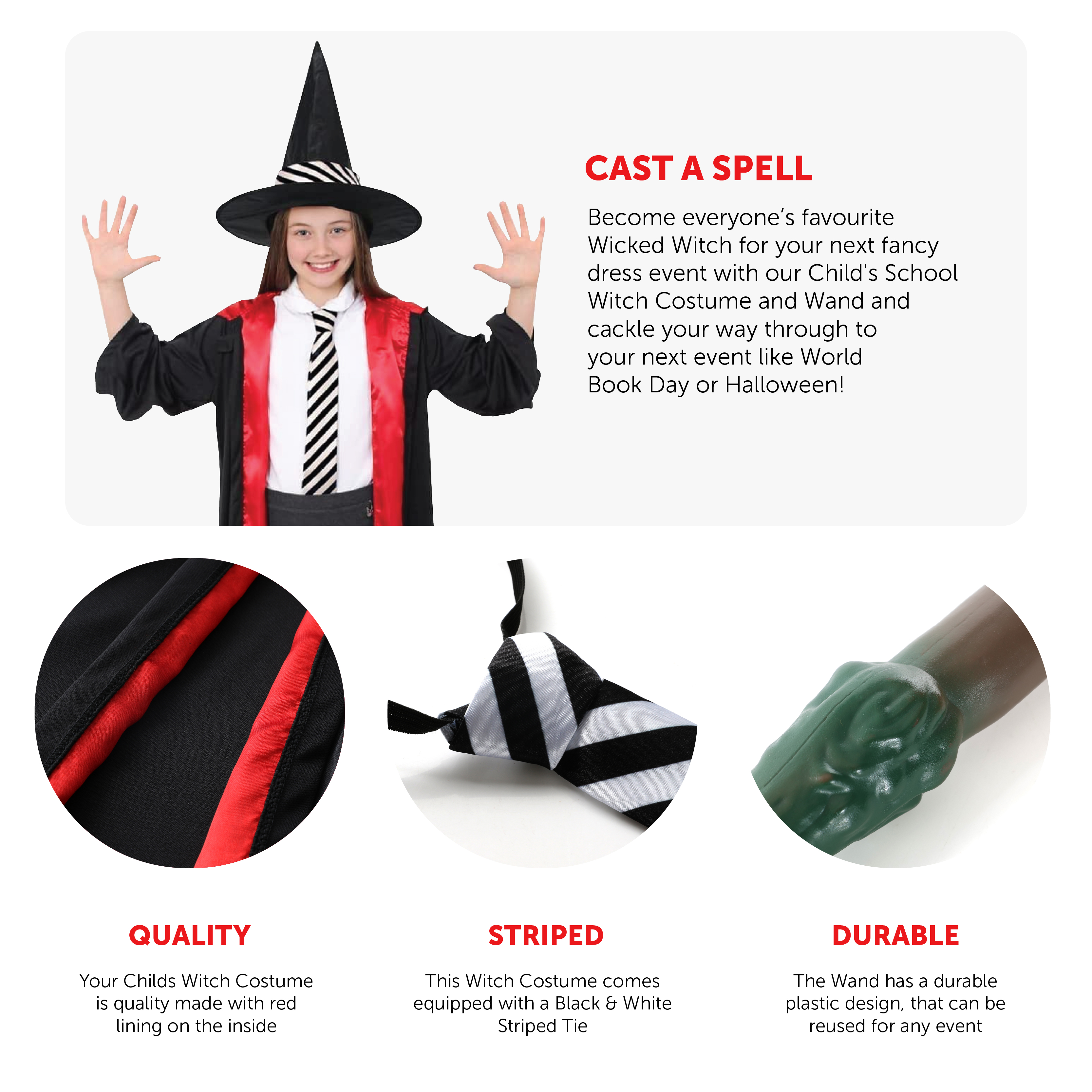 CHILD'S SCHOOL WITCH COSTUME & WAND: Become everyone’s favourite Wicked Witch for your next fancy dress event with our Child's School Witch Costume and Wand and cackle your way through to your next event like World Book Day or Halloween!