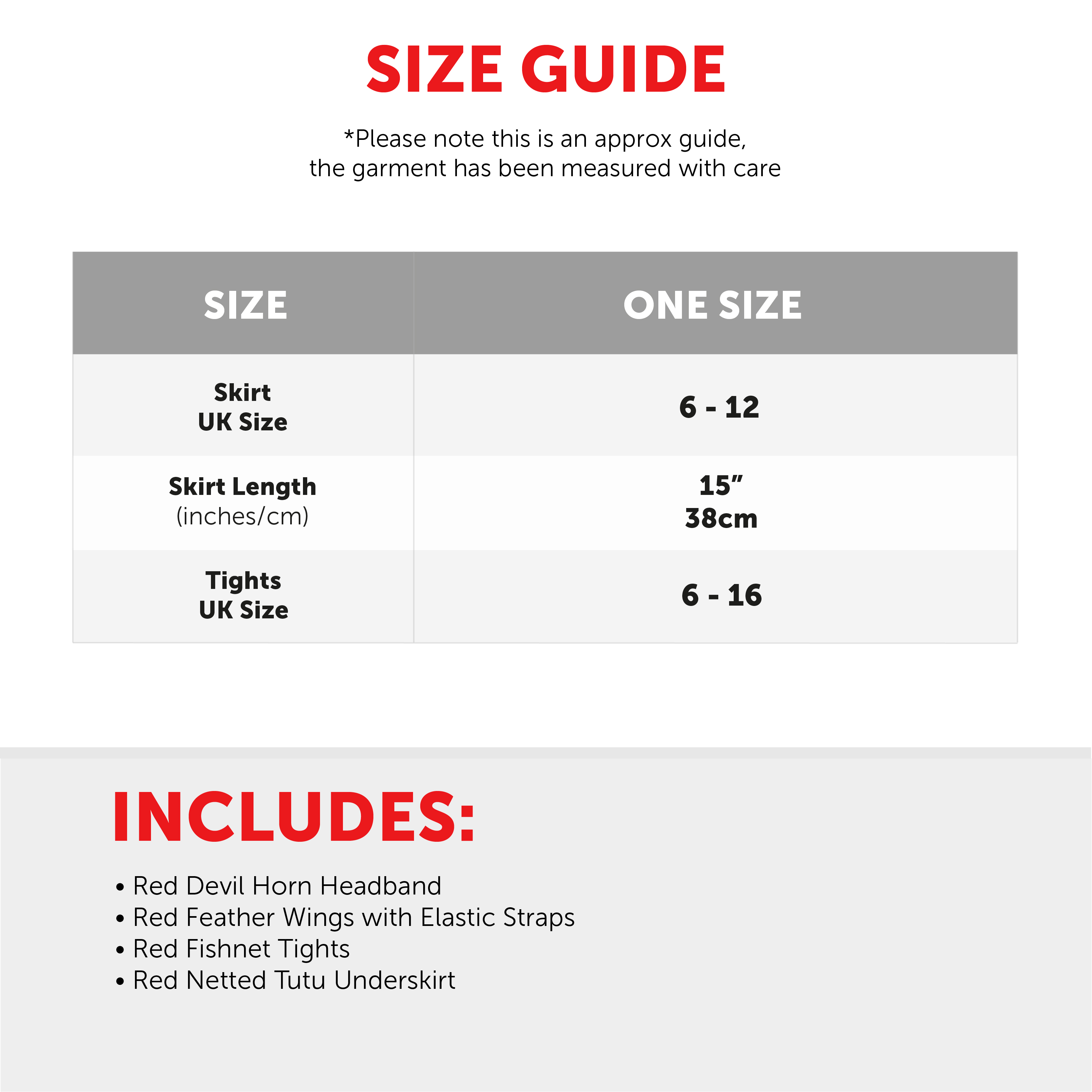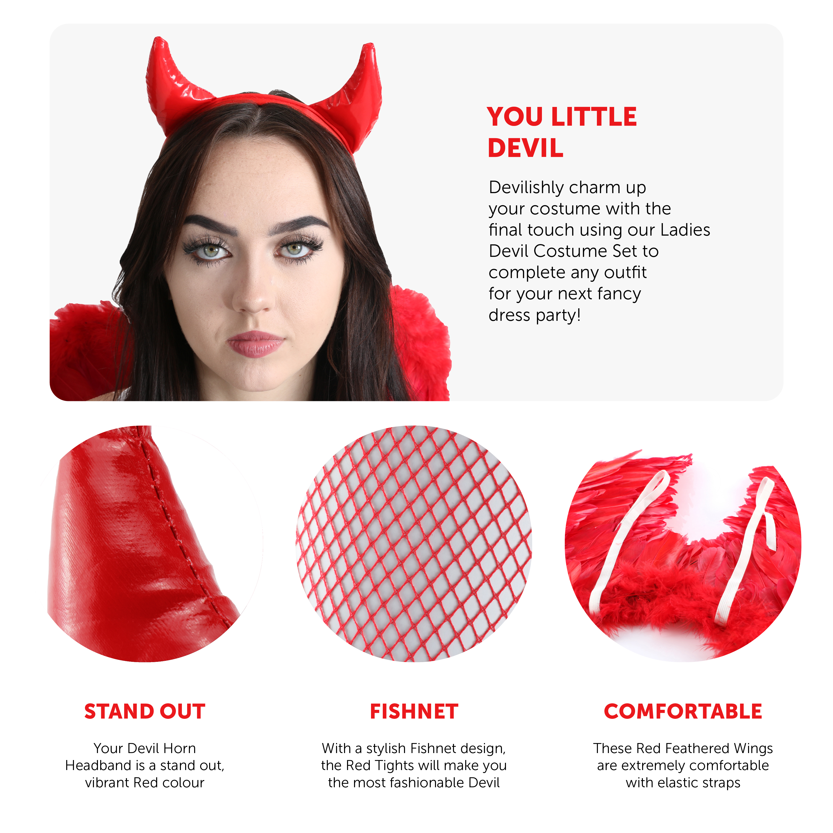 SET INCLUDES: This Devil Set includes a vibrant Red Headband with 2x matching Red Devil Horns attached to the top, Red Feather Wings, Red Fishnet Tights, and a Red Netted Underskirt, perfect for Halloween!