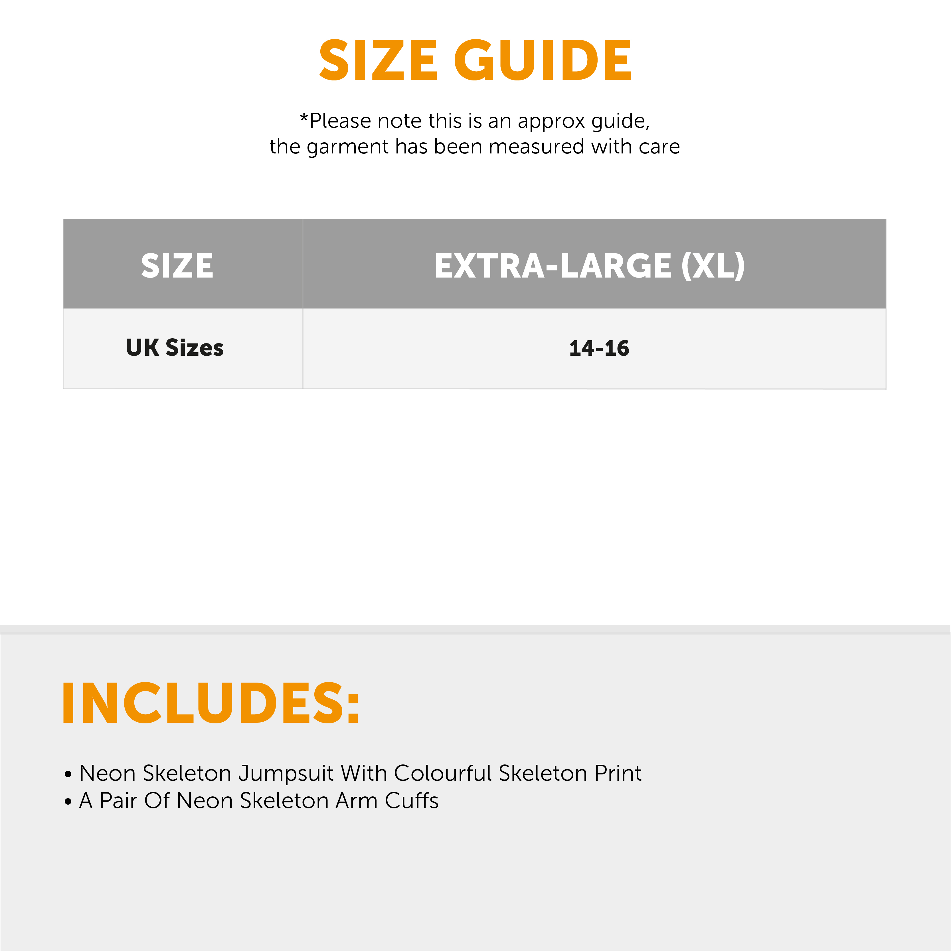 AVAILABLE IN ONE SIZE ONLY: Your Ladies Neon Skeleton Jumpsuit is available in one size only, an X-Large, a perfect and comfortable fit for any Ladies UK 14-16 Size!