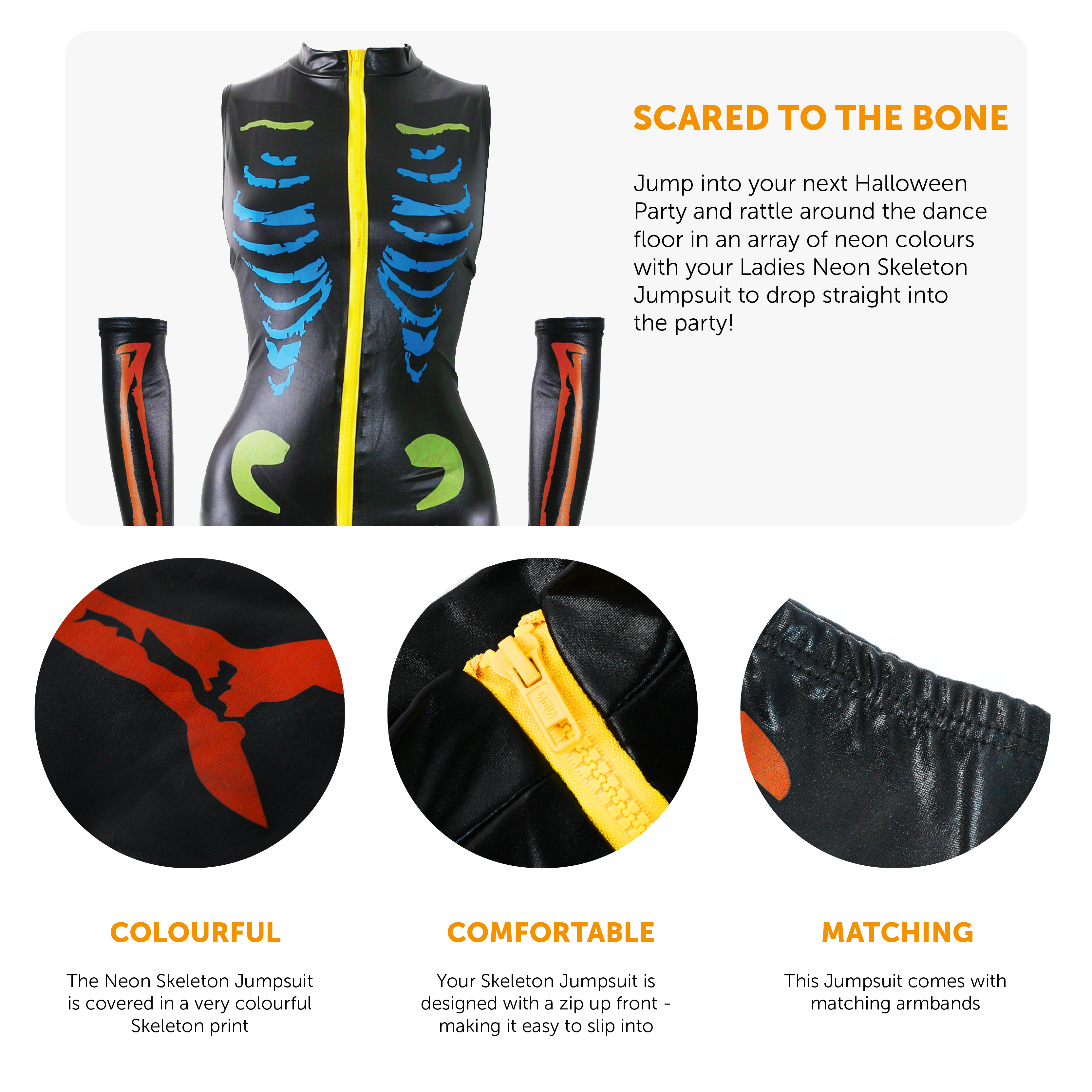 NEON SKELEOTN JUMPSUIT DETAILS: Your Ladies Skeleton Jumpsuit includes a Neon Skeleton Jumpsuit with multiple colours, and a pair of neon skeleton armbands to complete the look!