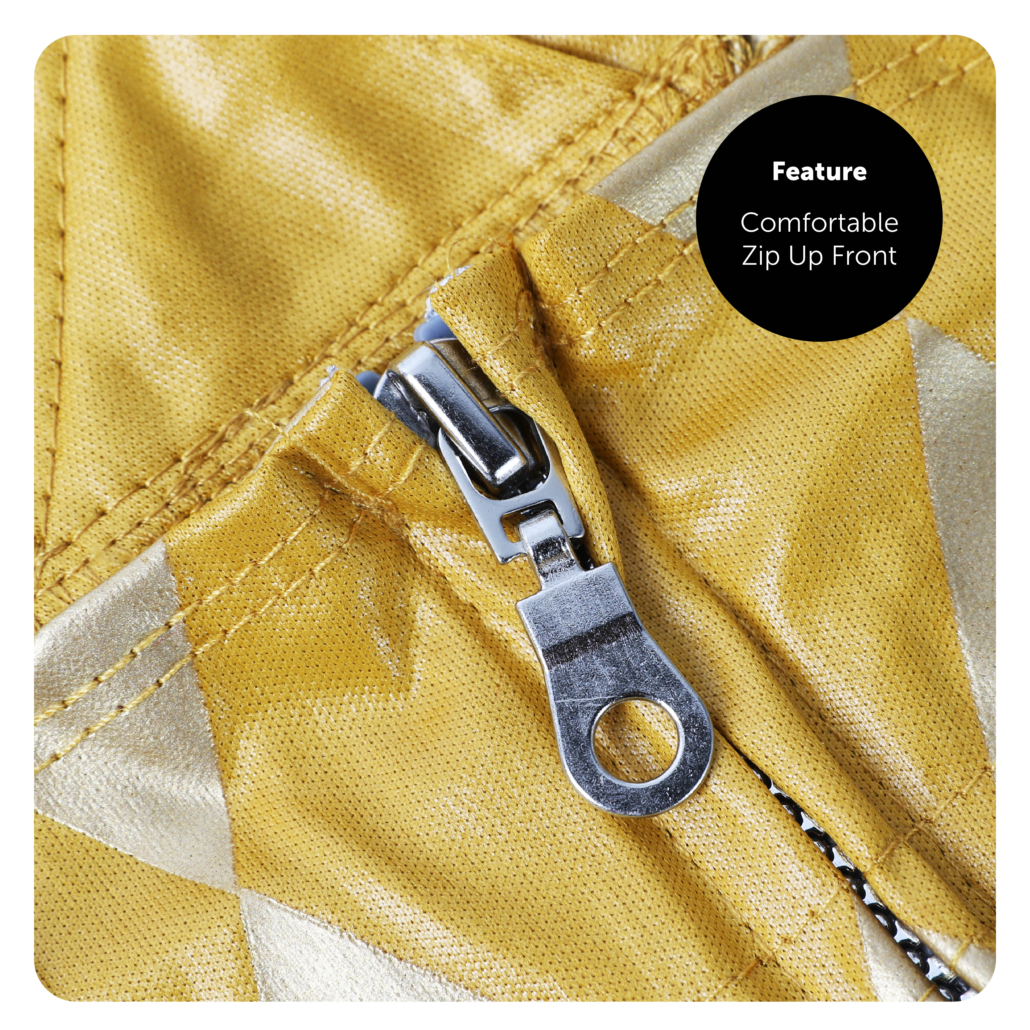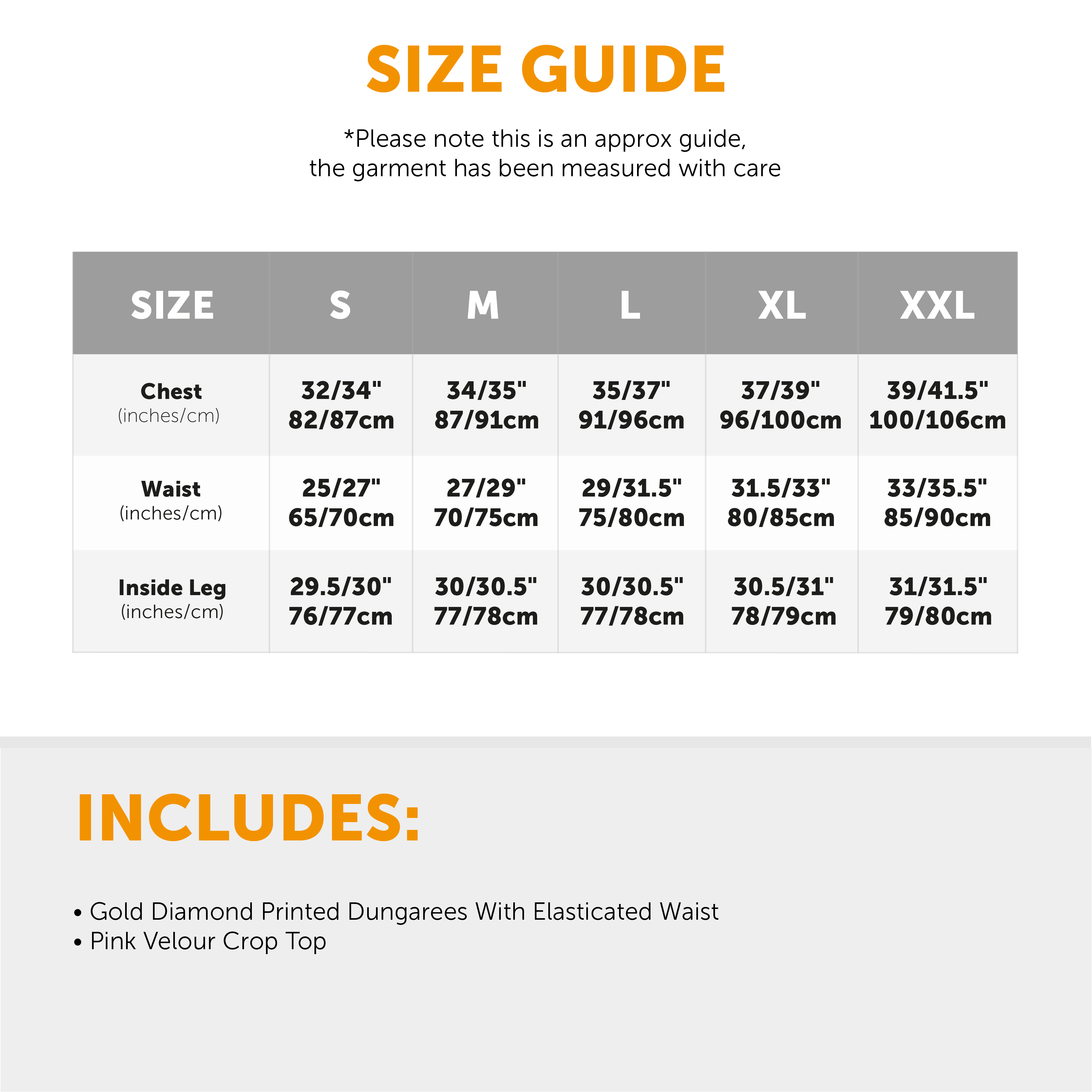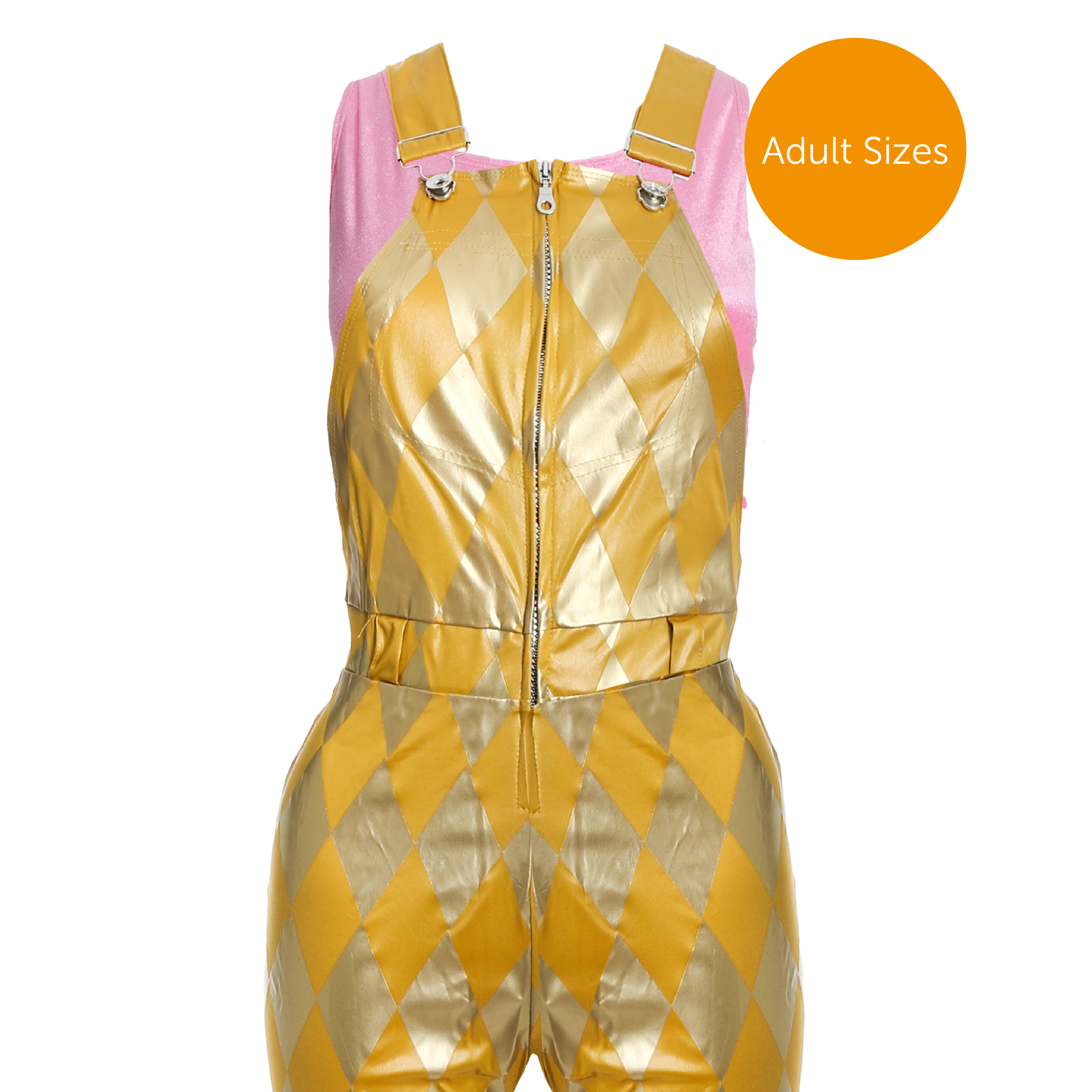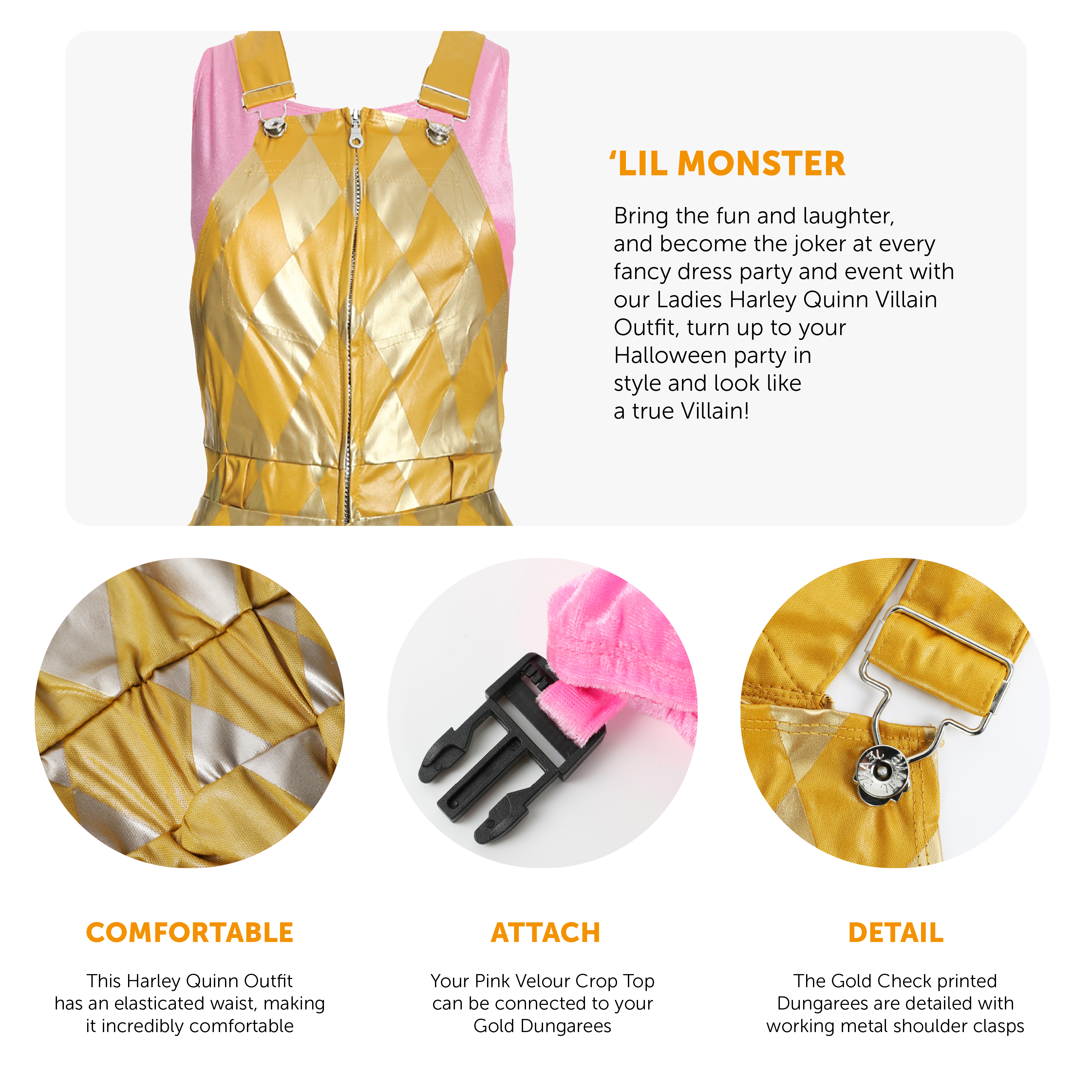 COSTUME DETAILS: Your Ladies Harley Quinn Villain Costume includes a Pink Velour Crop Top, and Yellow/Gold Dungarees with a diamond pattern and zip up front, the perfect Costume for any Halloween event!