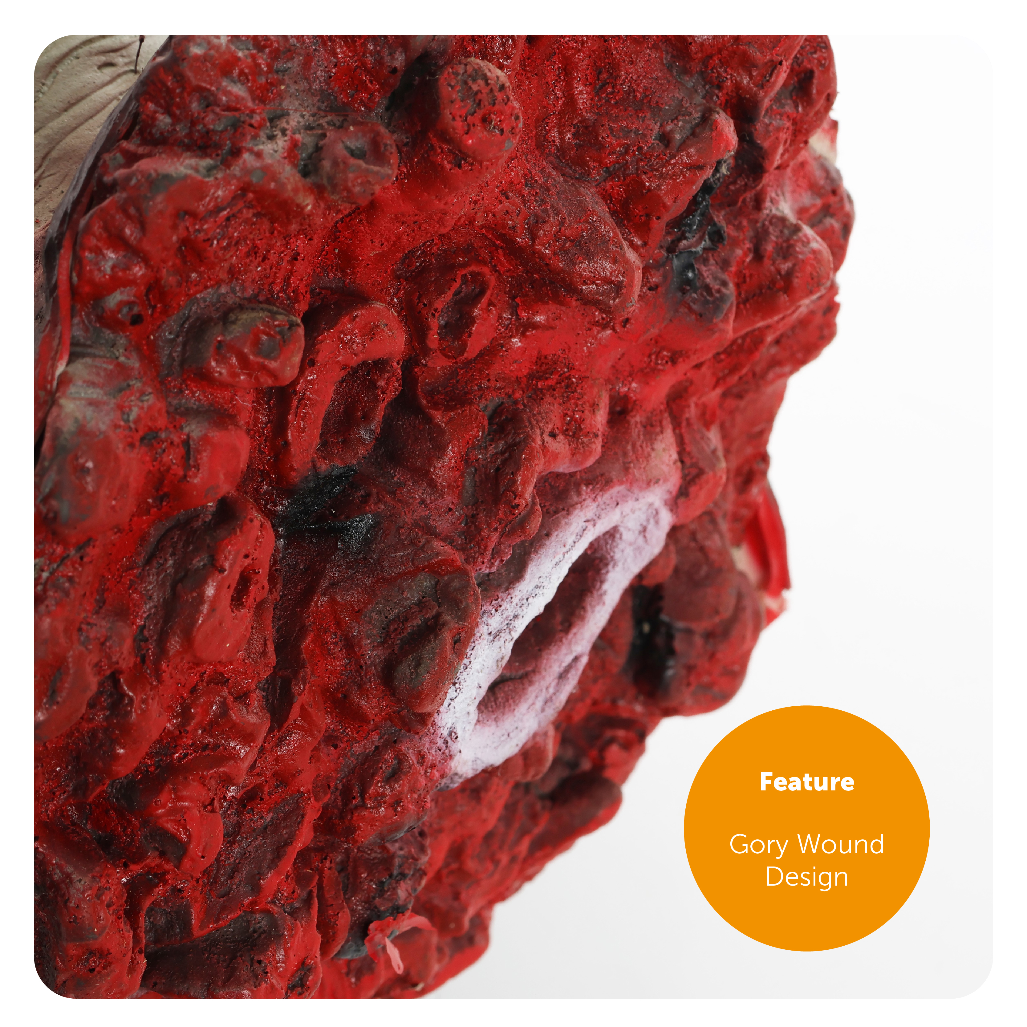 DECORATION DETAILS: Your Life-Sized Hanging Head is a severed head strung up with a red hook through its mouth, red sear marks with open wounds, and a lifeless pained expression, hanging on the end of a short rope to decorate with!
