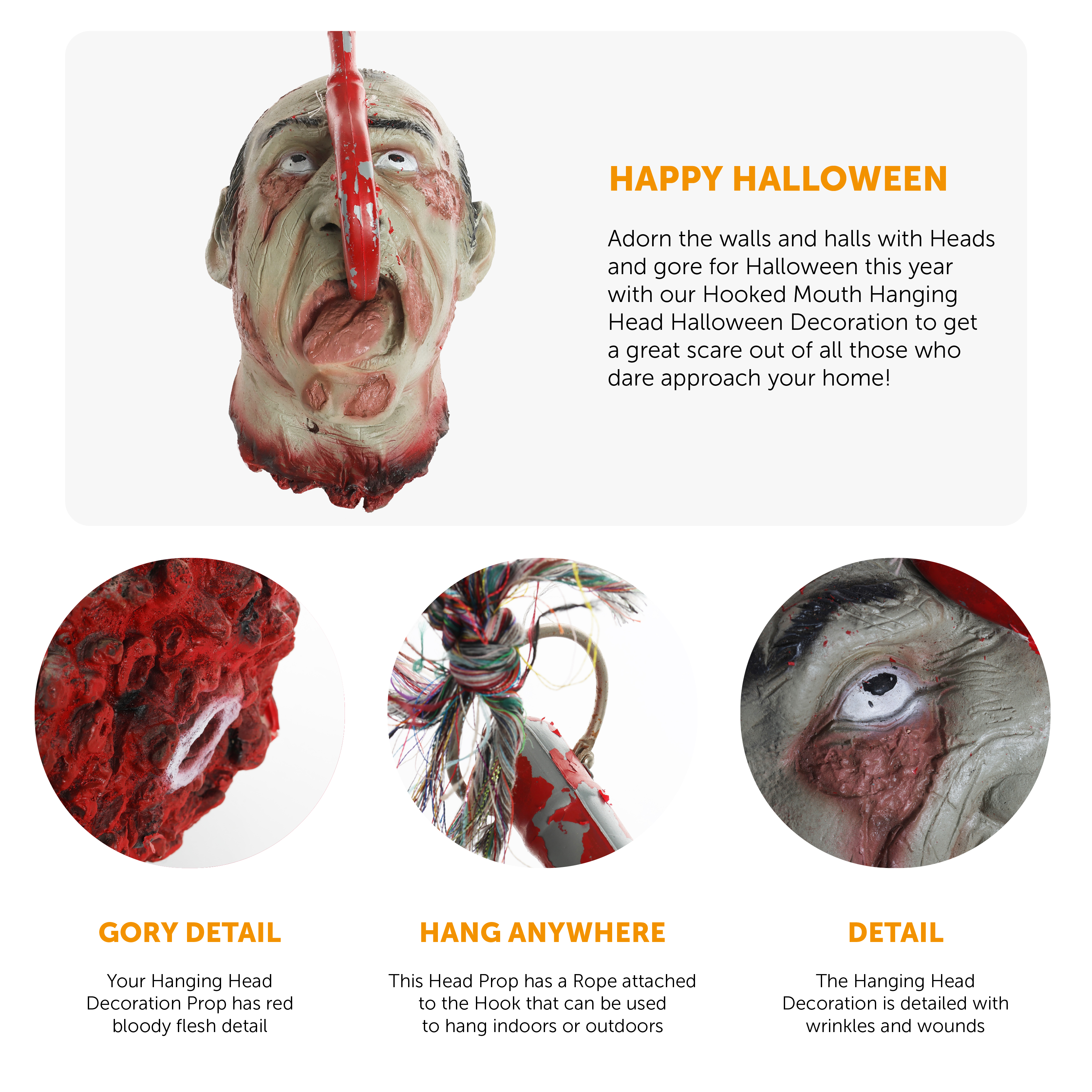 HOOKED MOUTH HANGING HEAD HALLOWEEN DECORATION: Adorn the walls and halls with Heads and gore for Halloween this year with our Hooked Mouth Hanging Head Halloween Decoration to get a great scare out of all those who dare approach your home!