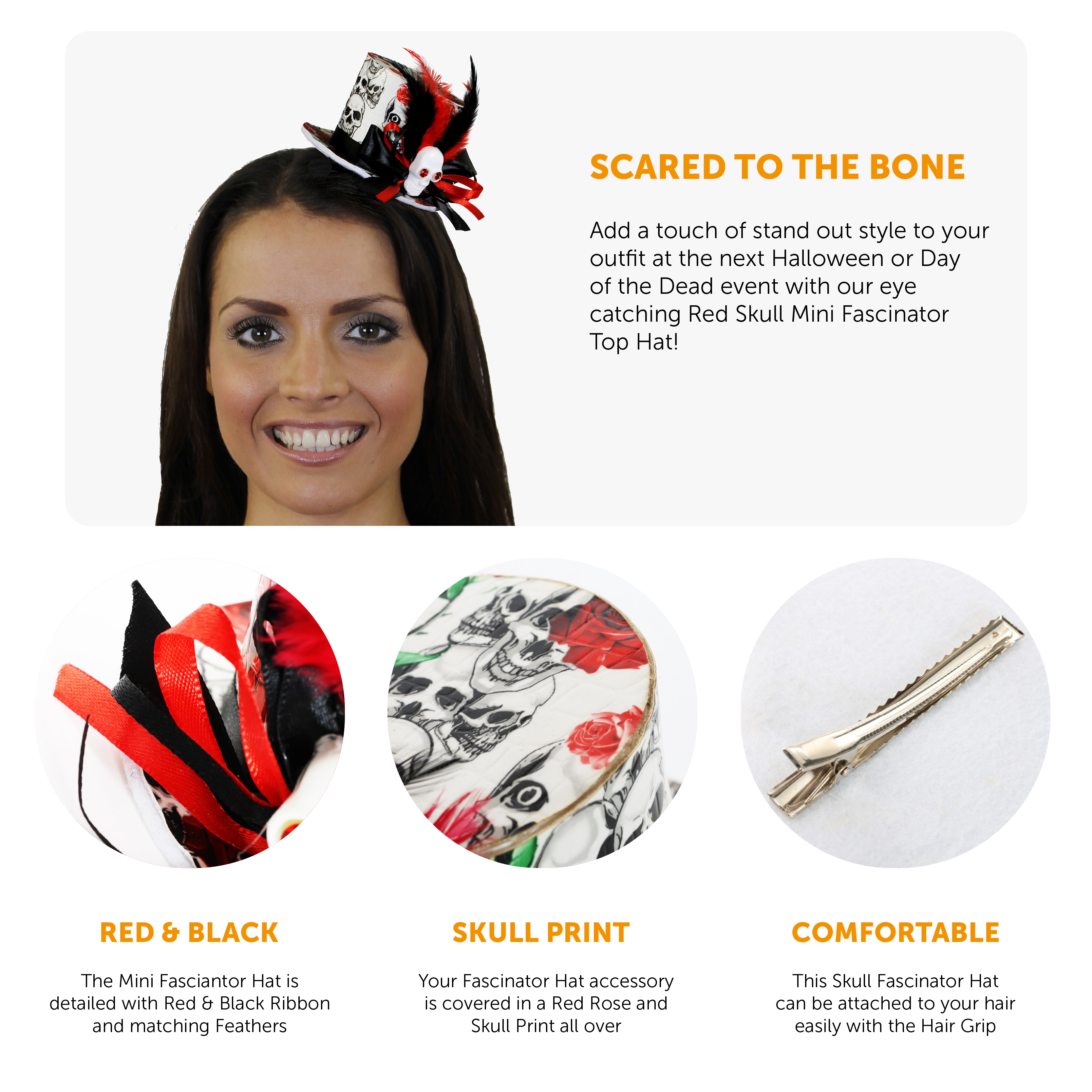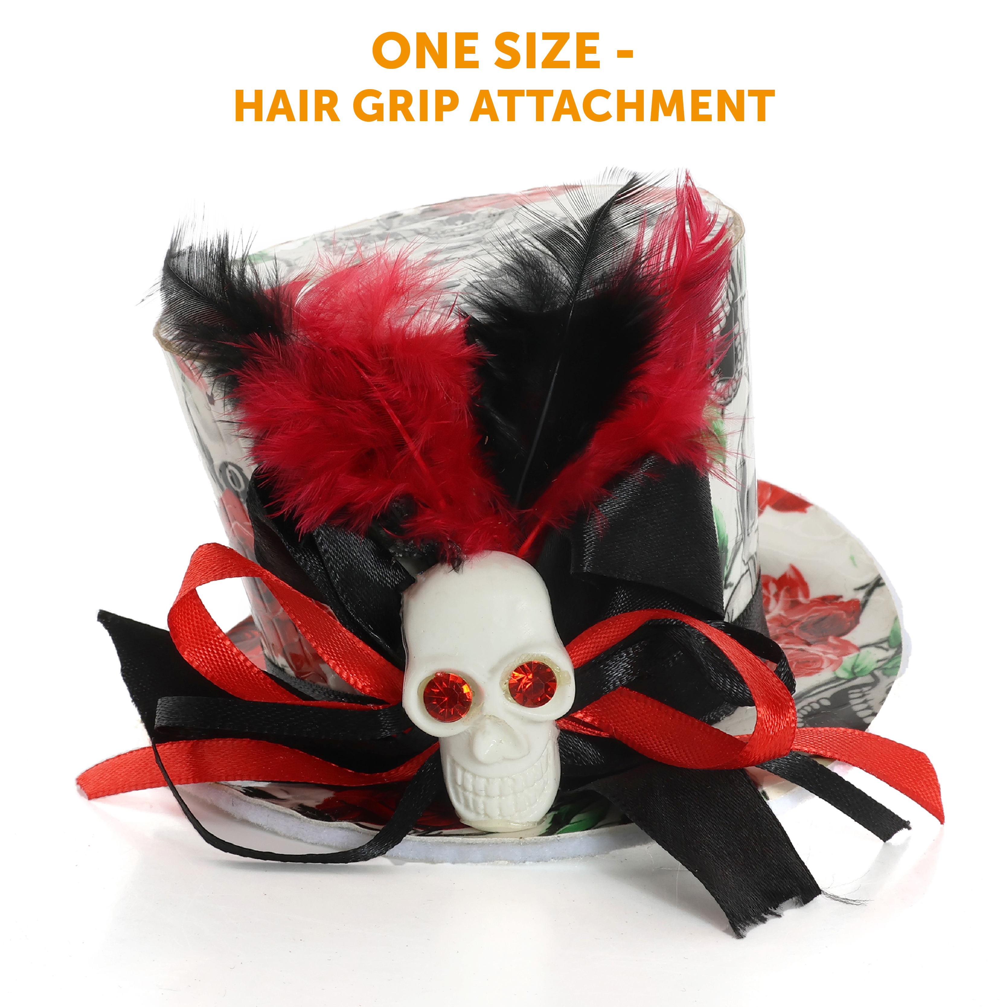 PERFECT FOR HALLOWEEN FANCY DRESS: Look cute and stylish as you accessorise your Halloween costume or Day of the Dead outfit perfectly with this Red Skull Mini Fascinator Top Hat!