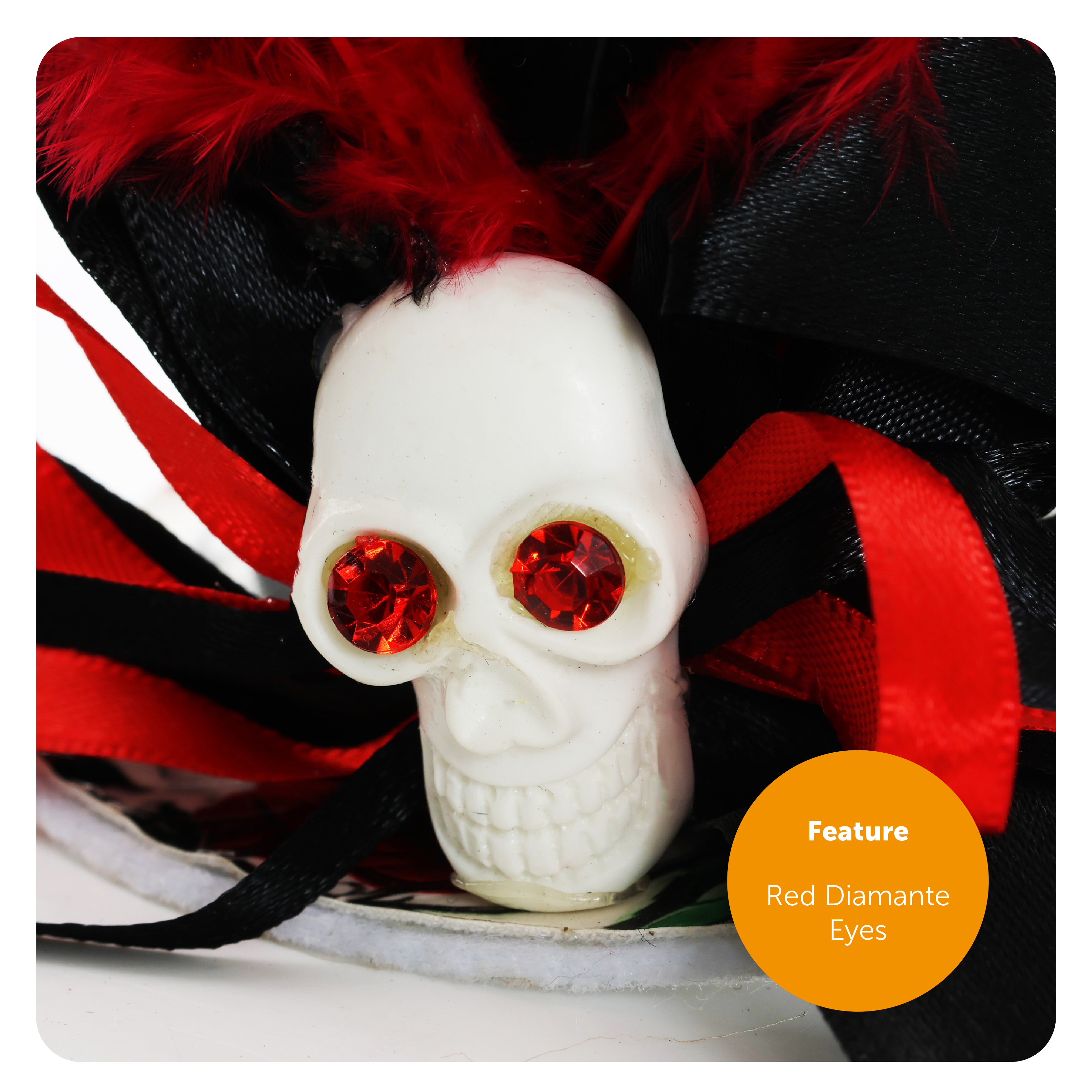 RED SKULL MINI FASCINATOR TOP HAT: Add a touch of stand out style to your outfit at the next Halloween or Day of the Dead event with our eye catching Red Skull Mini Fascinator Top Hat!