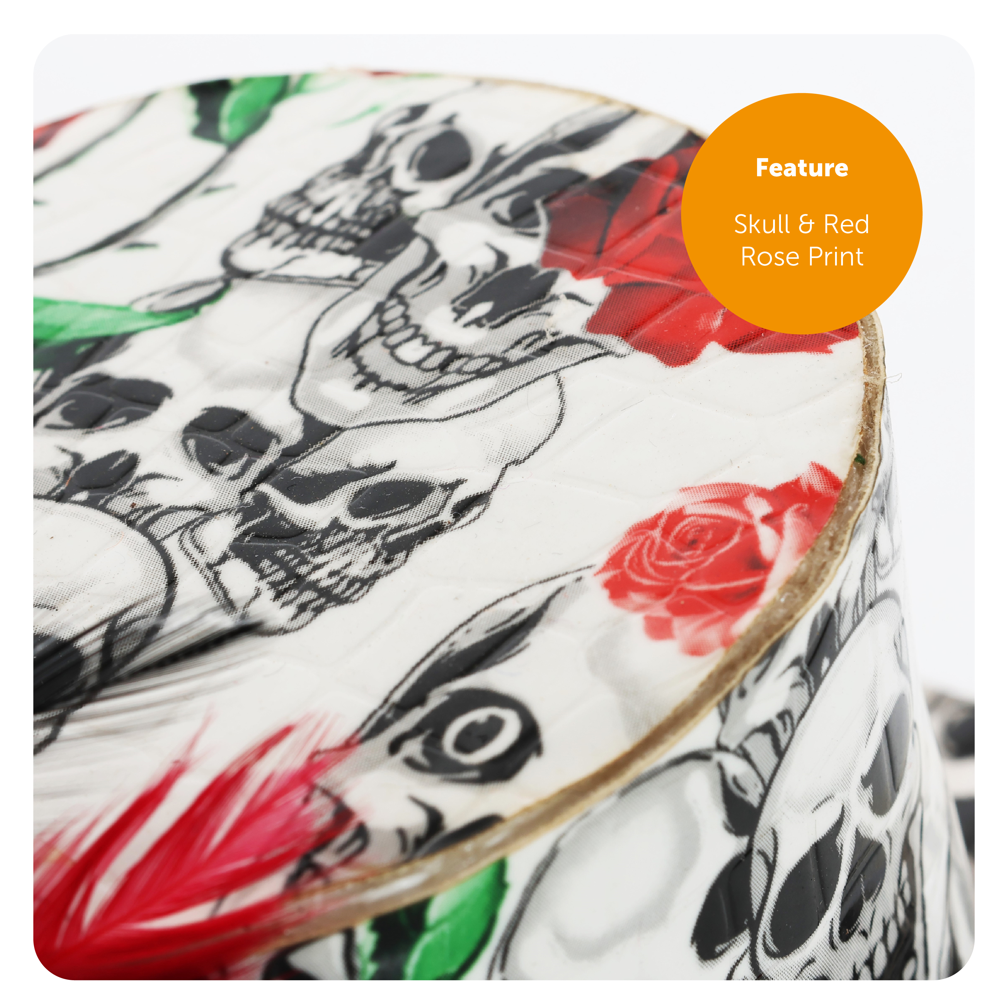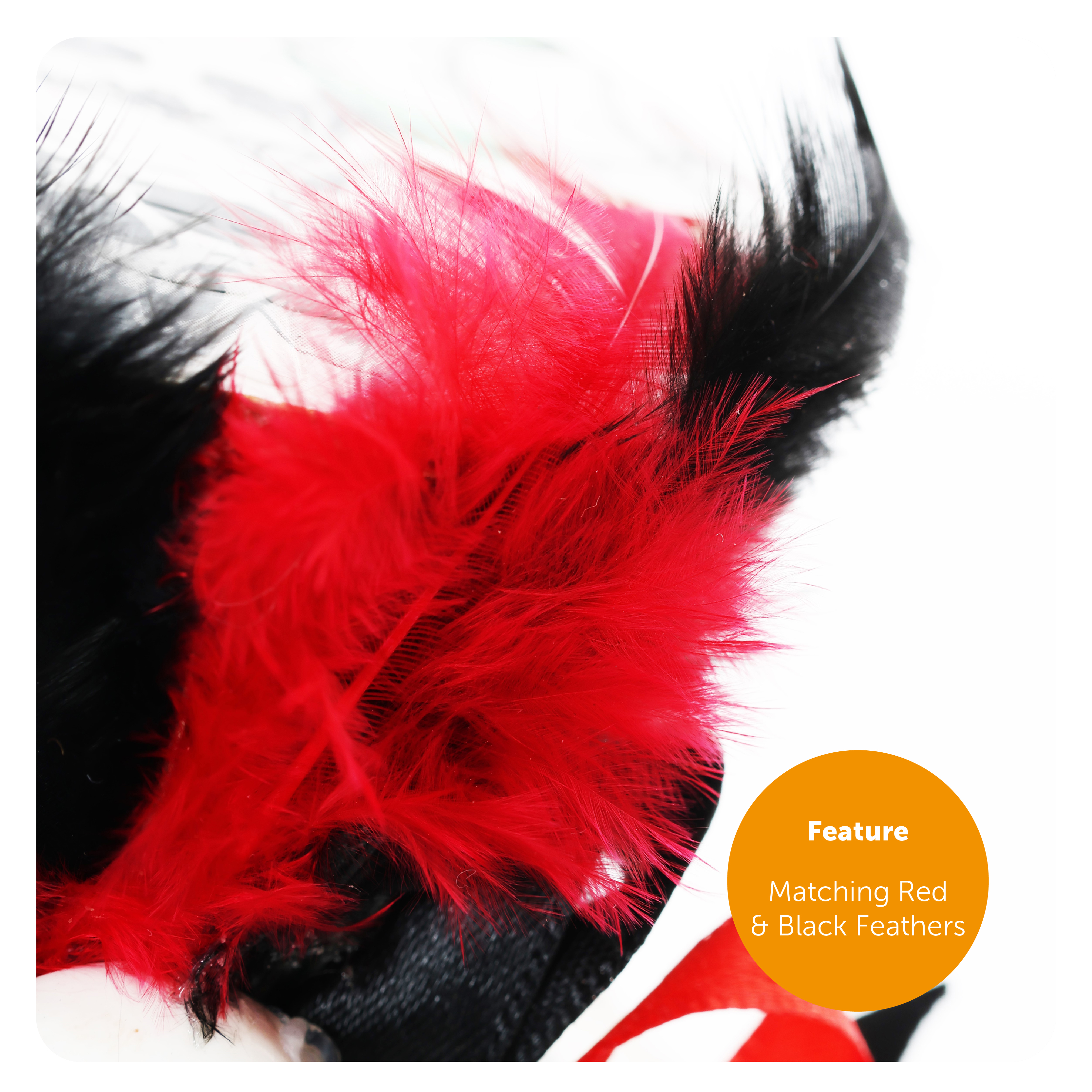 HAT DETAILS: The Mini Fascinator Hat is a miniature White Top Hat featuring a Gothic Skull and Red Rose print with a hair grip at the bottom, decorated with Red and Black Feathers and matching Red and Black Ribbon, and finished off with an eye catching Skull Button with Red Diamante Eyes!