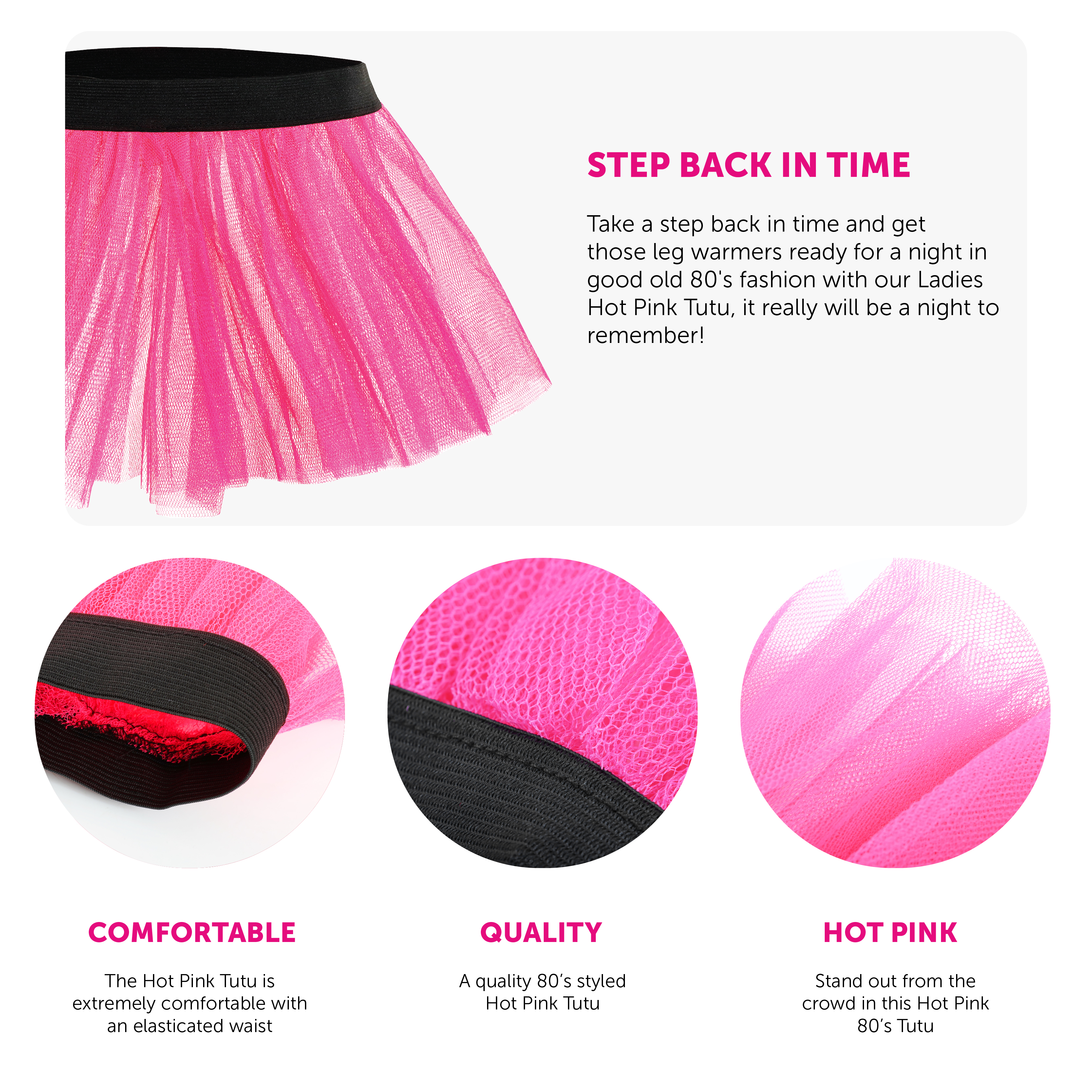 ACCESSORY DETAILS: This accessory is a Hot Pink Tutu with an elasticated waistband designed to match with other 80's themed accessories!