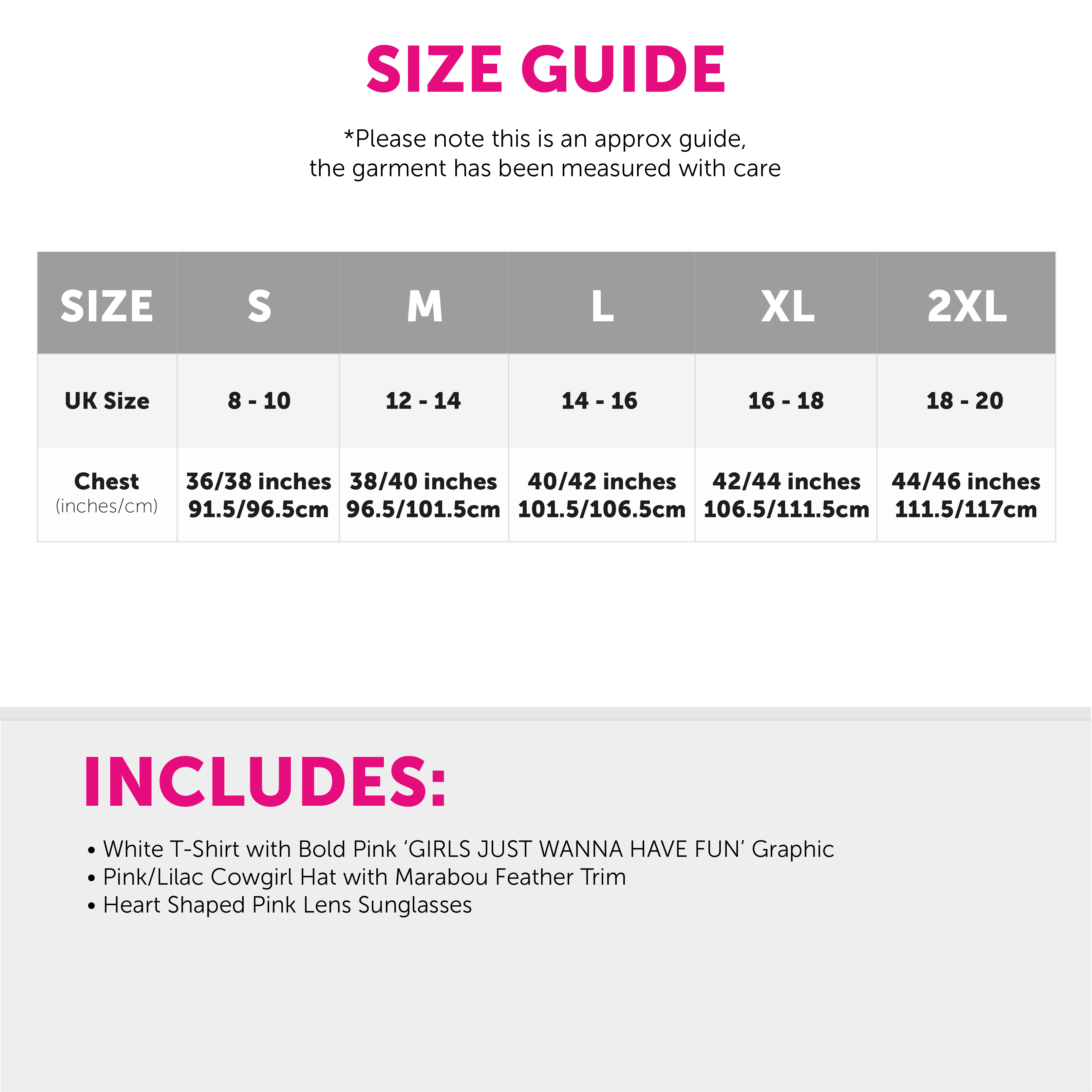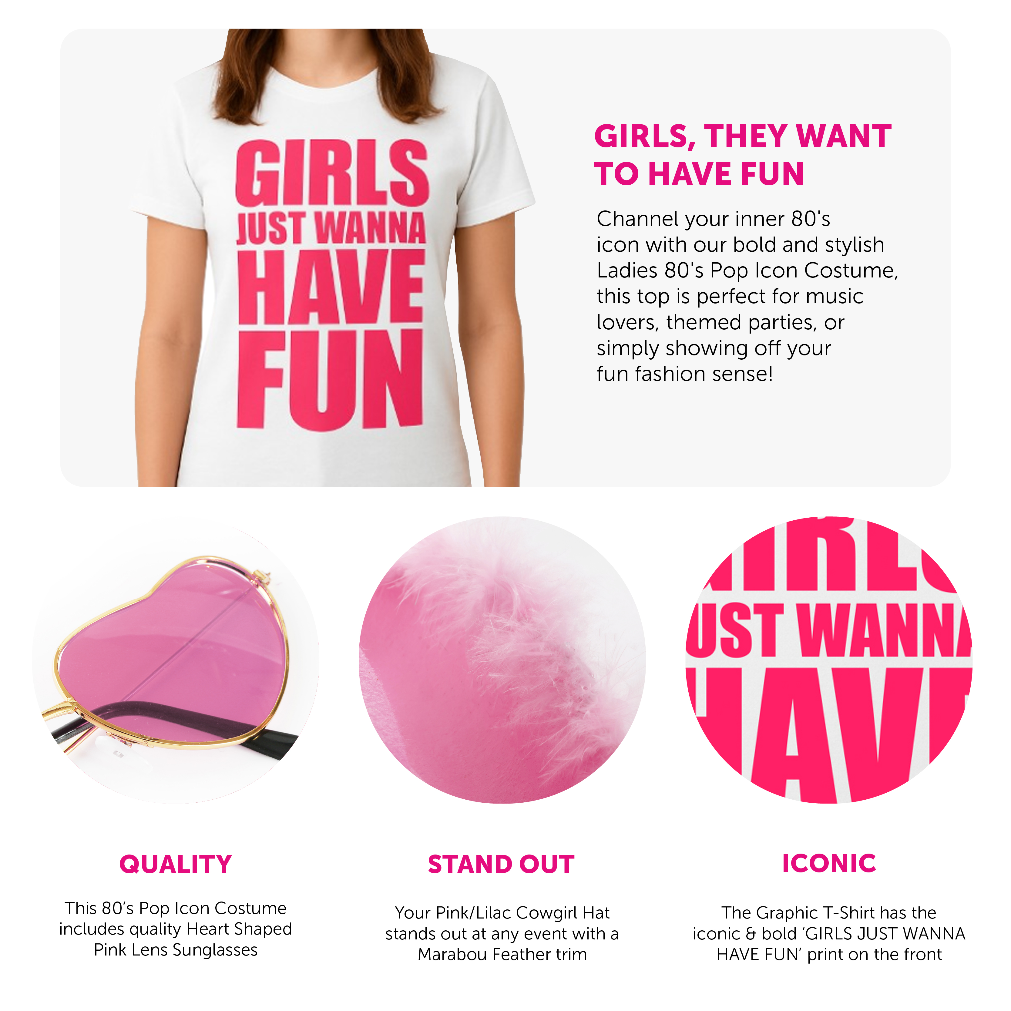 COSTUME INCLUDES: This Ladies 80' Pop Icon Costume includes a crisp White T-Shirt with a bold Pink 'Girls Just Wanna Have Fun' graphic on the front, a Pink Cowgirl Hat with Marabou Feathers around the brim, and Heart Shaped Sunglasses with Pink Lenses, perfect for any fancy dress event!
