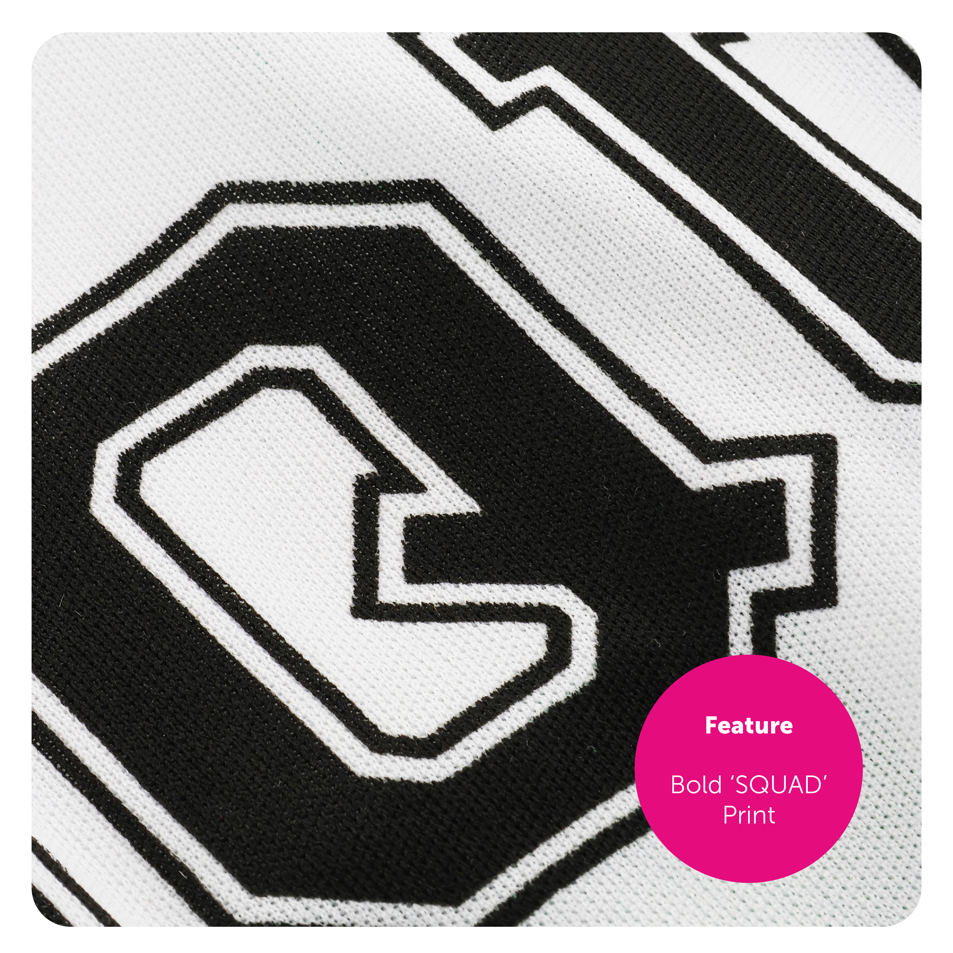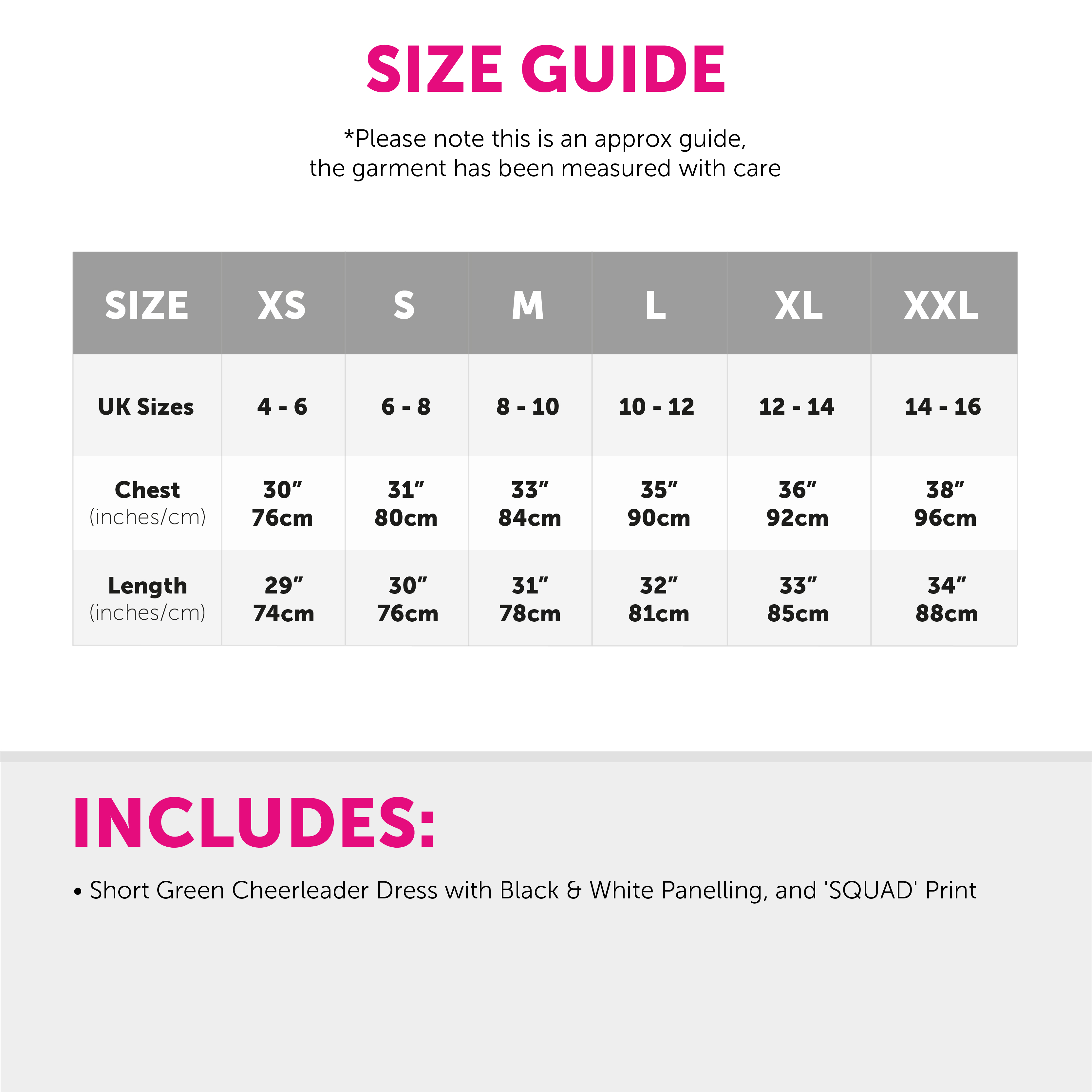 COSTUME INCLUDES: Your Ladies Cheerleader Costume is a bright Green Short Dress with a Pleated Skirt, Black and White panelling, and 'SQUAD' Printed on the front in a Large Black Font, the perfect Costume for any fancy dress event!