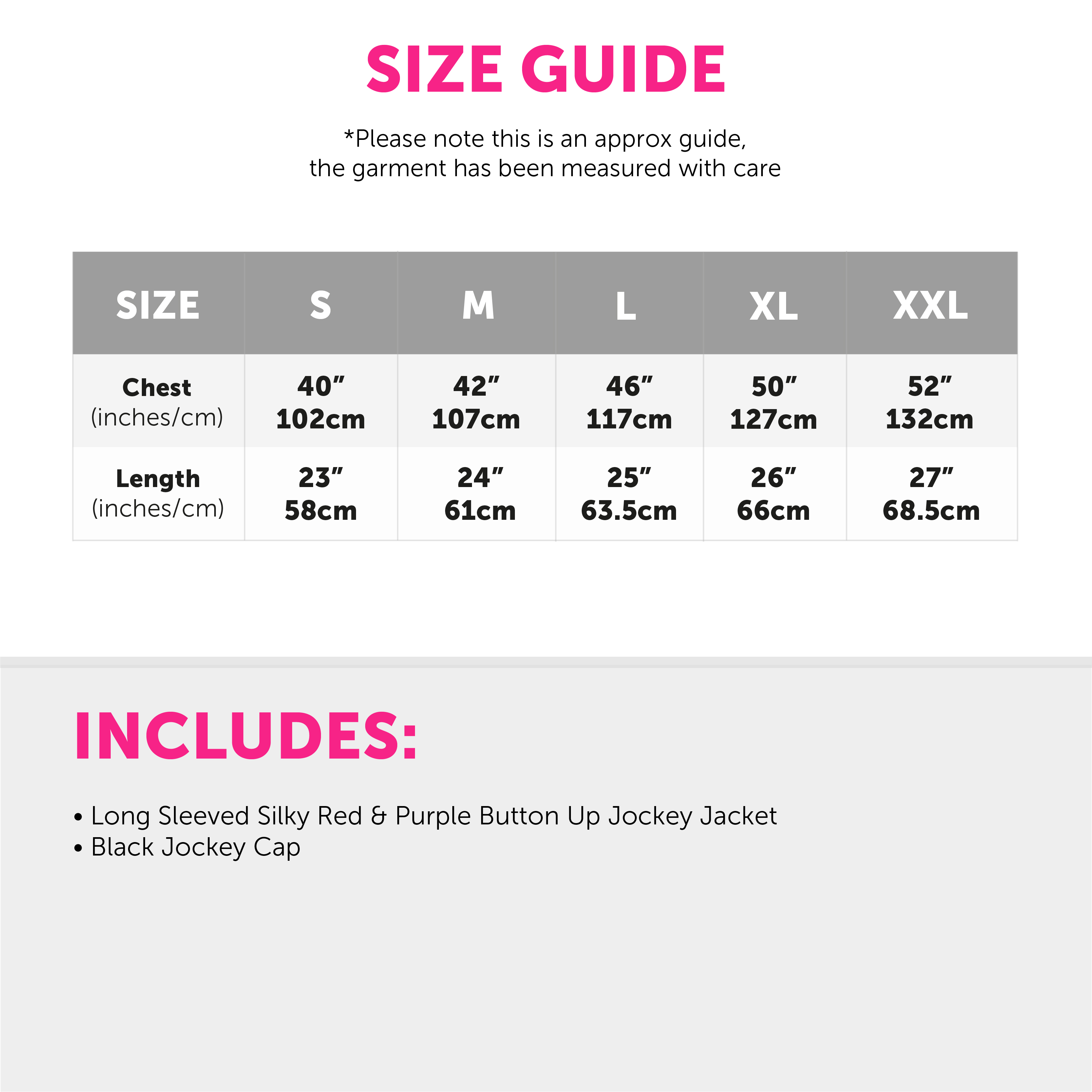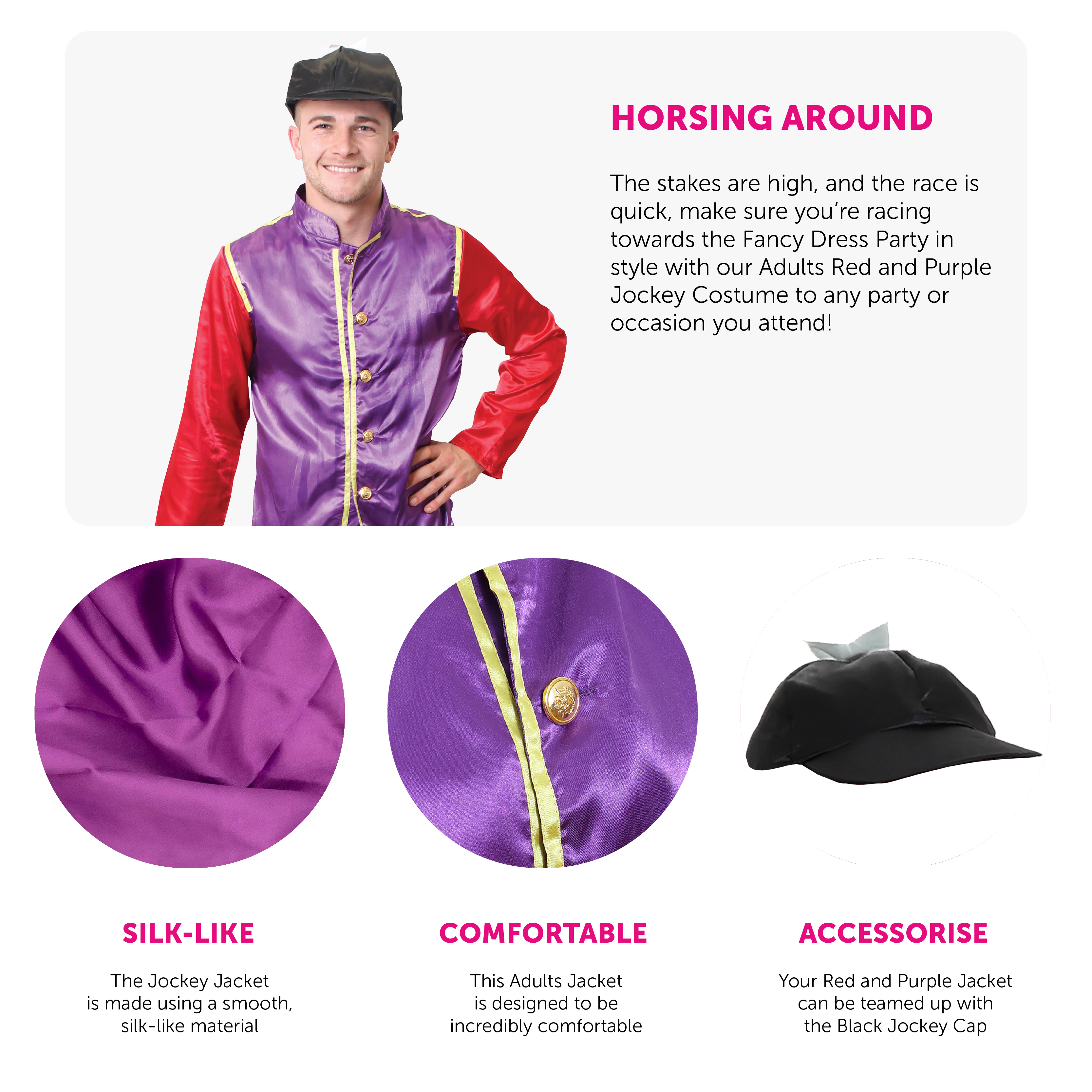 - For sporting events such as the Grand National and the Cheltenham Festival, or general fancy dress events, you’re in for a night full of fun with our Adults Red and Purple Jockey Costume with Black Goggles!
