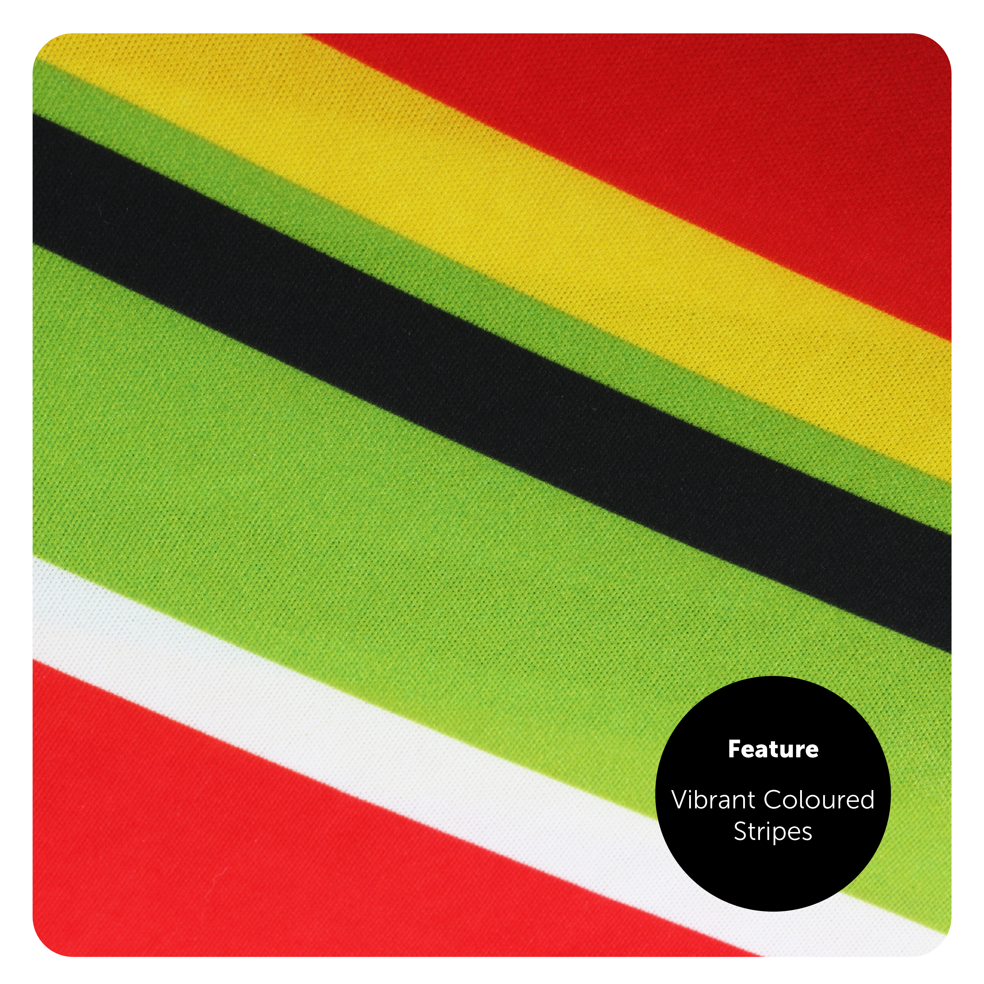 MULTI-COLOURED STRIPED PONCHO DETAILS: Your Adults Poncho is an extremely high-quality Poncho, striped using a Green, Yellow, Black, Red and White Multicolour pallet, with White Tassel Edging to complete the look!
