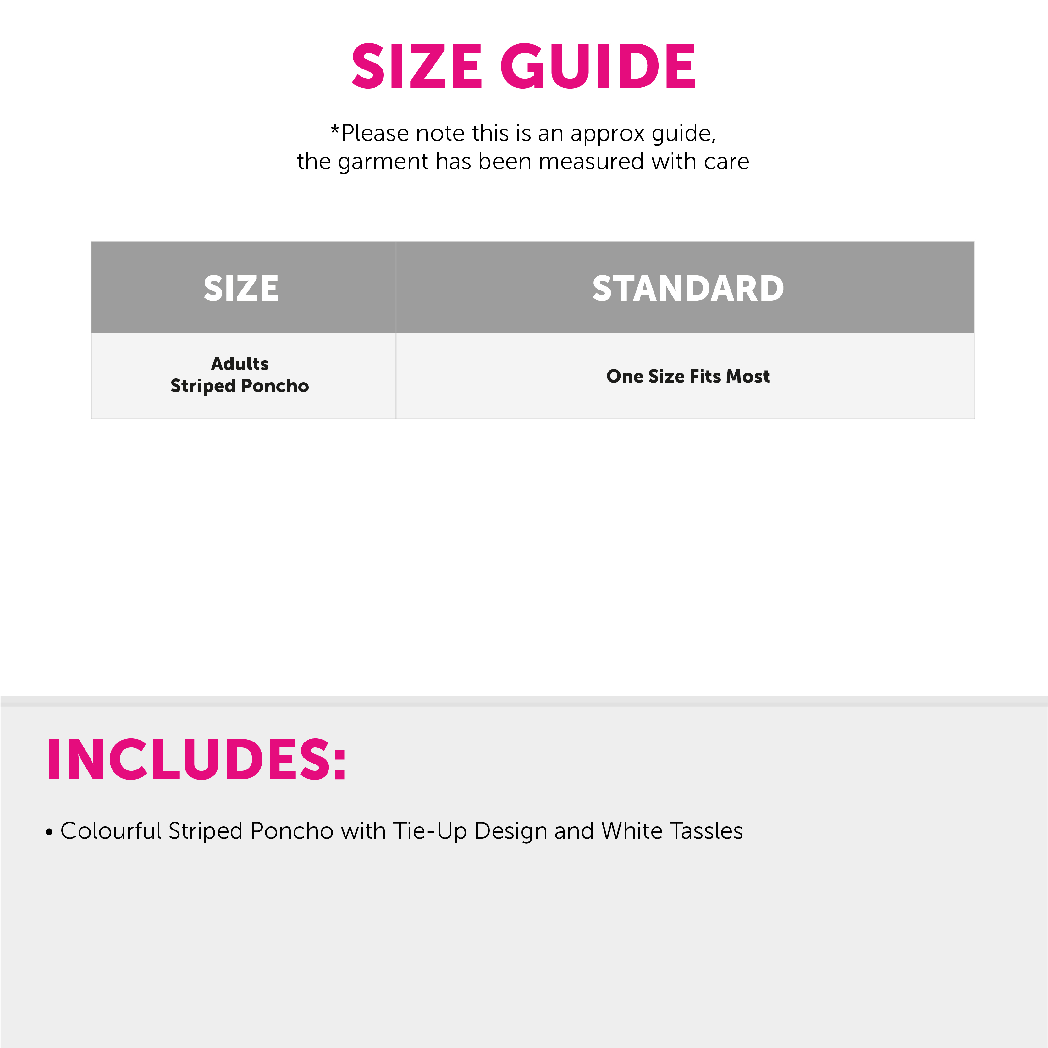 ADULTS MULTI-COLOURED STRIPED PONCHO: Strike out with a classic, stylish, and iconic look with our Adult’s Multi Coloured Striped Poncho and make your next fancy dress outing a memorable event!