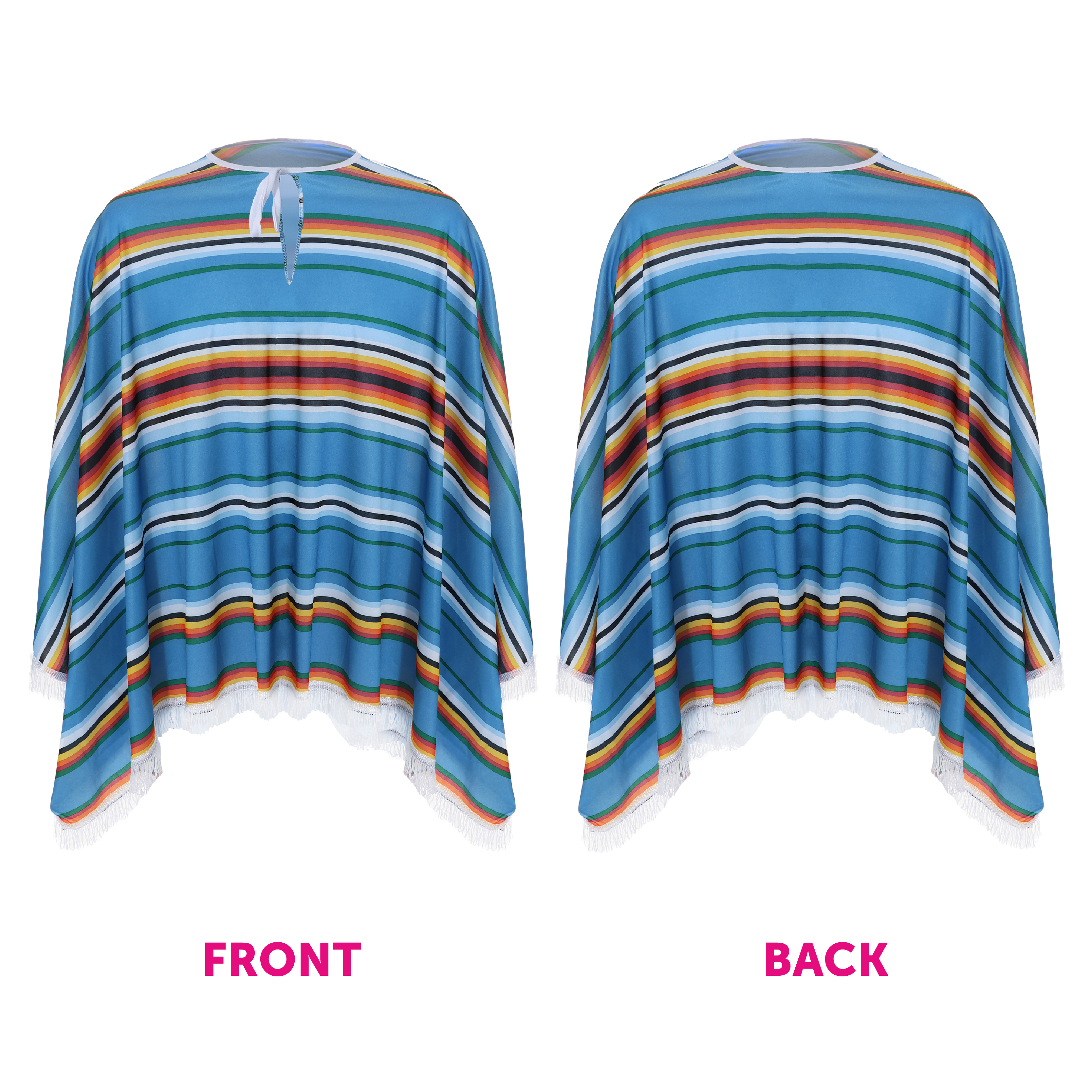 PONCHO SIZE GUIDE: Your Adults Striped Poncho is available in only one size, but with its comfortable room and space, your Poncho will fit any size from Small to XXX-Large!