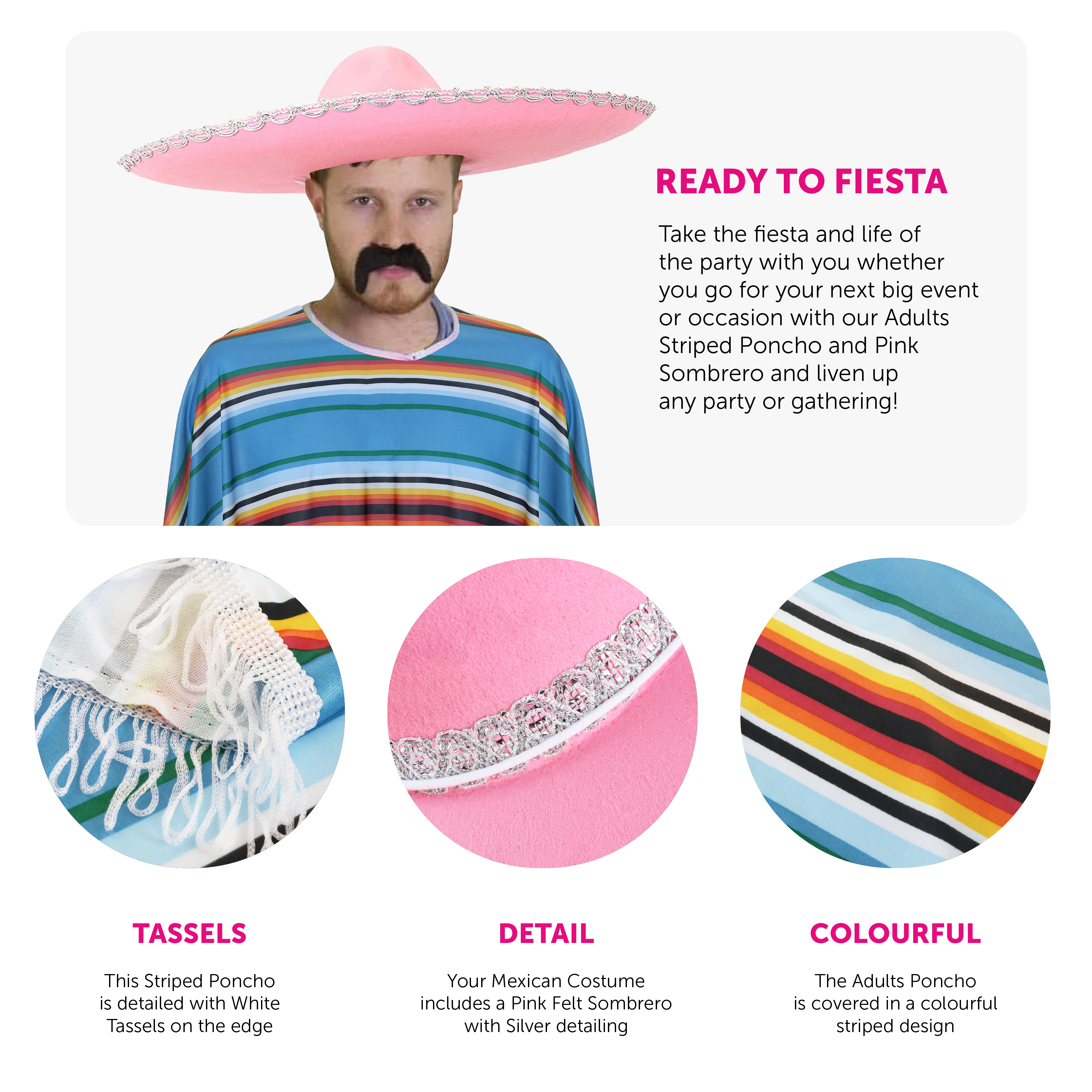 PERFECT FOR ANY FANCY DRESS PARTY: Whether it be a Mexican-themed party, or a night out with some friends, you’ll be sure to get some nights of fun out of your Adults Striped Poncho and Pink Sombrero Set!