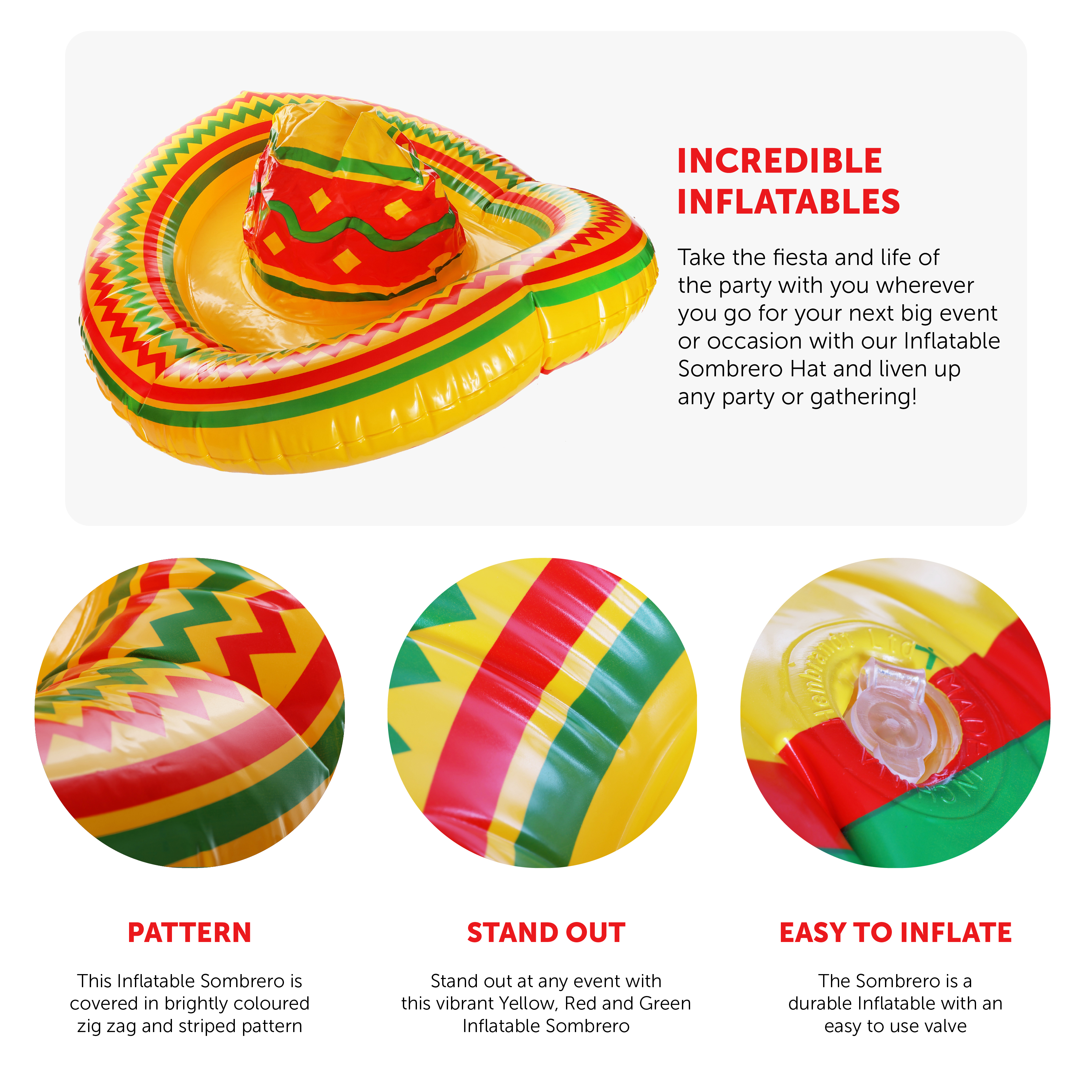 SOMBRERO DETAILS: A classic shaped, Yellow Inflatable Mexican Sombrero with a Red and Green pattern printed all over, this Sombrero can be inflated using a pump with an easy to use valve, it's a great accessory to accompany your look!