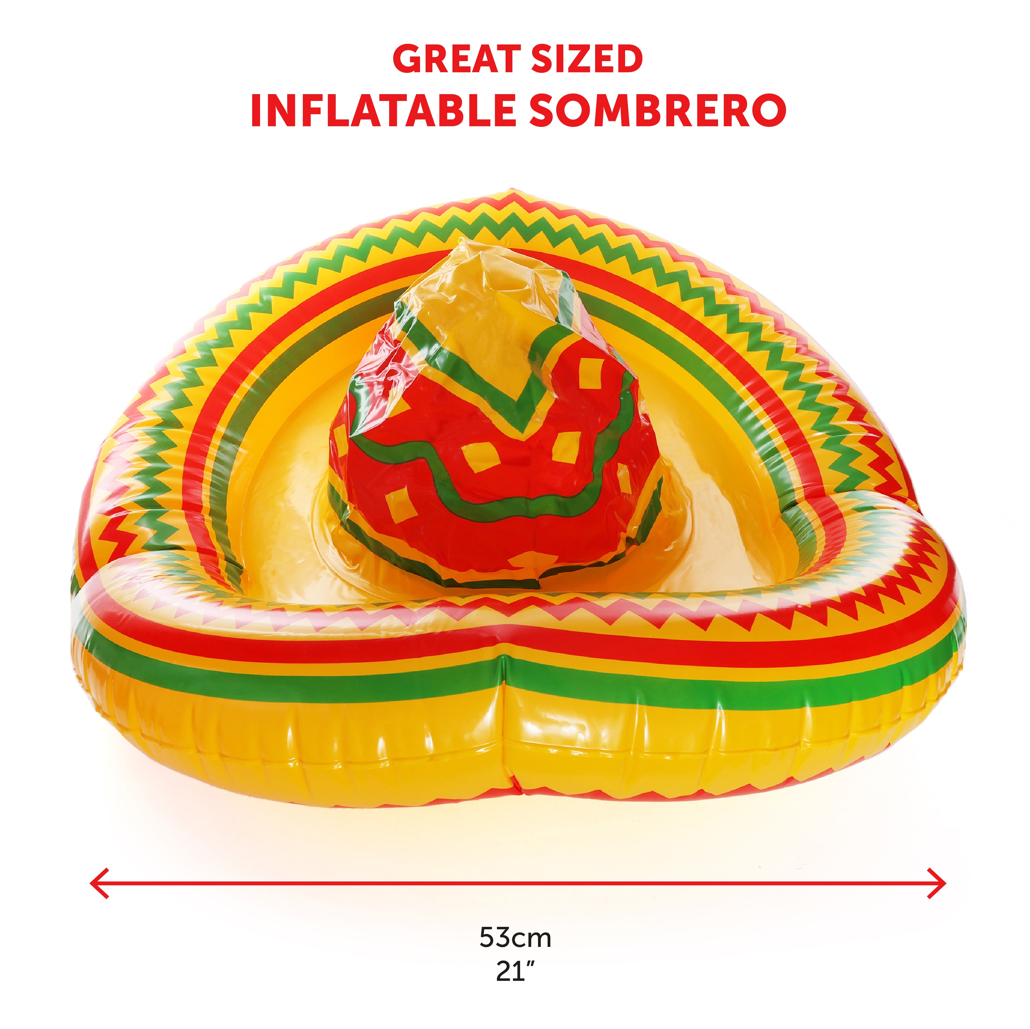 INFLATABLE MEASUREMENT: This Inflatable Sombrero is a great sized accessory with a circumference of 53cm (21") once fully inflated, it's the perfect addition to any Mexican theme party!
