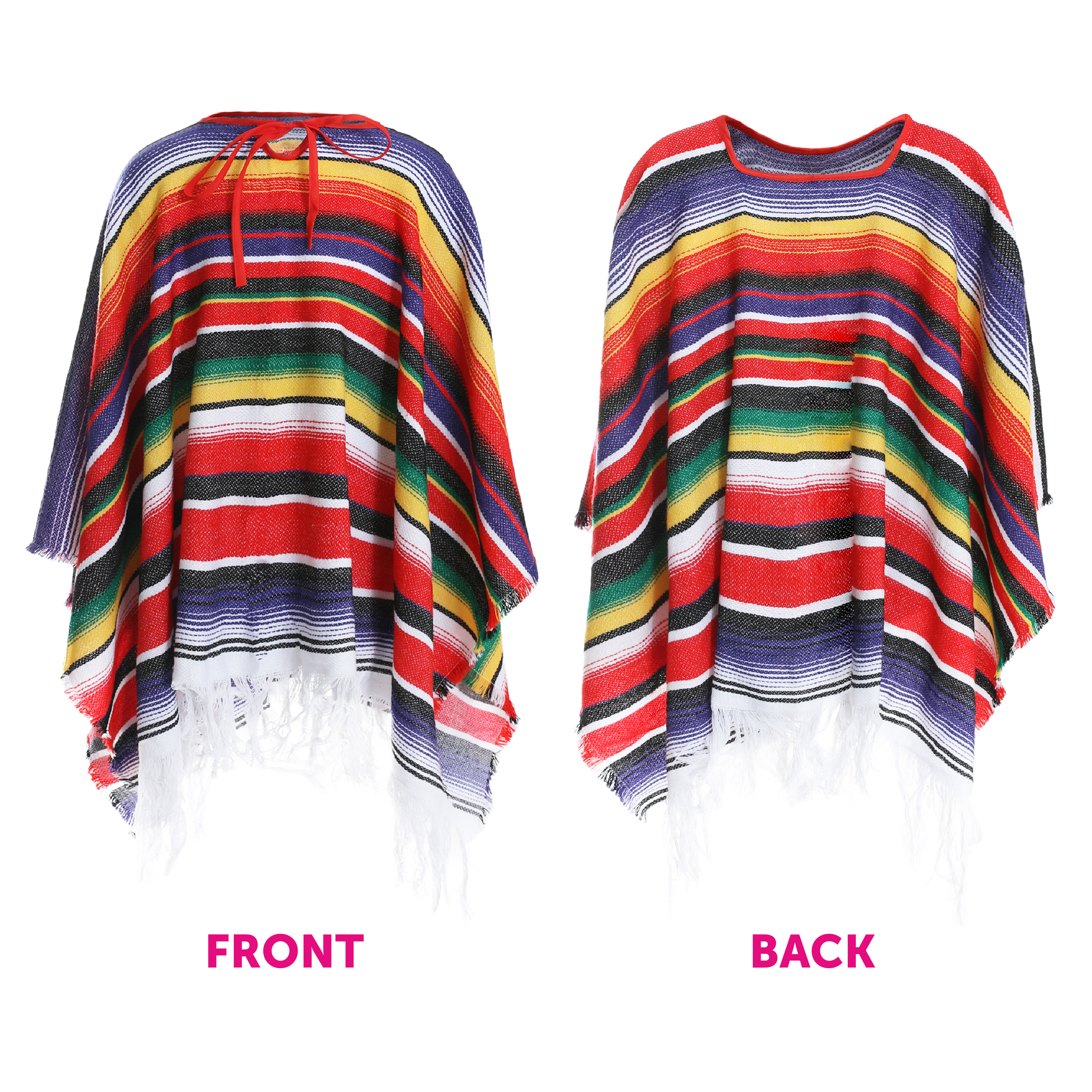 COSTUME DETAILS: This set includes an extremely high quality Multi Coloured Striped Poncho with Tassel edging, and a Large Pink Felt Sombrero Hat with Silver detailing and an adjustable strap, to complete the look!