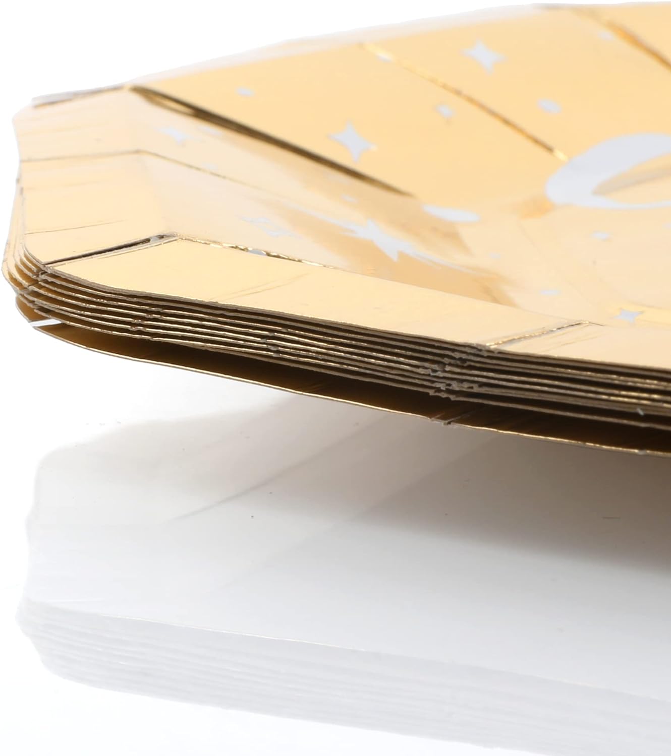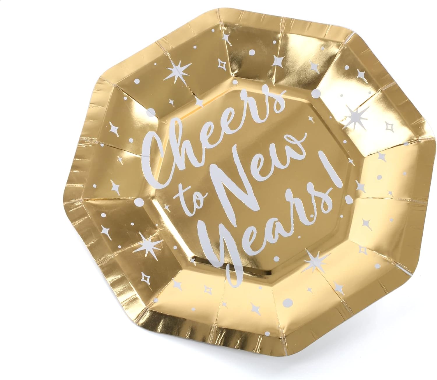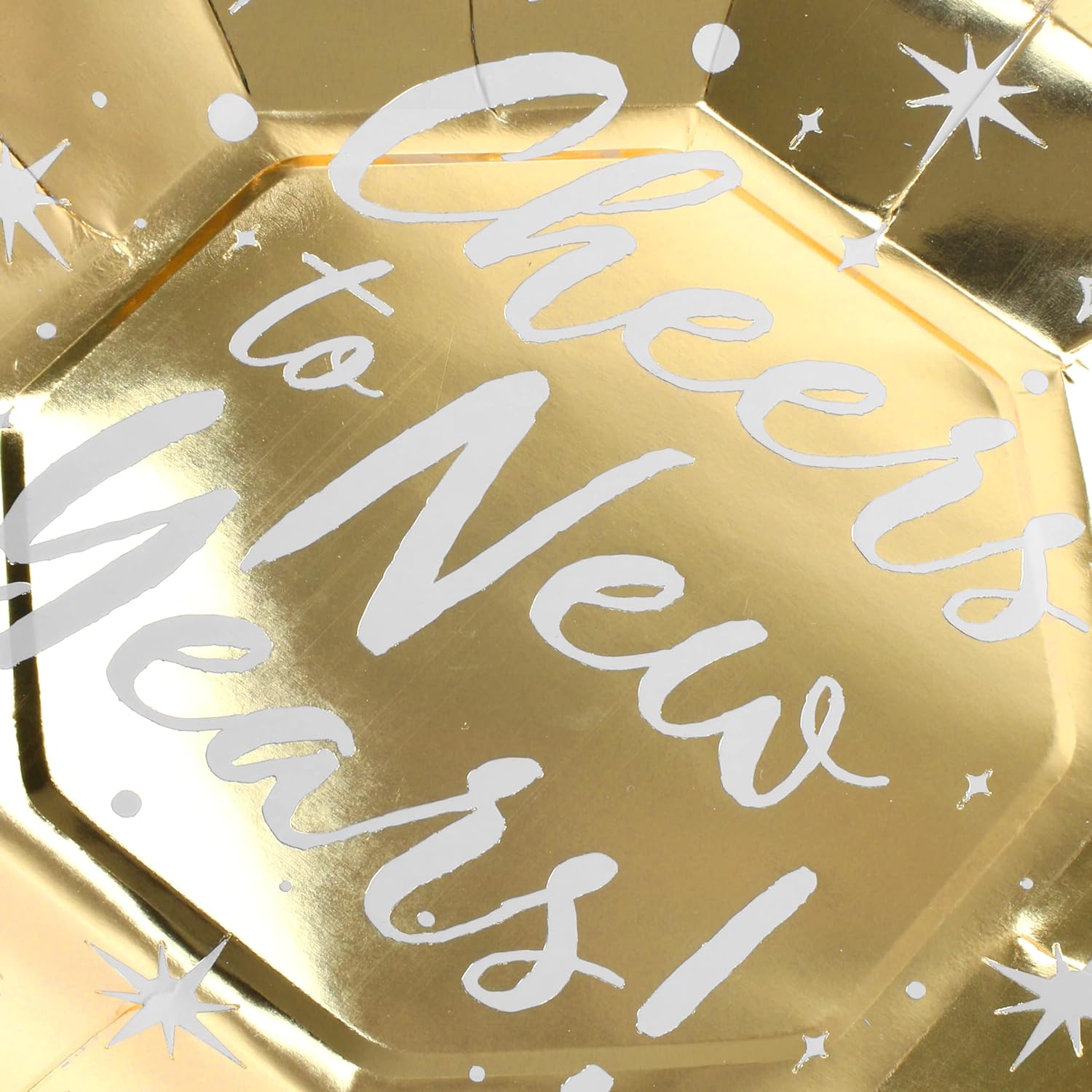 PLATE DETAILS: Each Pack contains 10x Gold coloured, Deluxe Octagon shaped Plates, with a 'Cheers to New Years!' message across the front, with Star details, the perfect New Years Party Tableware decoration!