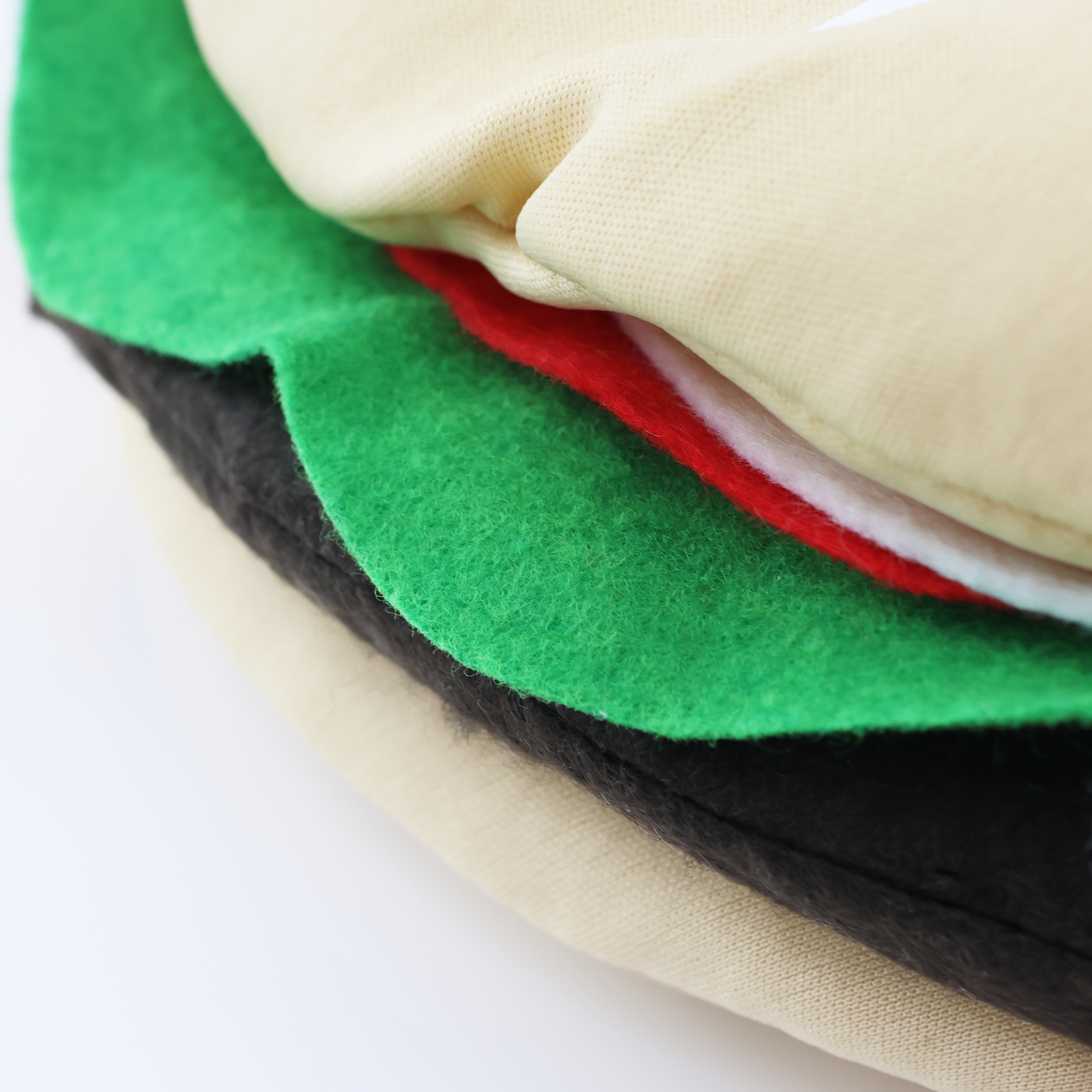 BURGER HAT DETAILS: Your Burger hat is 40cm long, sits nicely on top of a flannel material base, and the Burger is fully prepared in a bun, patty, and cheese, ready for lunch times and an evening snack!