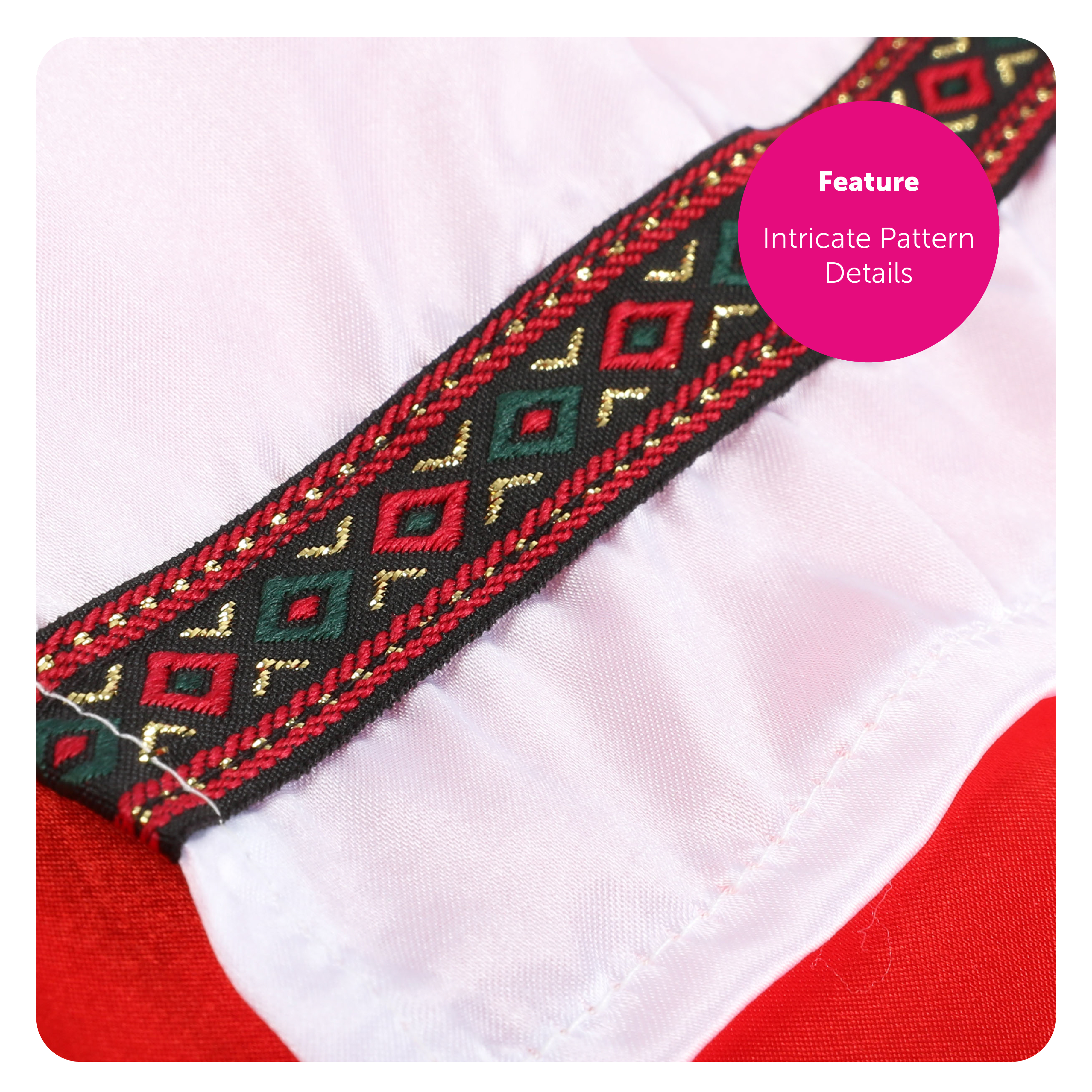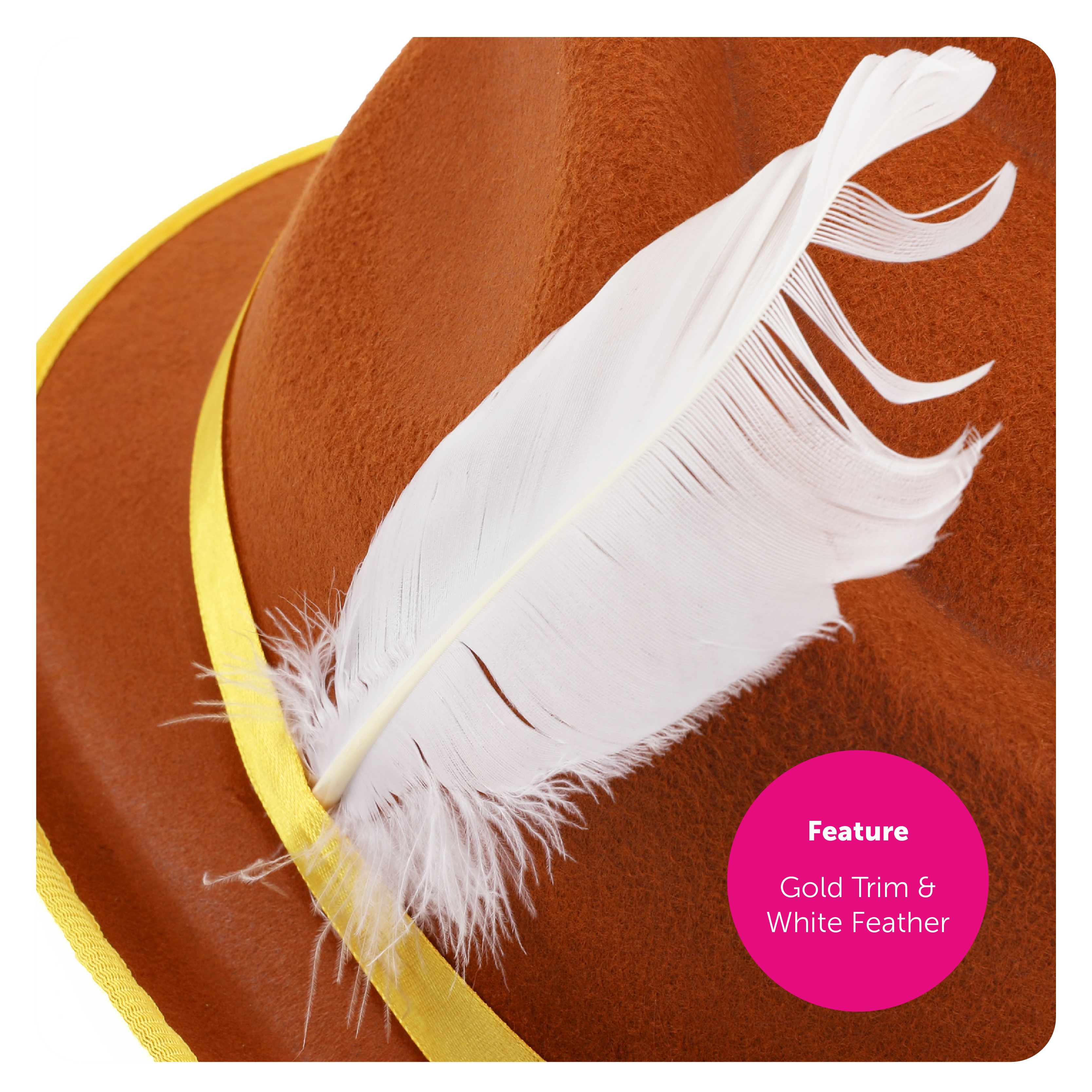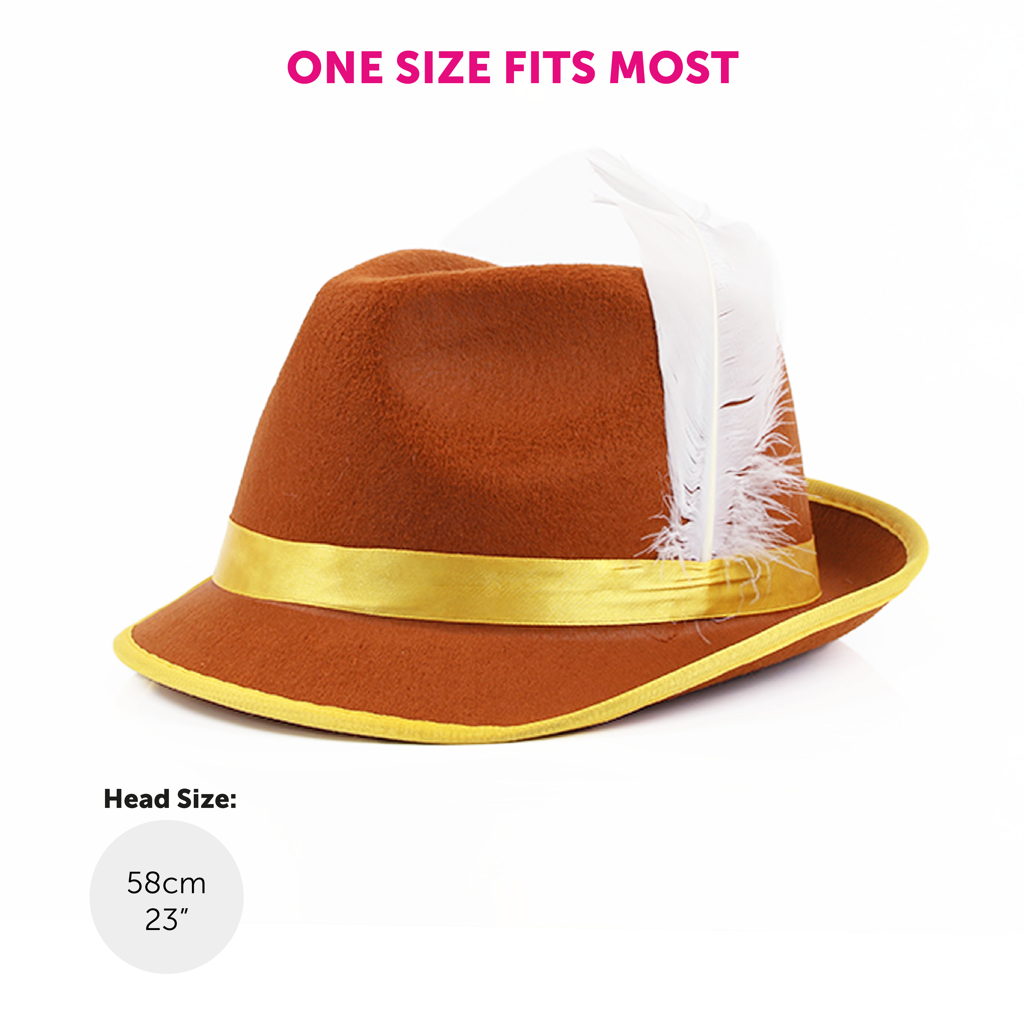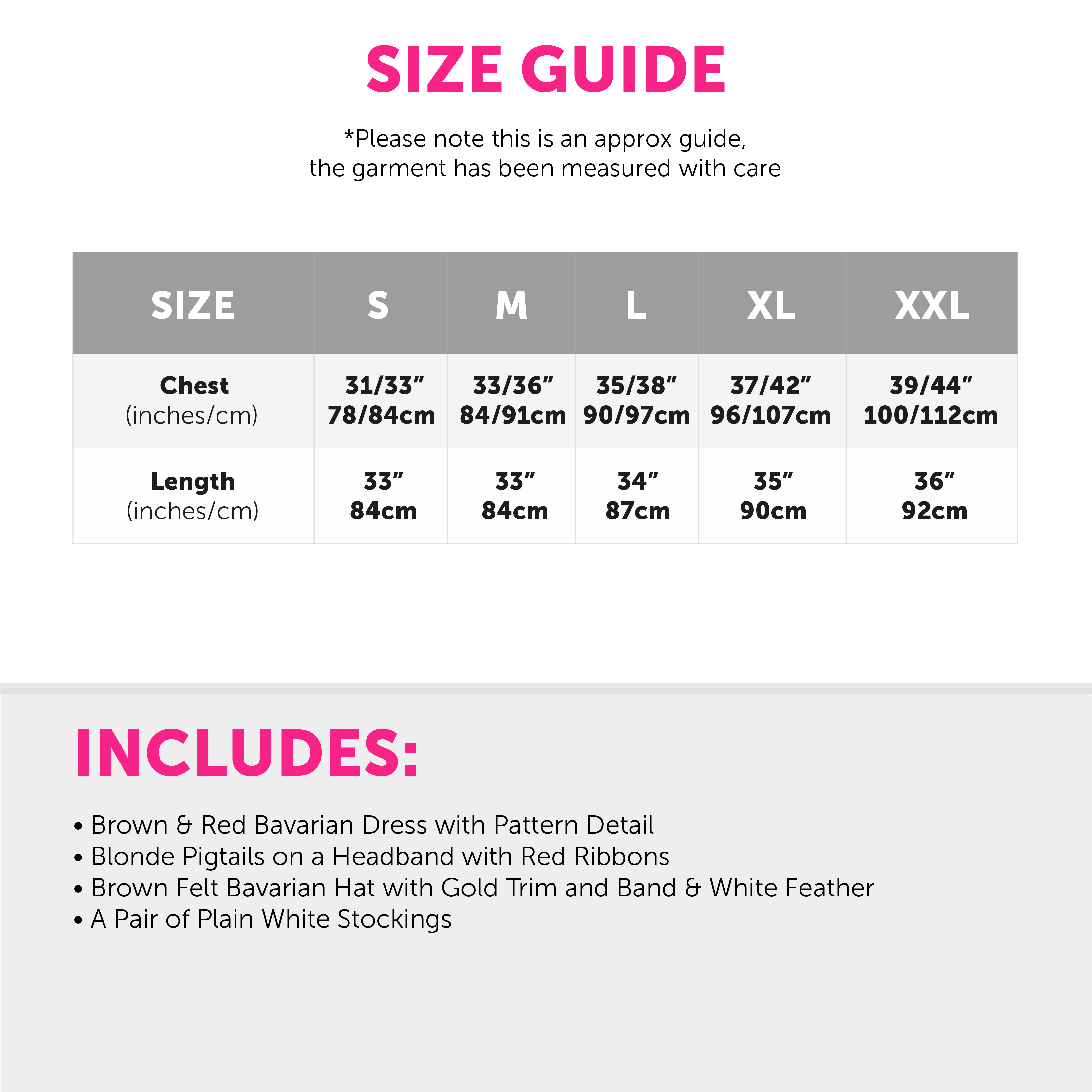 COSTUME INCLUDES: Your Men's Bavarian Costume Set includes a beautiful soft dress with a Red Skirt and a Brown Laced Corset Top with an attached White Shirt, a deluxe high-quality Brown Felt Oktoberfest Hat, with a yellow band and White Feather detail, Long Blonde Plaits on a Headband with Red Ribbons, and a Pair of Long White Stockings!