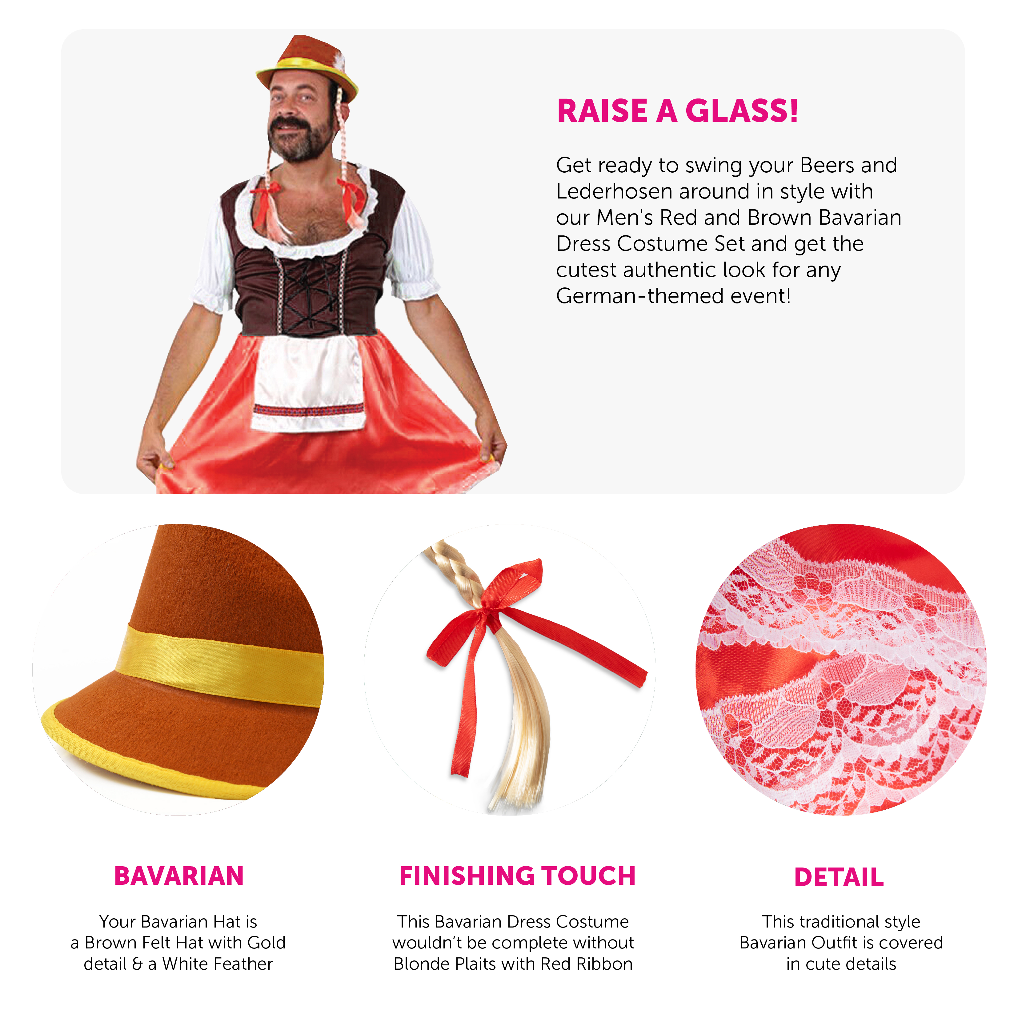 MEN'S RED AND BROWN BAVARIAN COSTUME: Get ready to swing your Beers and Lederhosen around in style with our Men's Red and Brown Bavarian Dress Costume Set and get the cutest authentic look for any German-themed event!