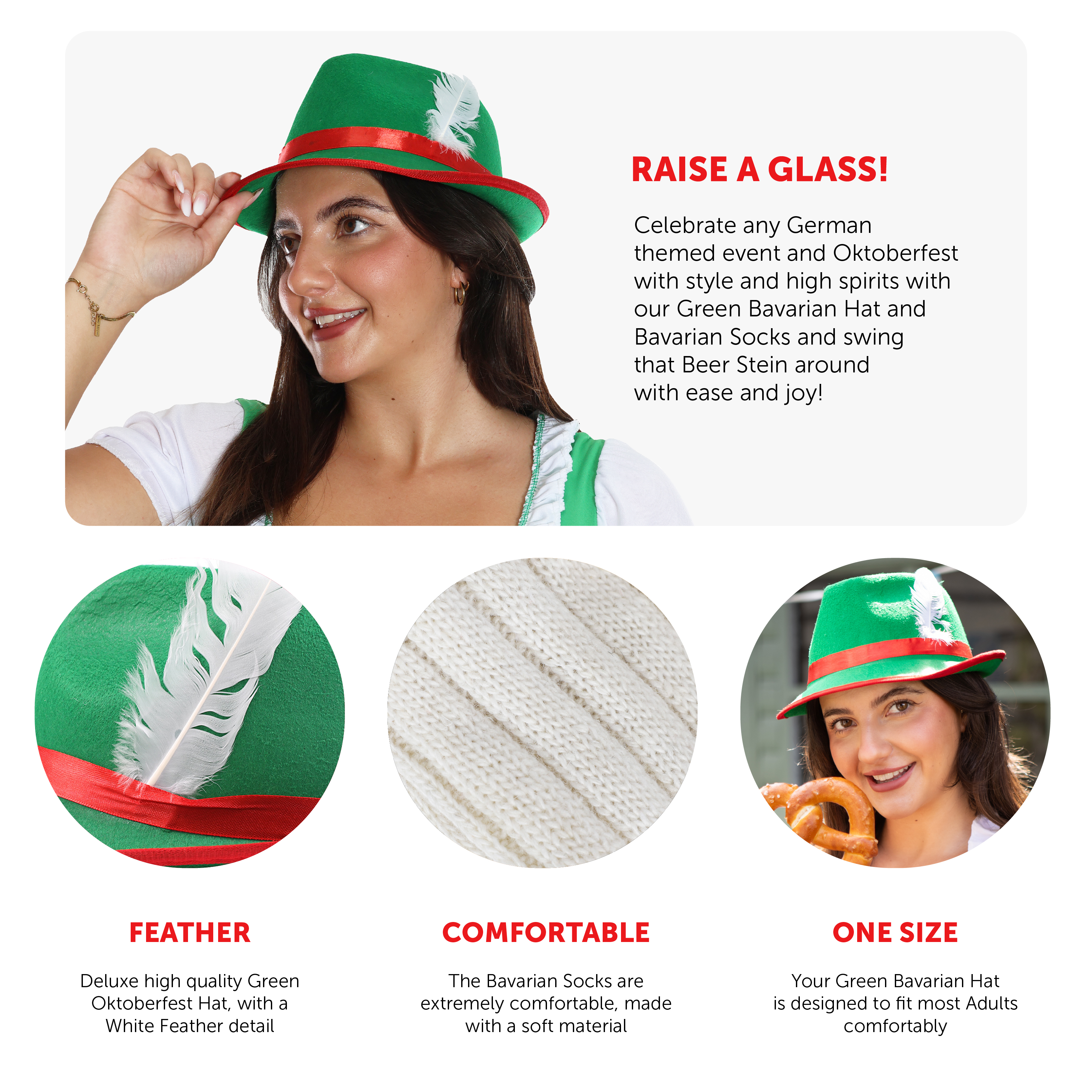 GREEN BAVARIAN HAT & BAVARIAN SOCKS: Celebrate any German themed event and Oktoberfest with style and high spirits with our Green Bavarian Hat and Bavarian Socks and swing that Beer Stein around with ease and joy!