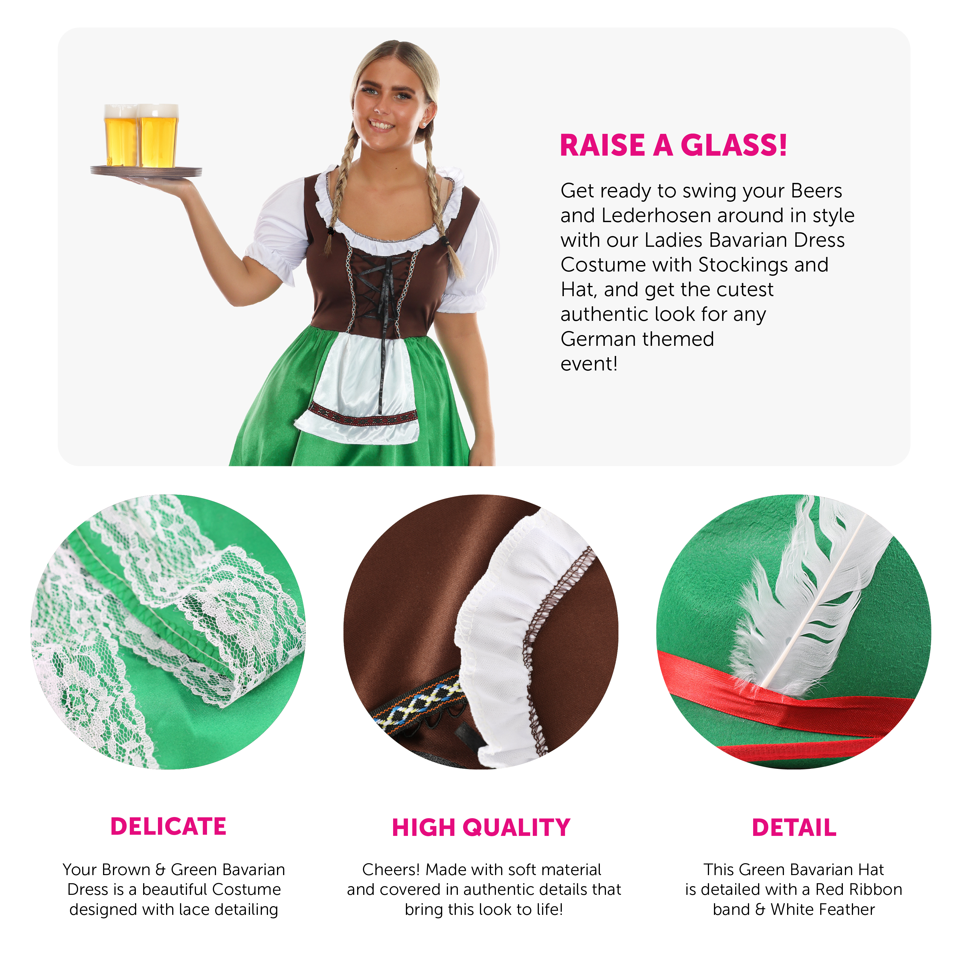 BAVARIAN SET INCLUDES: Your Ladies Bavarian Costume includes a beautiful dress with a Green detailed skirt, and a Brown Laced Corset Top with an attached White Shirt with frilled shoulders, a pair of White Stockings detailed with a Red Bow, and a Green Hat with a Red Ribbon band and White Feather, the perfect Oktoberfest look!