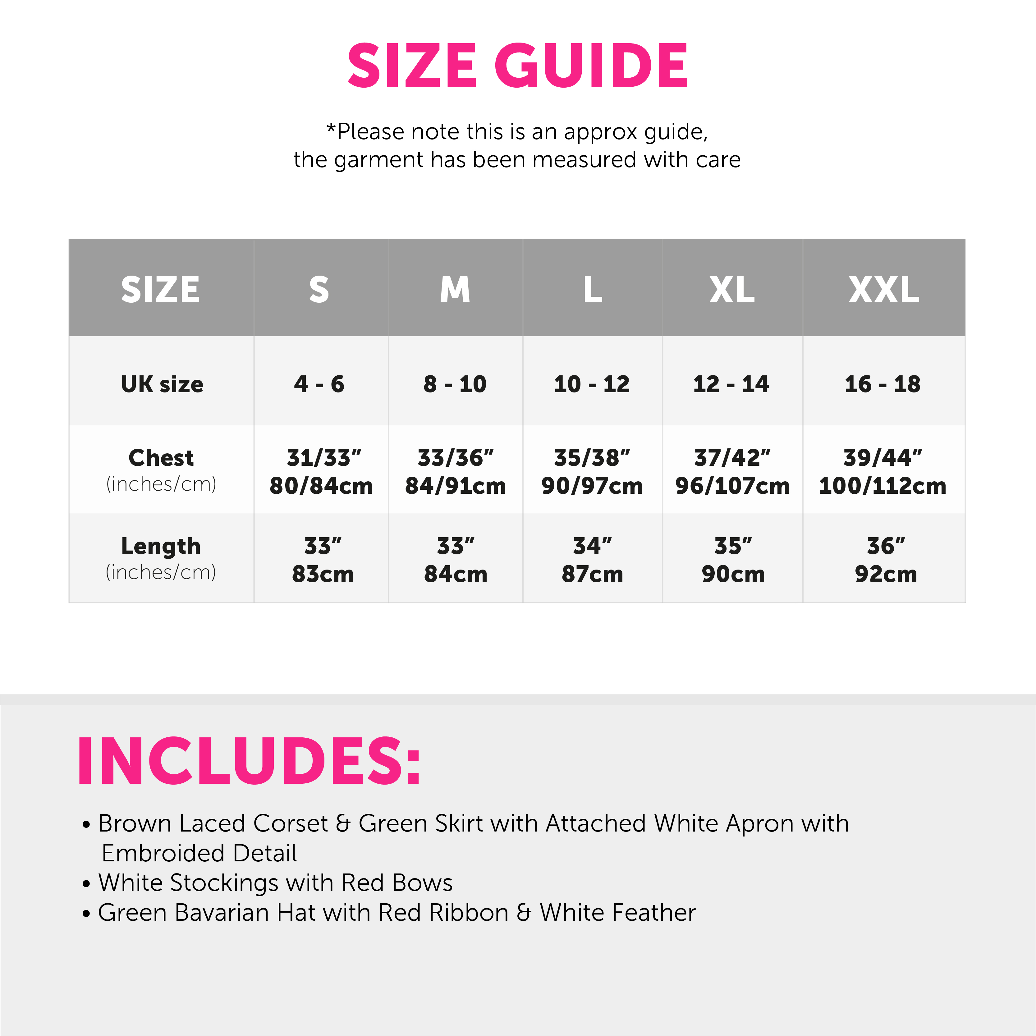 AVAILABLE IN MULTIPLE SIZES: Your Ladies Bavarian Dress Costume is available in multiple sizes from Small to XX-Large: Small (UK 4 - 6) Chest: 31/33” (80/84cm), Length: 33” (83cm) | Medium (UK 8 - 10) Chest: 33/36” (84/91cm), Length: 33” (84cm) | Large (UK 10 - 12) Chest: 35/38” (90/97cm), Length: 34” (87cm) | X-Large (UK 12 - 14) Chest: 37/42” (96/107cm), Length: 35” (90cm) | XX-Large (UK 16 - 18) Chest: 39/44” (100/112cm), Length: 36” (92cm)