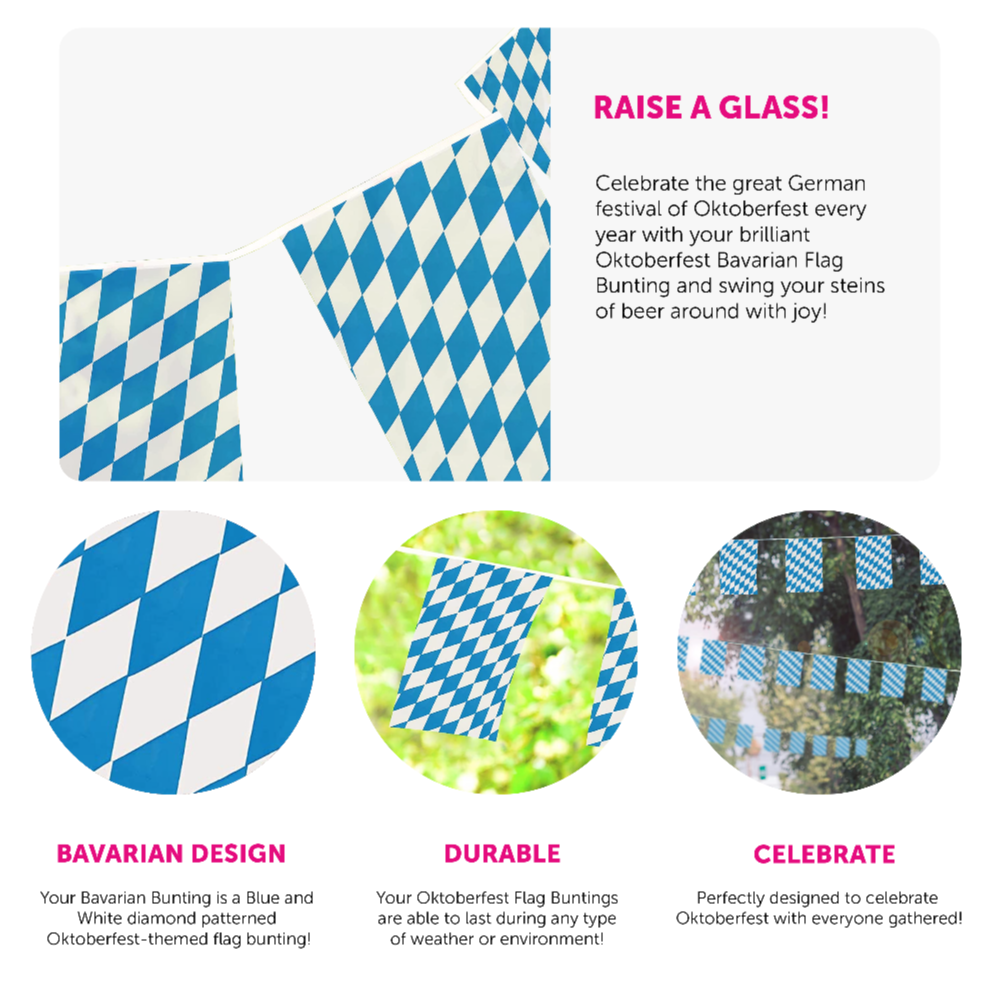 PERFECT FOR OKTOBERFEST AND GERMAN THEMED PARTIES: Whether you’re enjoying a German Themed Party, or celebrating Oktoberfest with your friends and family, our Oktoberfest Bavarian Flag Bunting is the perfect accessory for the occasion!