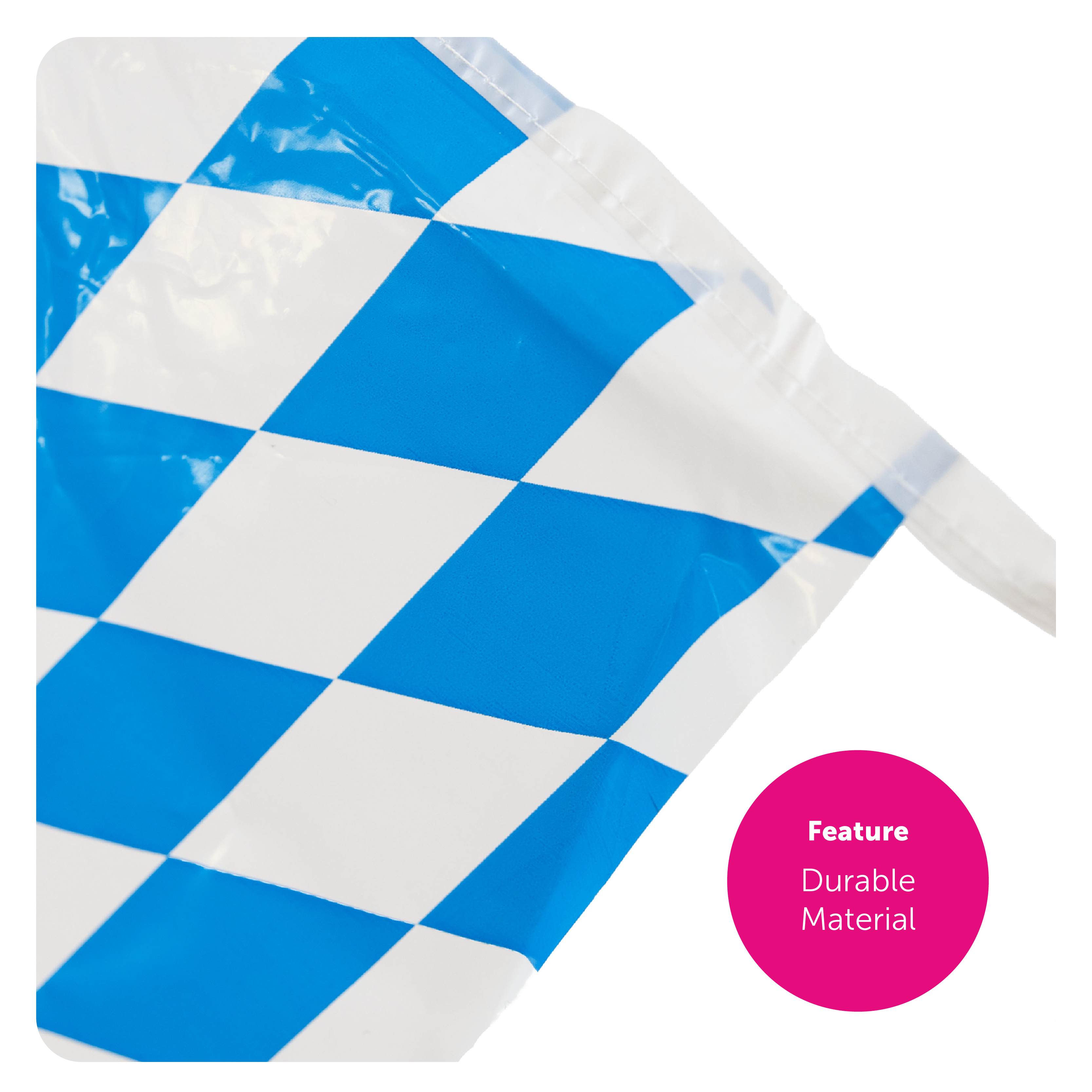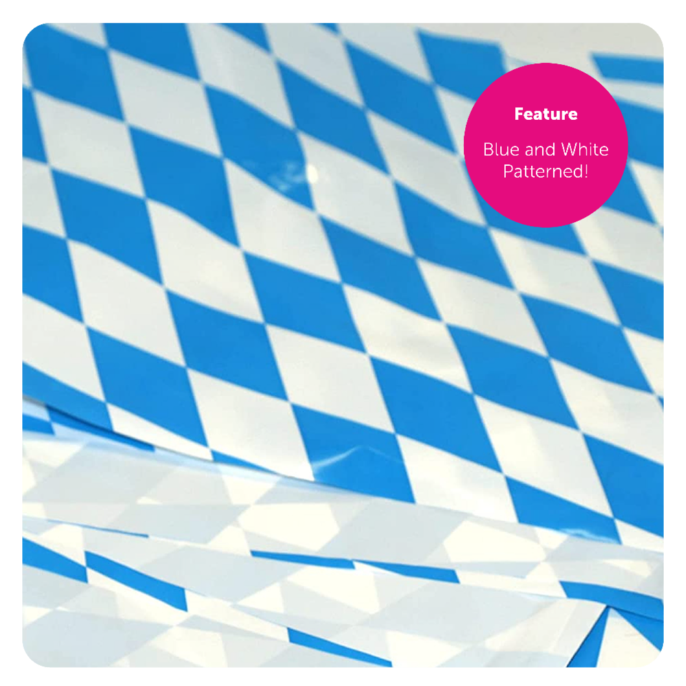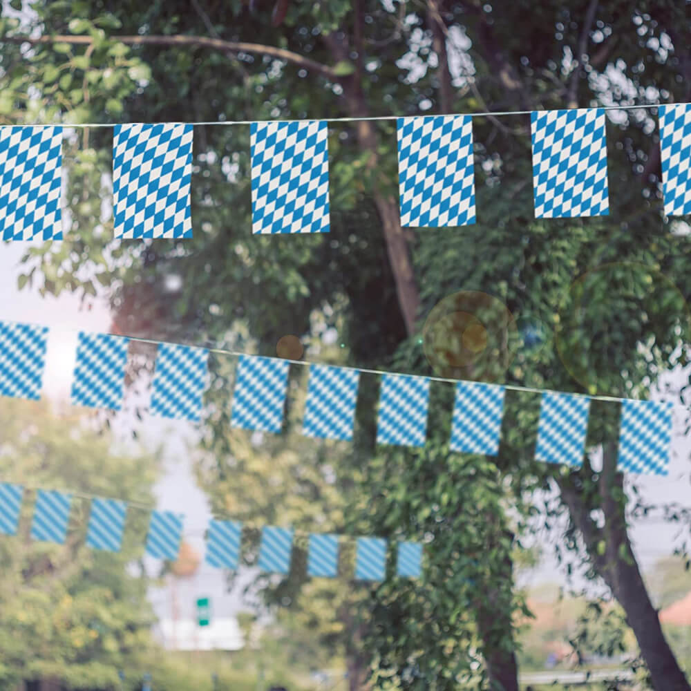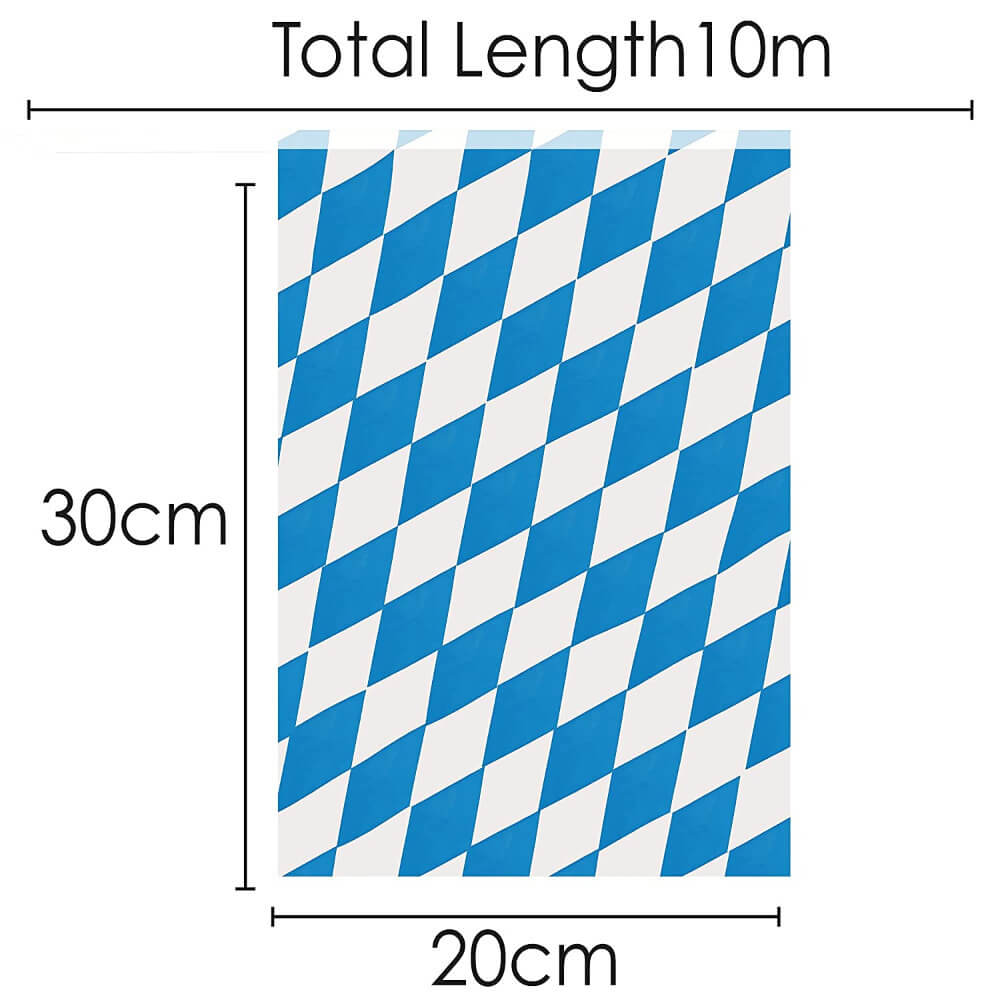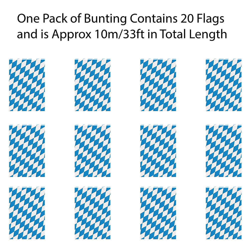 BAVARIAN BUNTING DETAILS: Your Bavarian Bunting is a Blue and White diamond patterned Oktoberfest-themed flag bunting, with the flag bunting measurements 30cm/12” x 20cm/8” for each individual flag, 10m/33ft long – 20 Flags per bunting length!