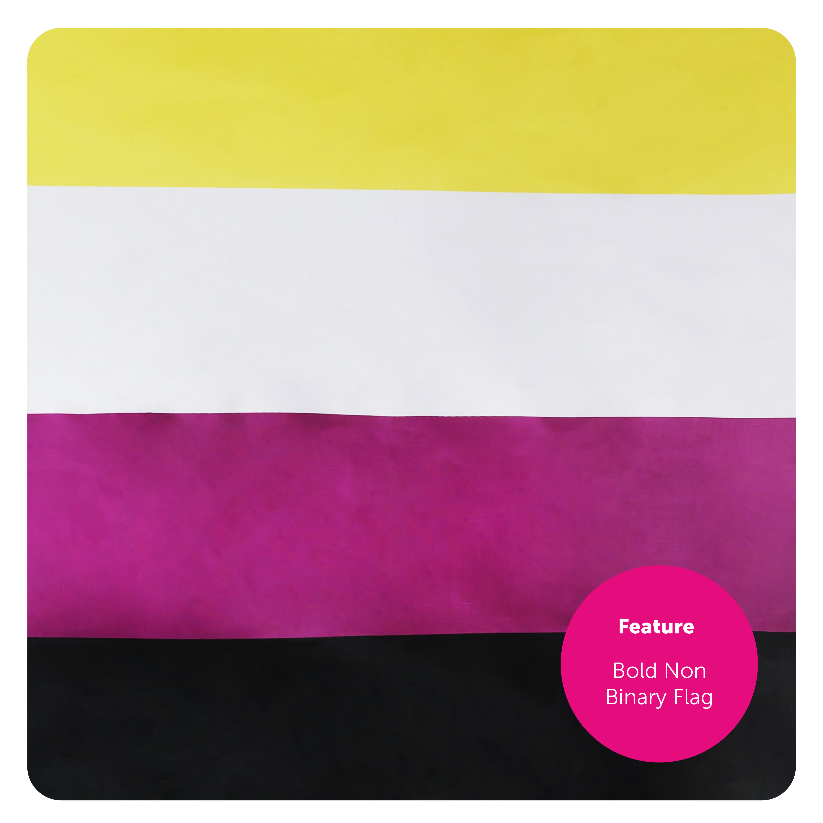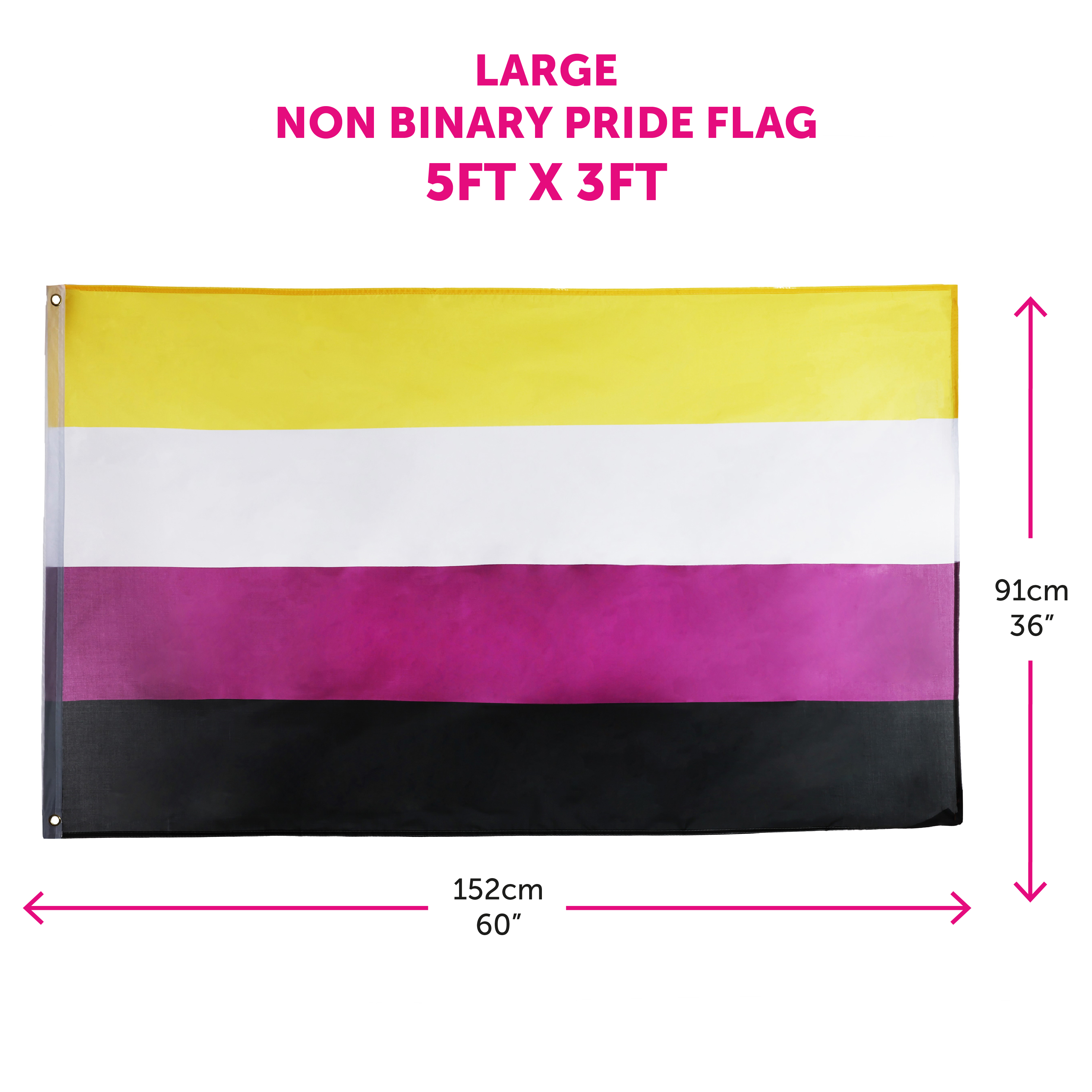 LARGE 5FT X 3FT NON BINARY FLAG: Set yourself free and show Pride for who you are at any event with our Non Binary Flag! Measuring in at 5ft x 3ft – this flag has you covered and will be all you’ll need to show your support at all Pride events!