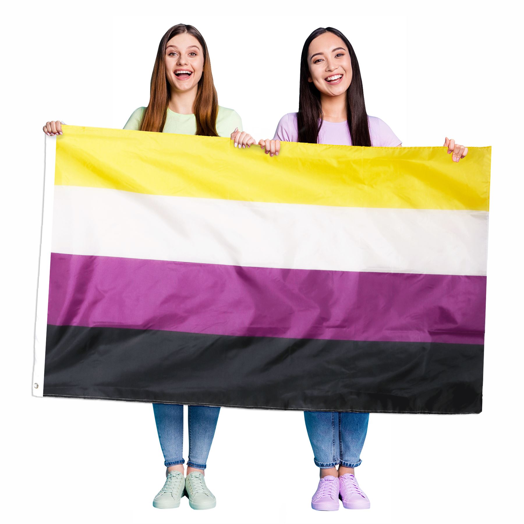 FLAG DETAILS: This Non Binary Flag has 4 horizontal stripes of Yellow, White, Purple/Pink and Black, the Flag measures 5ft (152cm/59.5") in Width and 3ft (91cm/36") in Height, you'll have the perfect flag accessory to fly high for any Pride event!