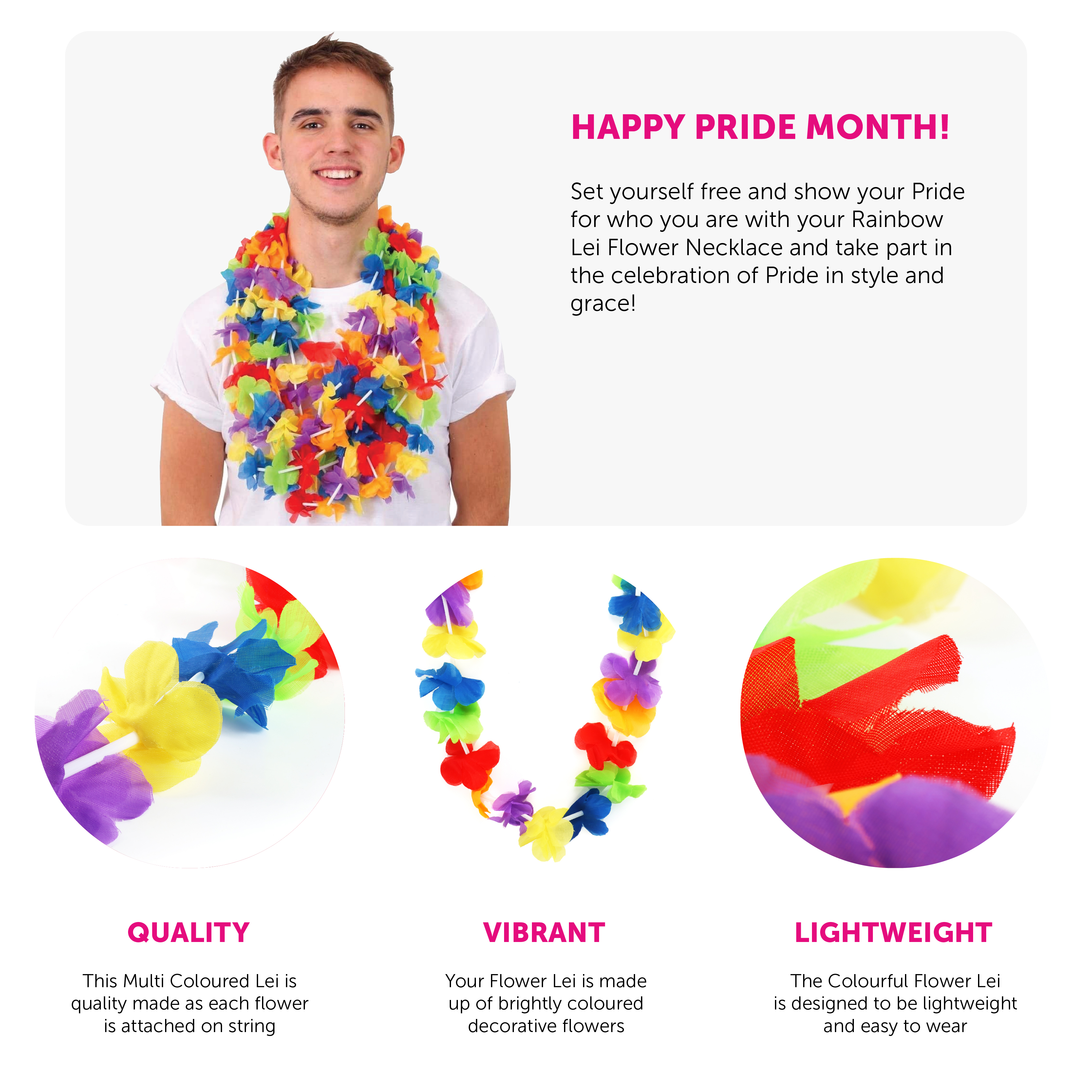LEI MEASUREMENT: Your Rainbow Lei Flower Necklace is an approximate length of 56cm/22", this size makes it suitable for most to wear comfortably at any summer themed party and Pride events!
