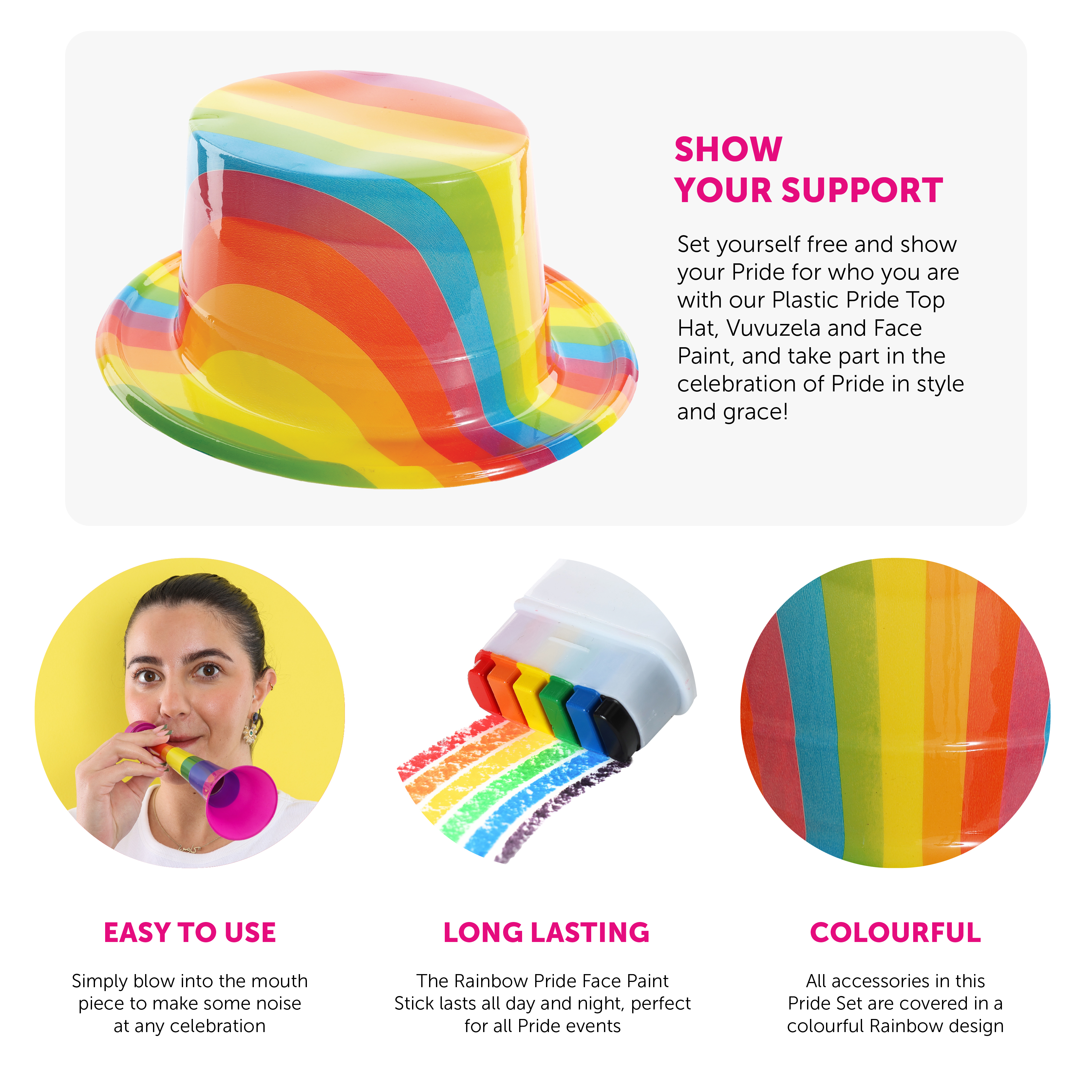 PERFECT FOR PRIDE & SUMMER EVENTS: Whether you’re celebrating LGBTQ+ Pride at public parades and parties or for other events, make sure you're picking up our Plastic Pride Top Hat, Vuvuzela and Face Paint for a Summer of support and celebration alongside family and friends!