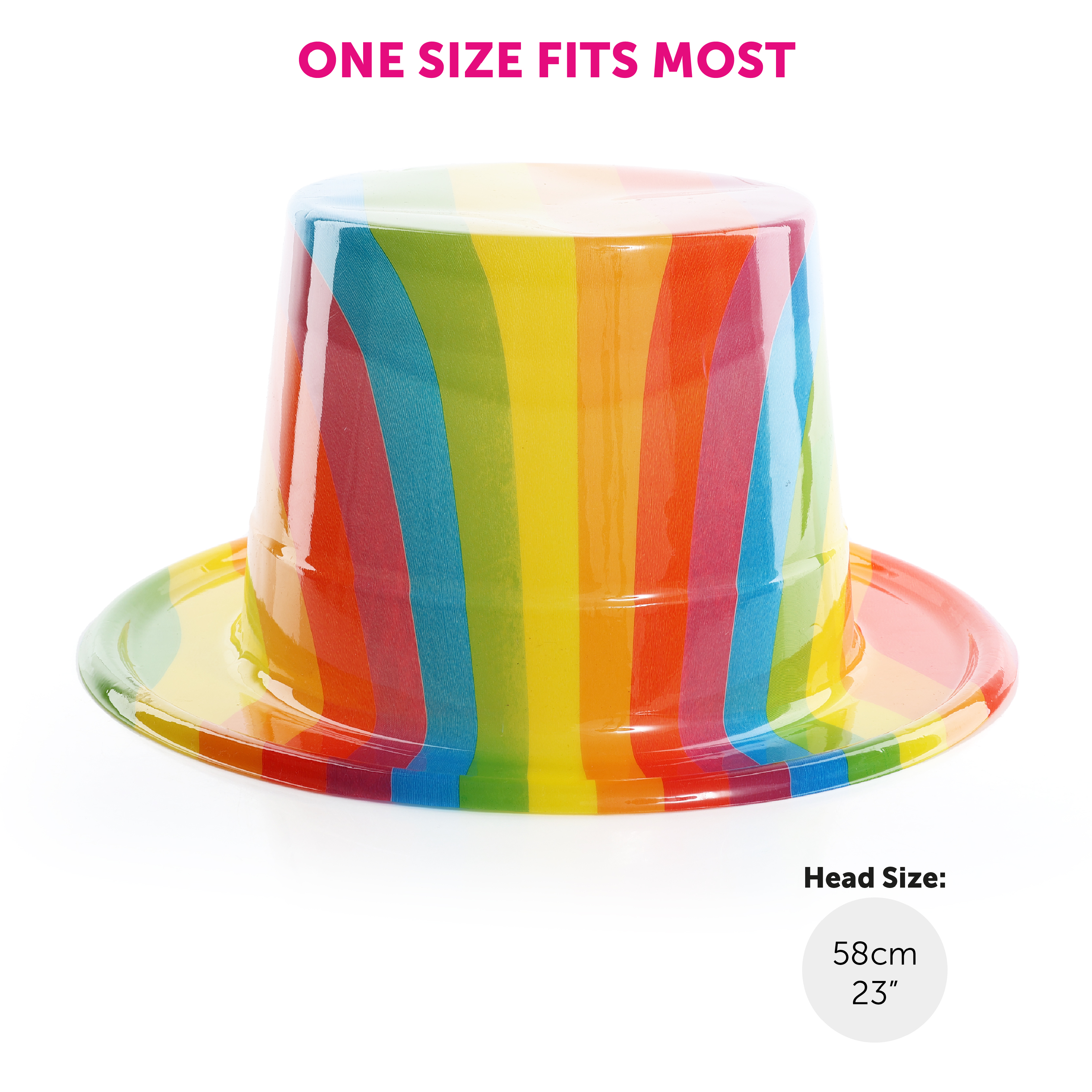 ONE SIZE FITS MOST: The Plastic Rainbow Top Hat is one size, designed to suitably fit most Adults comfortably with a head size of 58cm (23"), the perfect look for any Pride event!